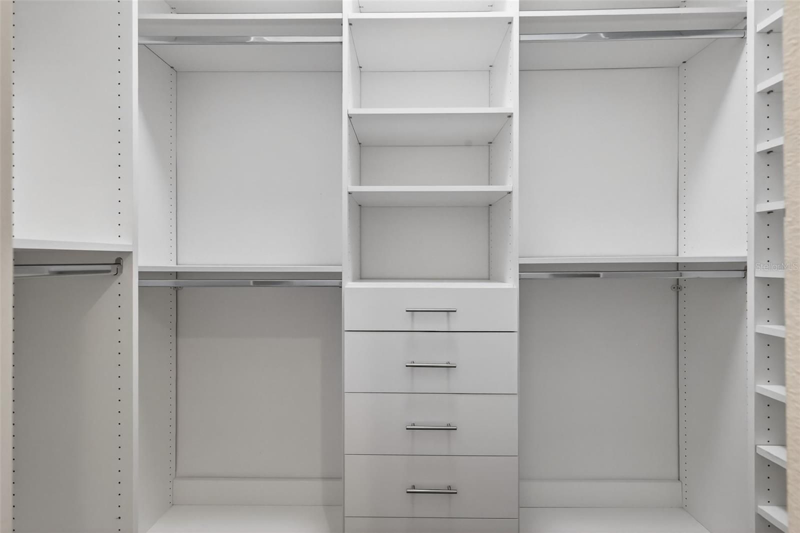 - Accessibility Features, Ceiling Fan(s), Eat-in Kitchen, High Ceilings, In-Wall Pest Control, Living/Dining Room, Open Floorplan, Main Level Primary, Solid Surface Counters, Solid-Wood Cabinets, Split Bedrooms, Stone Counters, Thermostat, Tray Ceiling(s), Walk-In Closet(s), Window Treatments