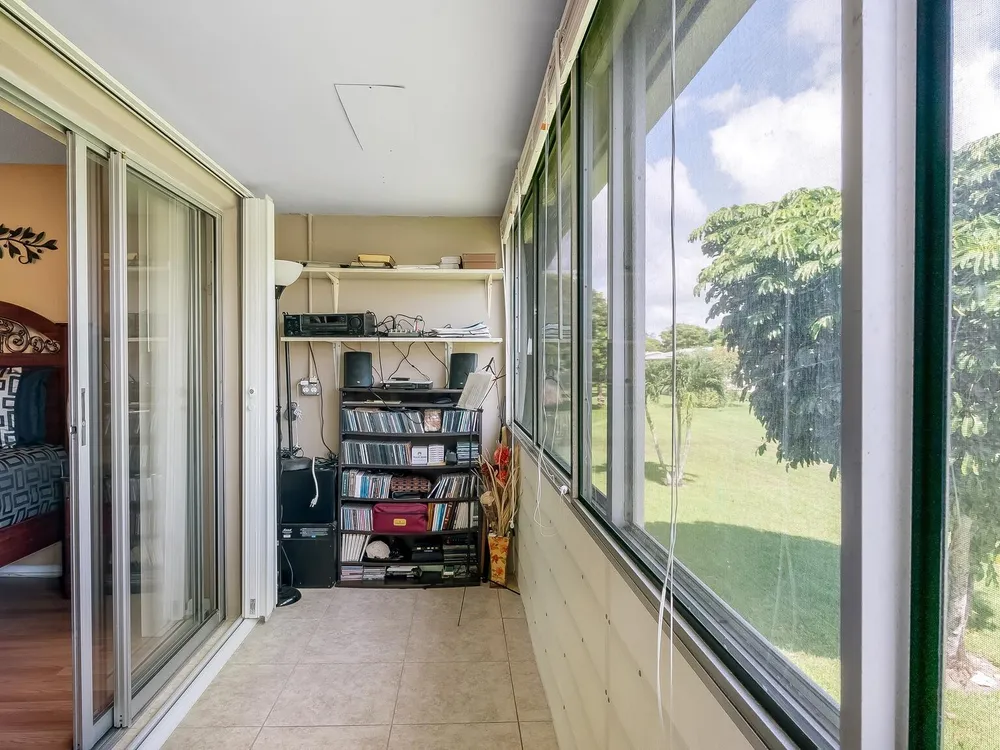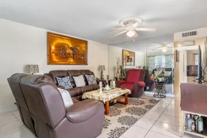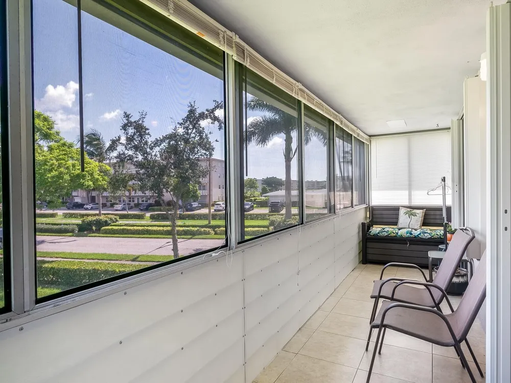 2 Bedroom, 1.5 Bathroom second-floor condo in Century Village, a 55+ community. Features include a new roof (2022), updated bathroom, accordion shutters, and a private balcony with a scenic view. The unit offers a spacious layout with ample natural light. Community amenities include a pool, fitness center, clubhouse, and more. Conveniently located near shopping, dining, and entertainment.