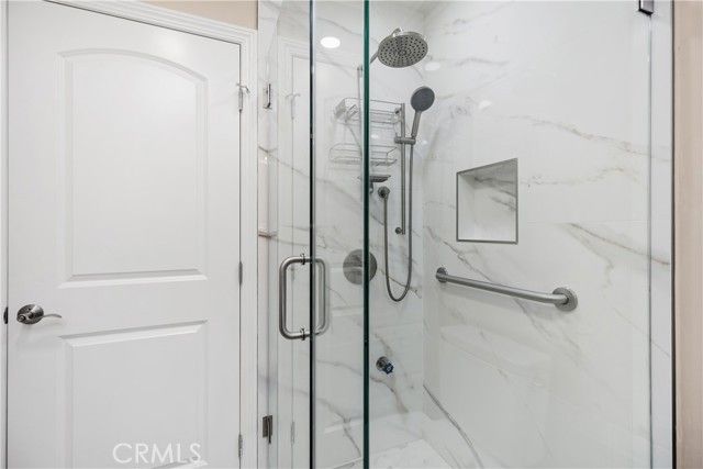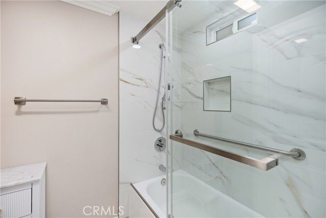 YOU WILL NOT WANT TO MISS THIS BEAUTIFULLY REMODELED "GARDEN VILLA" MODEL IN EVERY WAY POSSIBLE OVERLOOKING THE GOLF COURSE! Spacious 2-bed, 2-bath with elevator access and prime fairway views. The open-concept great room showcases walls of dual-pane windows, a sleek slab-surround electric fireplace, crown molding, recessed LED lighting, and wide-plank luxury vinyl floors throughout. Cleverly tucked behind the electric fireplace is a large storage room perfect for luggage, holiday bins, hobbies, and bulk supplies. Two large sliders lead to an expansive covered balcony finished with tile, ideal for entertaining, morning coffee, and taking in the sweeping golf panorama. The chef’s kitchen stands out with white soft-close cabinetry, quartz countertops, a subway tile backsplash, stainless steel appliances, a deep single-bowl sink with a pull-down faucet, abundant storage, including a frosted-glass pantry door, and a serving peninsula for casual meals and entertaining. The living room separates the two spacious bedrooms for excellent privacy. The serene primary suite features a whole wall of frosted-panel closets, a ceiling fan, and a luxuriously remodeled bath with a quartz vanity, a framed LED mirror, and a tub and shower with designer large-format tile and a glass enclosure. The guest bedroom is generously sized for visitors or a home office, and the adjacent guest bath features a quartz-top vanity, a framed LED mirror, and a beautiful walk-in shower with a niche and a grab bar. Additional upgrades include crown molding throughout, modern interior doors and hardware, energy-efficient ductless mini-split heating and cooling, contemporary roller shades, and dual-pane windows for comfort and quiet. Garden Villa buildings provide under-building parking, a convenient mail room, laundry on each floor, and elevator service. All of this is inside Laguna Woods Village, just minutes from Laguna Beach, with exceptional amenities that include a 27 hole championship golf course and a nine hole executive course, tennis, pickleball, two fitness centers, seven clubhouses, five pools, an equestrian center, garden plots, multiple arts and crafts studios in the renowned Clubhouse 4, more than 200 clubs, free community bus service, and economical RV storage. Welcome home to resort-style living every day. Free community bus service to nearby shopping, approx. 6 miles from beautiful Laguna Beach. The best hidden secret in Orange County.SEE 3D TOUR and VIDEO