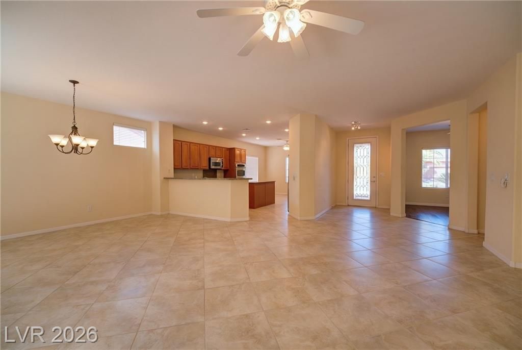 Tucked near the end of a quiet cul-de-sac with trailhead access steps away, this single-story Contemporary Southwestern home is equal parts sanctuary and sophistication. Low tile rooflines, warm stucco, and a xeriscaped yard with a duo of palms frame mountain views.A glass-inset entry opens to a flex room with dark hardwoods — office, studio, or library. The open living and dining area sits beneath a five-light chandelier, washed in light from oversized windows and a patio slider.The kitchen is built for intentional cooks: wood cabinetry with pull-outs, gold-and-black granite, center island, breakfast bar, and a full GE Profile stainless suite with gas cooktop, plus a sunlit nook.The primary suite offers hardwoods, patio access, U-shaped walk-in closet, oval soaking tub, glass shower, and double vanity. Out back: covered patio, flagstone paths, mature greenery. A smart hallway links guest bed, bath, and laundry with garage access.