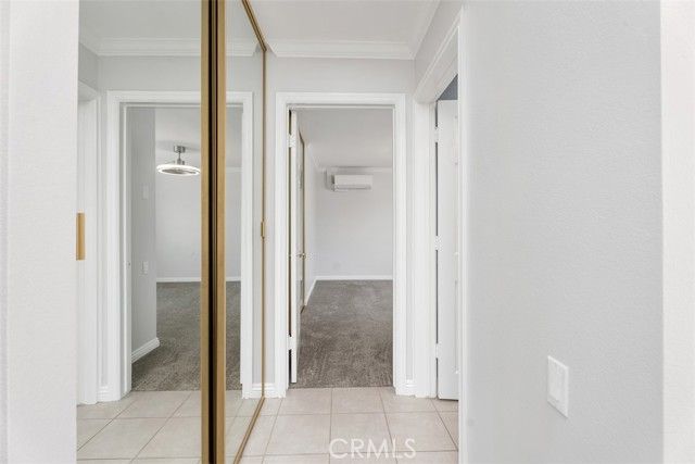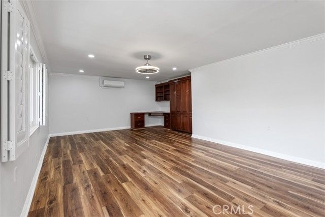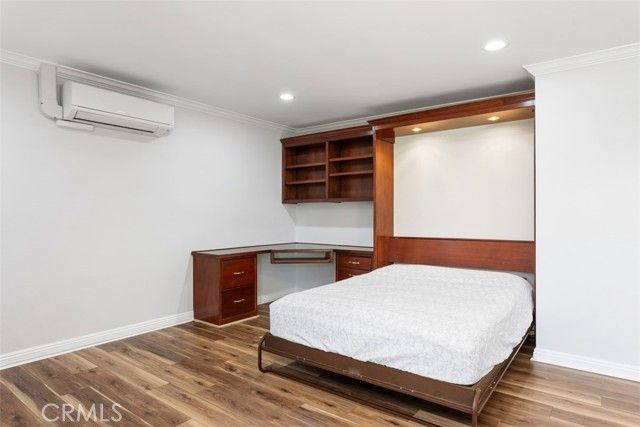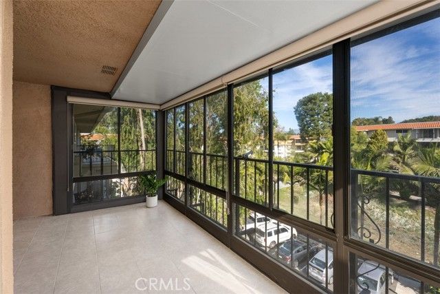 This charming top-floor one-bedroom Garden Villa is ideally located adjacent to the golf course, just moments from the fairways, offering the perfect blend of space, comfort, and resort-style living. The home features a very spacious living and dining area and a well-designed galley kitchen. The living room is so generously sized that it easily accommodates a built-in desk and a Murphy bed, making it wonderfully versatile. Both the living room and bedroom are equipped with mini-split-system A/C units, along with smooth ceilings, elegant crown molding, recessed lighting, and new low-profile ceiling fans. The kitchen's granite countertops, high-end stainless steel finish appliances, and recessed lighting add a touch of sophistication. The glass-enclosed, large balcony provides an additional living space (not counted in assessor square footage) to relax and enjoy coastal breezes and tranquil views of the lush, park-like setting. The bathroom features a newer walk-in jetted tub-perfect for relaxing and unwinding after an active day enjoying all the fun activities Laguna Woods has to offer. The subterranean garage parking space is conveniently located near the elevator, providing easy access to the third floor. There is extra storage and a shared electrical outlet convenient to the pa