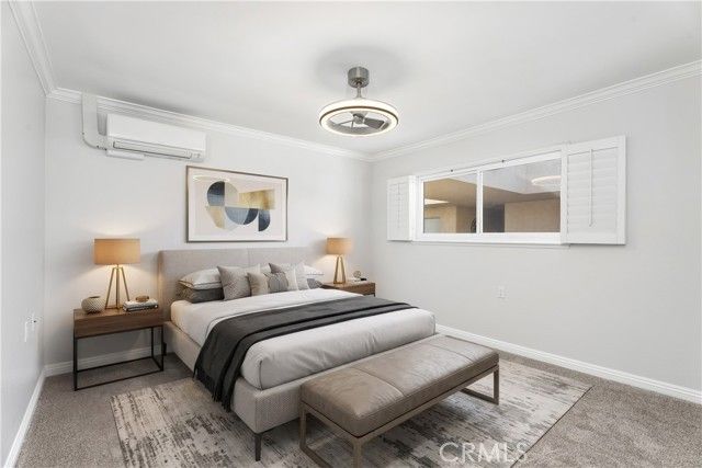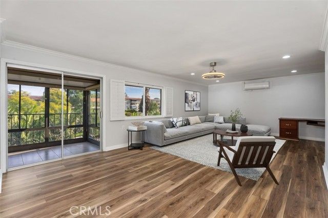 This charming top-floor one-bedroom Garden Villa is ideally located adjacent to the golf course, just moments from the fairways, offering the perfect blend of space, comfort, and resort-style living. The home features a very spacious living and dining area and a well-designed galley kitchen. The living room is so generously sized that it easily accommodates a built-in desk and a Murphy bed, making it wonderfully versatile. Both the living room and bedroom are equipped with mini-split-system A/C units, along with smooth ceilings, elegant crown molding, recessed lighting, and new low-profile ceiling fans. The kitchen's granite countertops, high-end stainless steel finish appliances, and recessed lighting add a touch of sophistication. The glass-enclosed, large balcony provides an additional living space (not counted in assessor square footage) to relax and enjoy coastal breezes and tranquil views of the lush, park-like setting. The bathroom features a newer walk-in jetted tub—perfect for relaxing and unwinding after an active day enjoying all the fun activities Laguna Woods has to offer. The subterranean garage parking space is conveniently located near the elevator, providing easy access to the third floor. There is extra storage and a shared electrical outlet convenient to the parking spot for golf cart charging. A short golf cart ride or easy stroll takes you to Clubhouse 4, home to exceptional arts and crafts facilities—including a carpentry shop, photography studio, sewing center, lapidary, ceramics studio—as well as a large pool, spa and changing area. Ownership includes access to all the outstanding amenities that make Laguna Woods Village one of the most sought-after senior golf communities in the country. Enjoy two beautiful golf courses (a 27-hole championship course and a 9-hole par-3 course), along with five swimming pools, seven clubhouses, three fitness centers, over 200 social clubs, a performing arts theater, tennis and pickleball courts, equestrian trails, table tennis, lawn bowling, bocce ball, golf cart paths, fare-free bus service, and 24-hour guarded gates. All of this is conveniently located near Laguna Beach, shopping, medical services, hospitals, and the 5 Freeway. This is your opportunity to own a piece of sunny South Orange County living in a vibrant golf-course community.