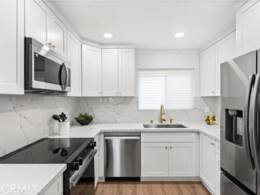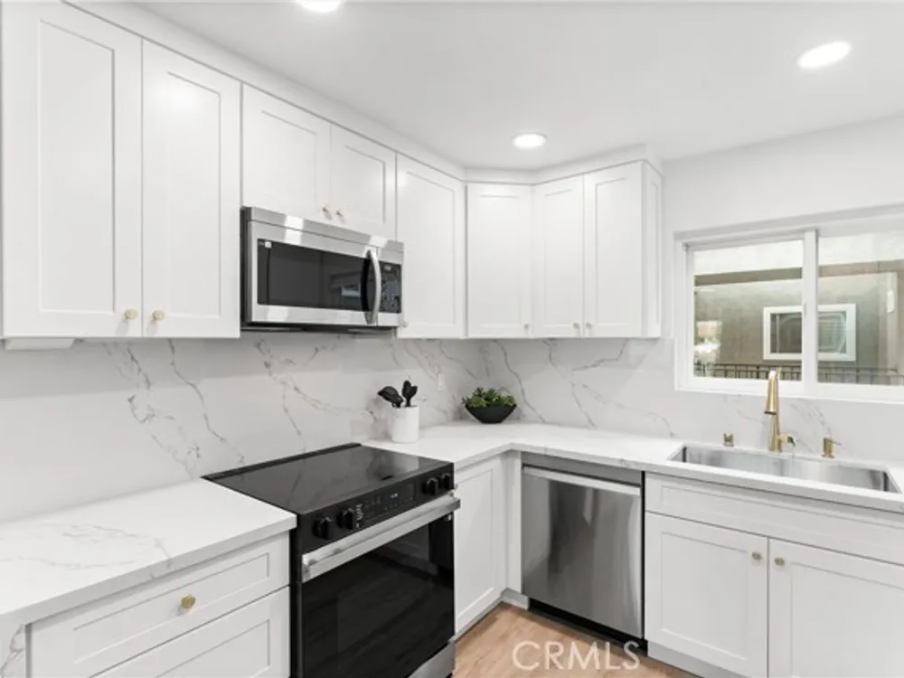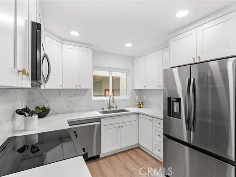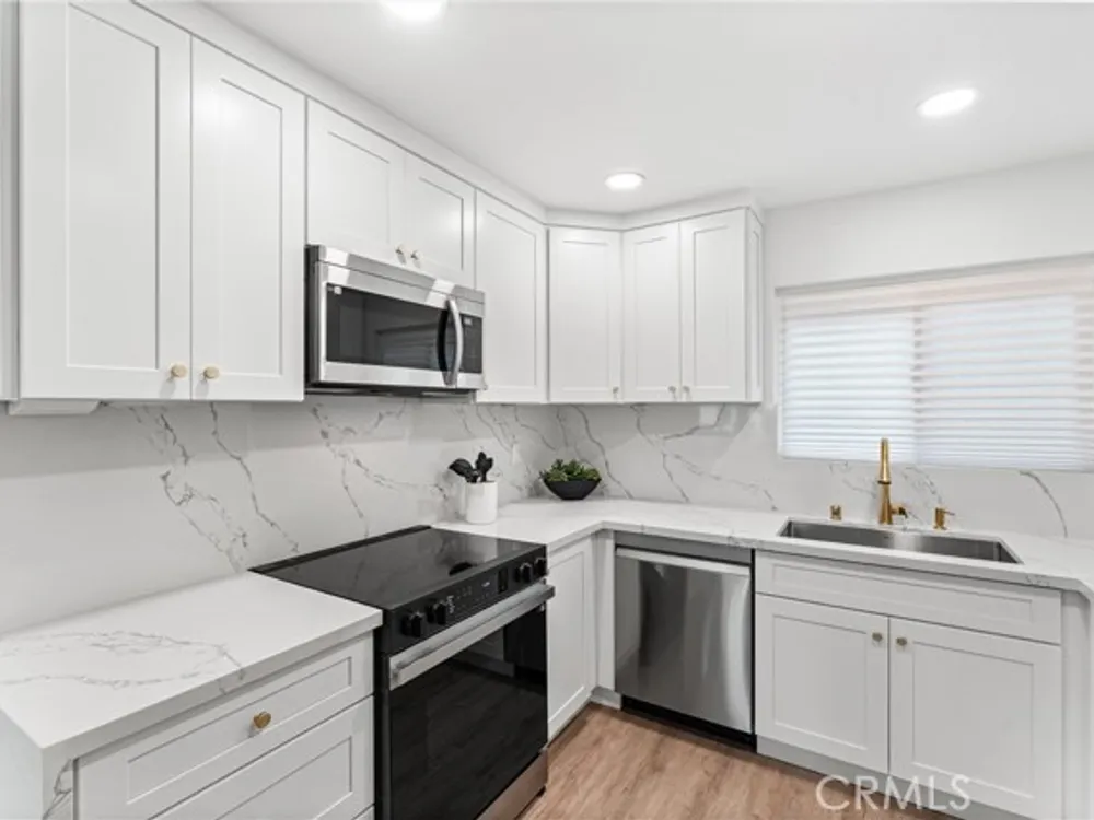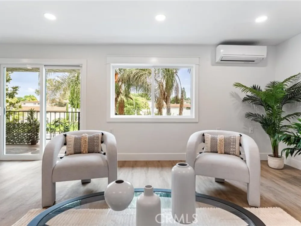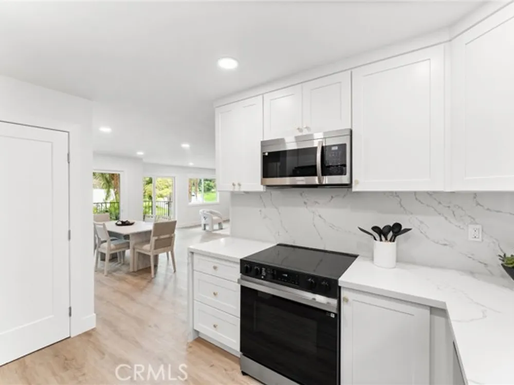 Experience luxury and comfort in this fully remodeled 2BD/2BA, 1,199 sq ft Garden Villa condo in the heart of Laguna Woods Village! Located in a Tri-level building with elevator access and subterranean parking, this single-level unit features a modern split-bedroom layout, each with its own new mini-split HVAC system. The designer kitchen impresses with quartz countertops, waterfall island, full quartz backsplash, custom soft-close shaker cabinets, under-cabinet and recessed lighting, and bespoke Samsung stainless appliances. Enjoy tranquil mountain and magnolia tree views from the private balcony or through brand-new Milgard windows and doors. Bathrooms include a spa-like walk-in shower and a luxurious Jacuzzi soaking tub—plus upgraded vanities and Toto toilets. Additional highlights: luxury vinyl plank flooring throughout, smooth ceilings, new Bradford White water heater, and fully permitted upgrades. Steps from Clubhouse 4 with world-class amenities. Resort-style 55+ living!
