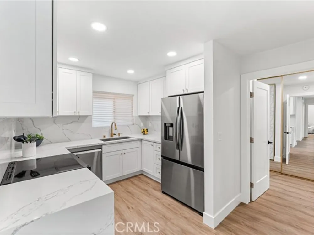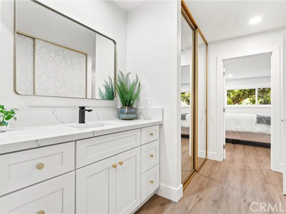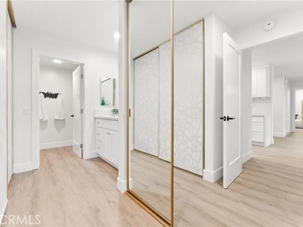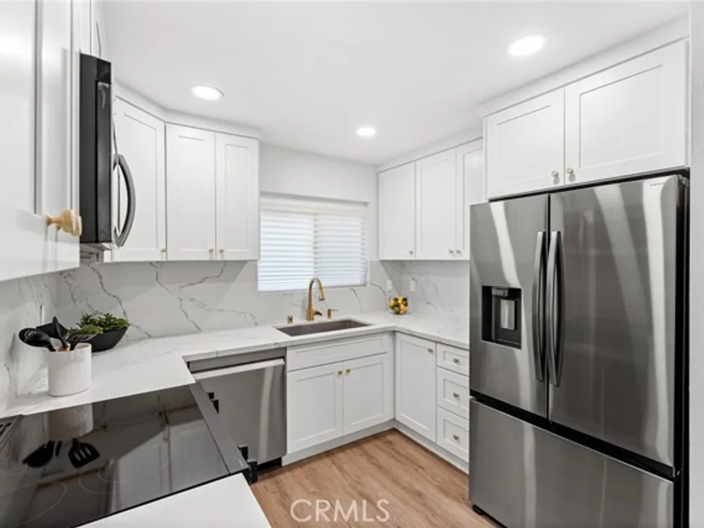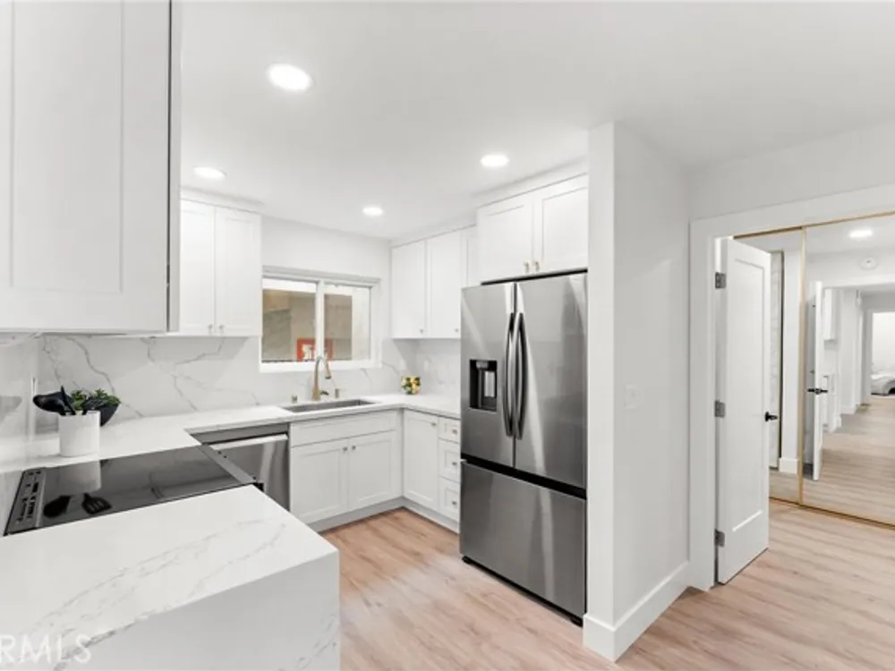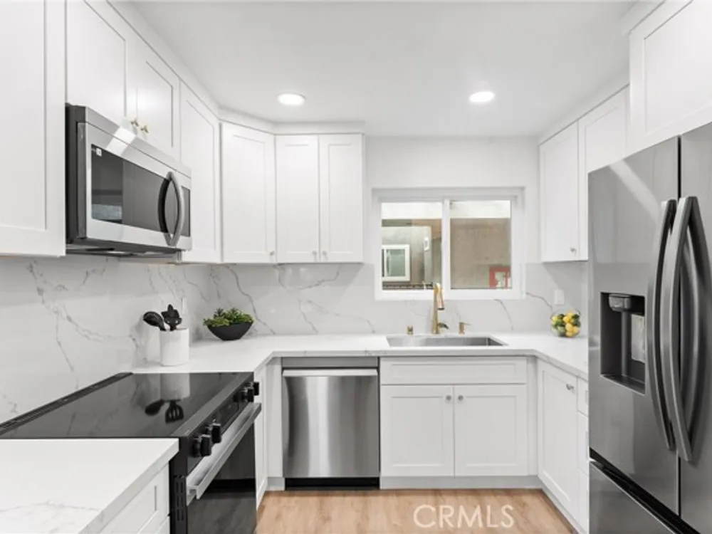 Experience luxury and comfort in this fully remodeled 2BD/2BA, 1,199 sq ft Garden Villa condo in the heart of Laguna Woods Village! Located in a Tri-level building with elevator access and subterranean parking, this single-level unit features a modern split-bedroom layout, each with its own new mini-split HVAC system. The designer kitchen impresses with quartz countertops, waterfall island, full quartz backsplash, custom soft-close shaker cabinets, under-cabinet and recessed lighting, and bespoke Samsung stainless appliances. Enjoy tranquil mountain and magnolia tree views from the private balcony or through brand-new Milgard windows and doors. Bathrooms include a spa-like walk-in shower and a luxurious Jacuzzi soaking tub—plus upgraded vanities and Toto toilets. Additional highlights: luxury vinyl plank flooring throughout, smooth ceilings, new Bradford White water heater, and fully permitted upgrades. Steps from Clubhouse 4 with world-class amenities. Resort-style 55+ living!