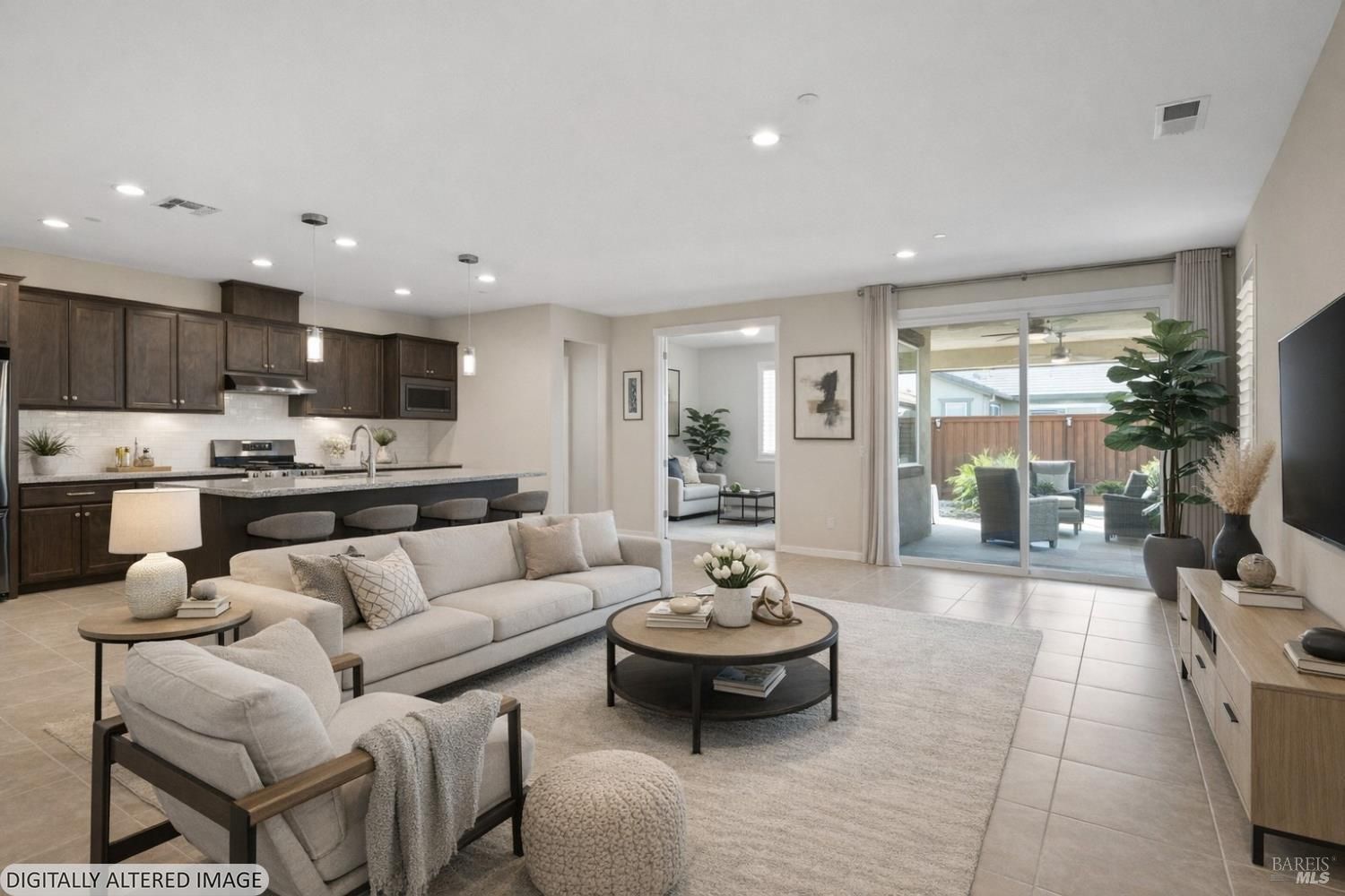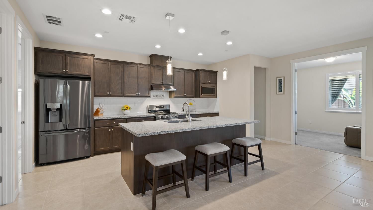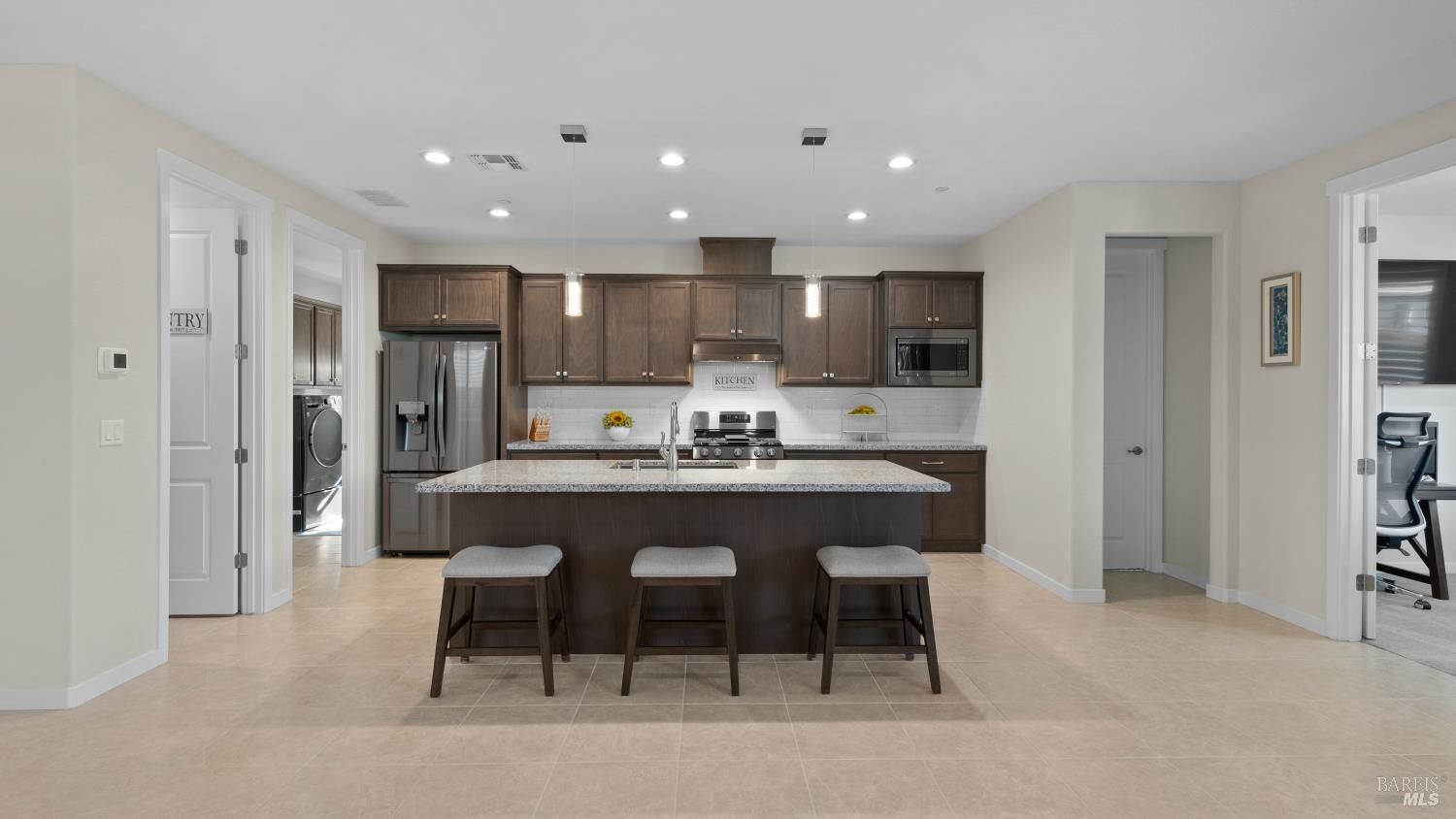 Welcome to 2395 Front Porch a 55+ community of Summit at Liberty in Rio Vista! Beautifully maintained, single-story home built in 2022 that truly shows like new. Offering 1,569 square feet, this residence features two bedrooms, two full bathrooms, a dedicated office, and a spacious indoor laundry room with ample cabinetry for storage. With new construction continuing throughout the area, why wait to build when you can move right into a home that already includes valuable upgrades? The kitchen showcases granite countertops, rich dark cabinetry, stainless steel appliances, and excellent storage with a large pantry. Tile flooring runs throughout the main living areas, while the bedrooms are carpeted for added comfort. The spacious primary suite offers a large walk-in closet with custom organizational shelving. The third room is ideal as a functional office or comfortable sitting room, providing flexibility to fit your lifestyle. Additional highlights include fully landscaped front and back yards, a fully finished garage that is sheetrocked and painted, and a Tesla charging station. Enjoy the owned solar system, delivering energy efficiency and long-term savings.