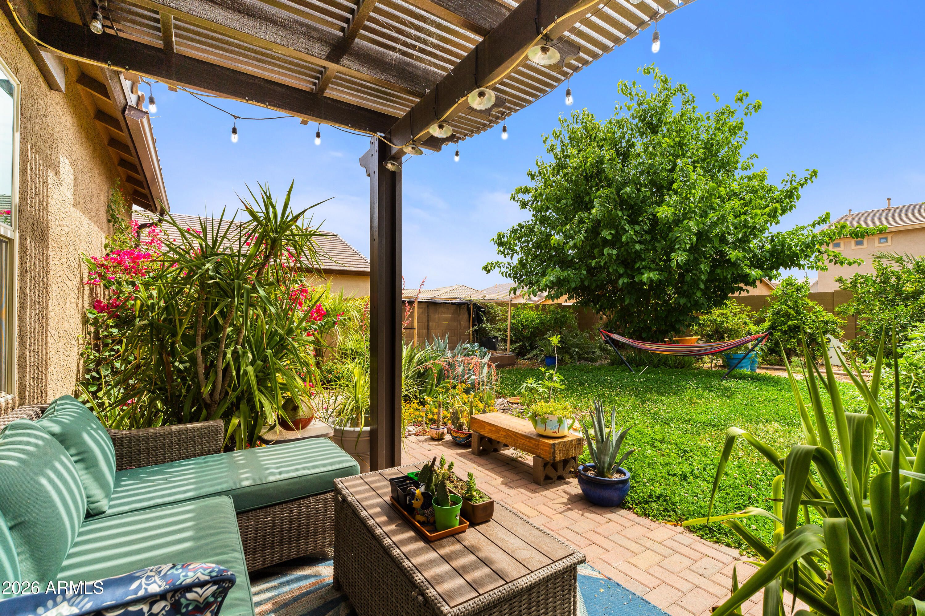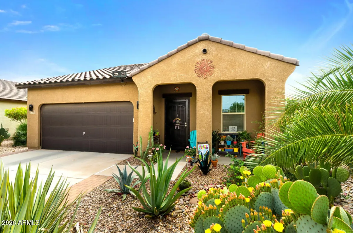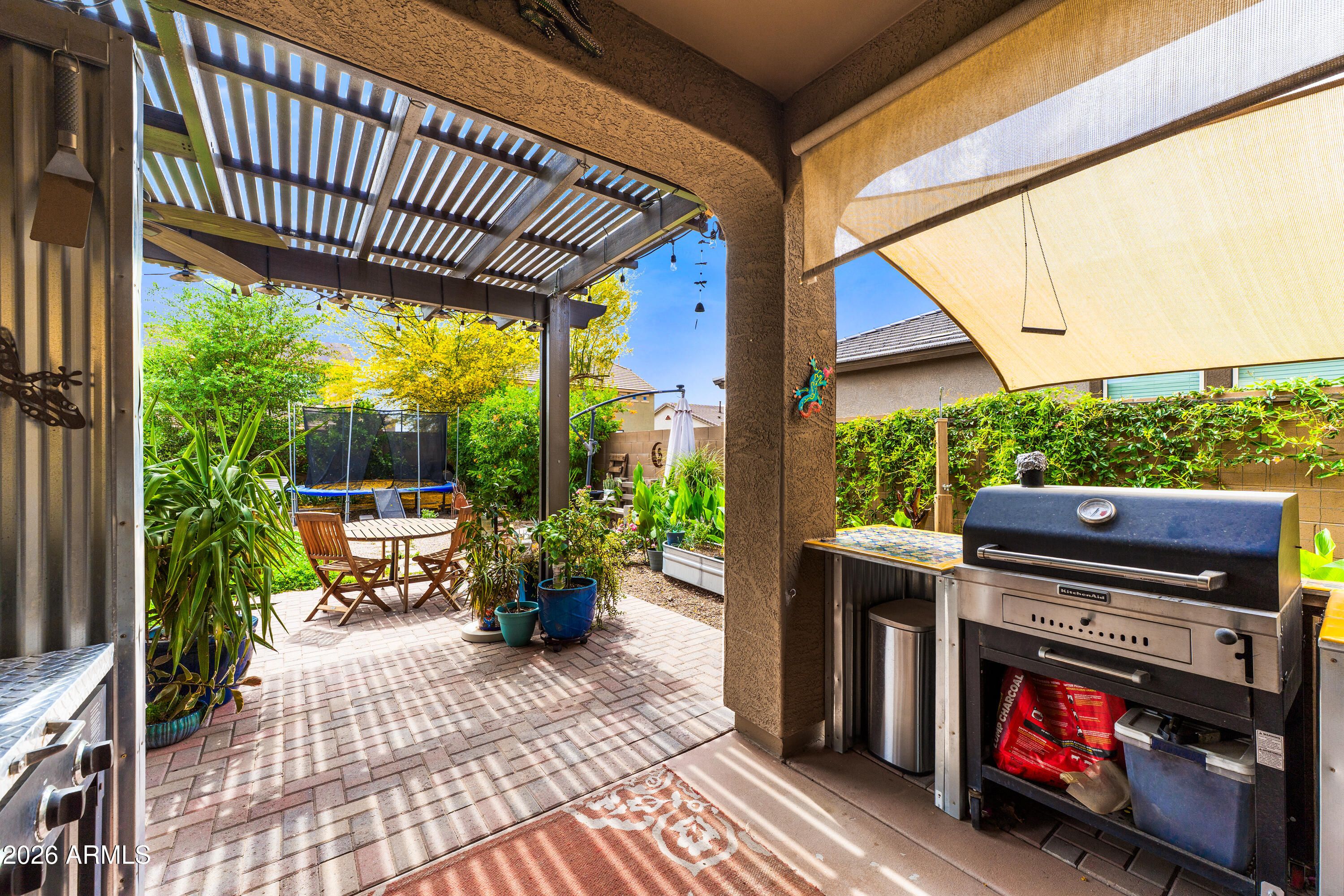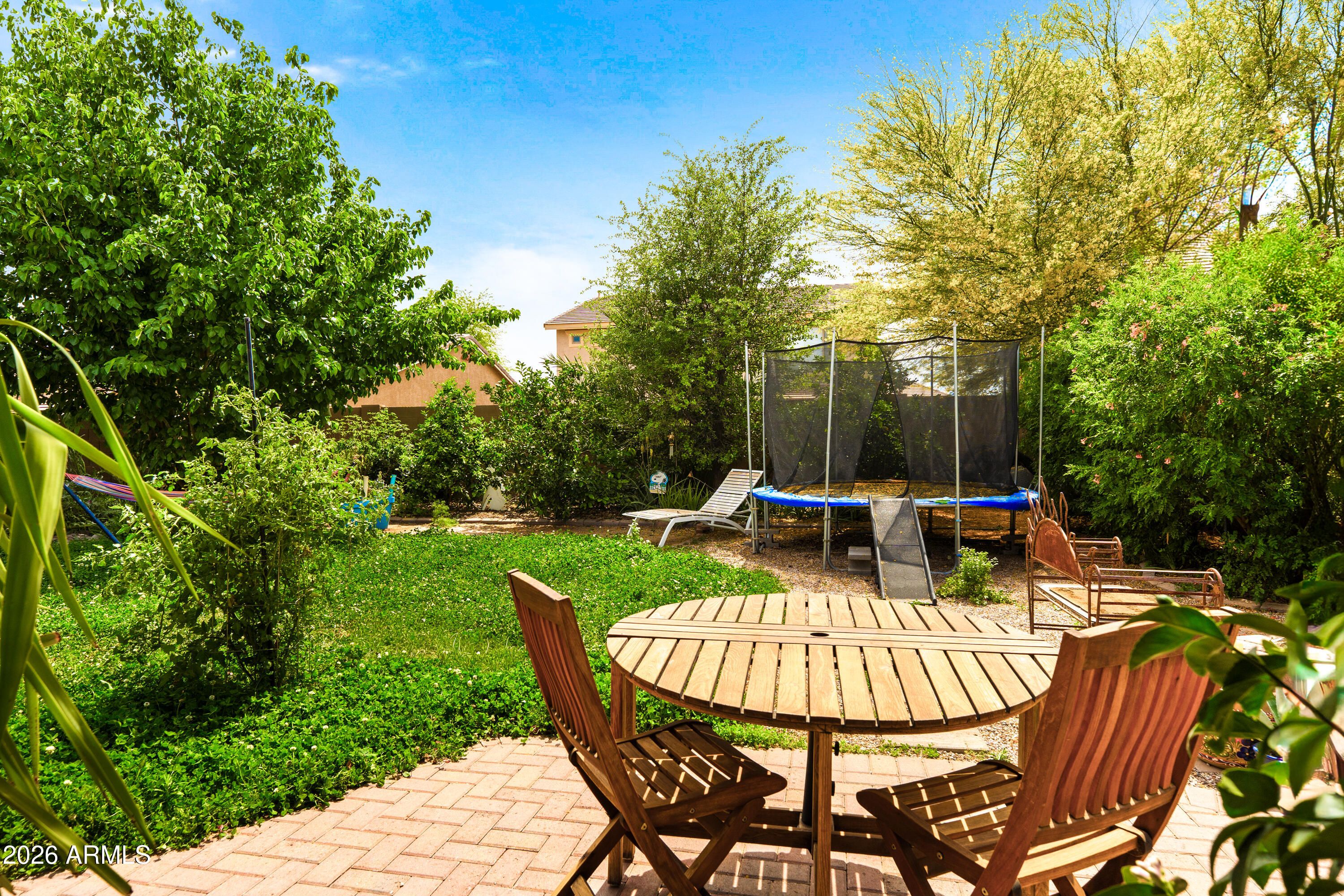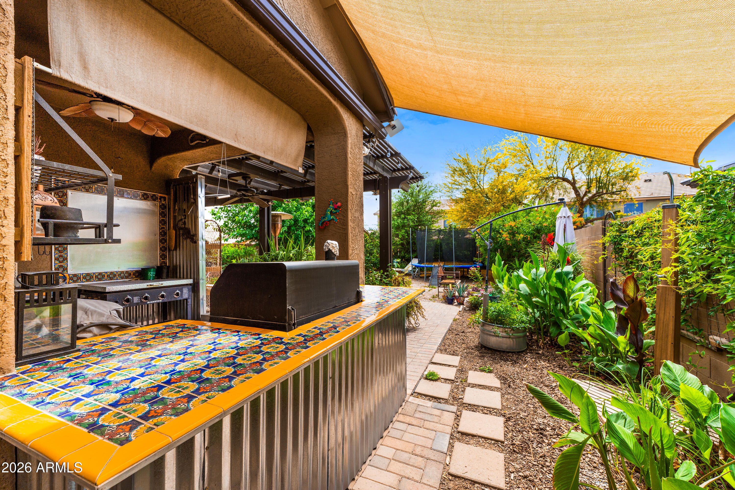 Welcome to your dream home in the highly sought-after, family-friendly community of Mission Royale 2! This NEARLY NEW 3-bedroom, 2-bathroom home is packed with thoughtful upgrades and move-in-ready convenience. From the moment you arrive, you'll notice the beautifully landscaped front and rear yards, complete w/ EXTENDED PAVER PATIO, pergola, shade sails, and a fully equipped OUTDOOR KITCHEN--perfect for entertaining or relaxing Arizona evenings. Inside, enjoy stylish VINYL PLANK FLOORING, upgraded ceiling fans, and a spacious layout, along with a garage door opener with keypad for added convenience.The kitchen is a true standout, featuring GRANITE SLAB COUNTERTOPS, a FARMHOUSE SINK with disposal, stainless steel appliances (including the fridge), 30-inch espresso cabinets with upgraded CROWN MOLDING, and elegant Televera tile accents. This home also includes incredible extras such as a Whirlpool WASHER AND DRYER, 2-inch faux wood blinds, and even select large furniture pieces that stay--including the COUCH, KITCHEN TABLE SET, and QUEEN-SIZED BED-making this an easy, TURNKEY opportunity. Step outside to your own private oasis with a lush green backyard filled with FRUIT AND VEGETABLE plants, including mandarin, lime, peach, pomegranate, Arizona sweet orange trees, and artichoke plants--plus a TRAMPOLINE INCLUDED for added fun! Energy efficiency is a major bonus with solar panels through Good Earth, keeping your electric bills incredibly low. The Mission Royal 2 community also offers a PRIVATE WATER AND RECREATION PARK featuring a variety of amenities for all ages, including exciting WATER SLIDES and an interactive SPLASH PAD for cooling off and family fun. The park also offers a sand volleyball court and a basketball court for active play and friendly competition. In addition, a spacious SHADED RAMADA provides a comfortable gathering space, perfect for picnics, parties, and social events. Shopping, restaurants, schools and more close by. This home truly has it all--style, savings, and a lifestyle you'll love! COME SEE IT TODAY!!