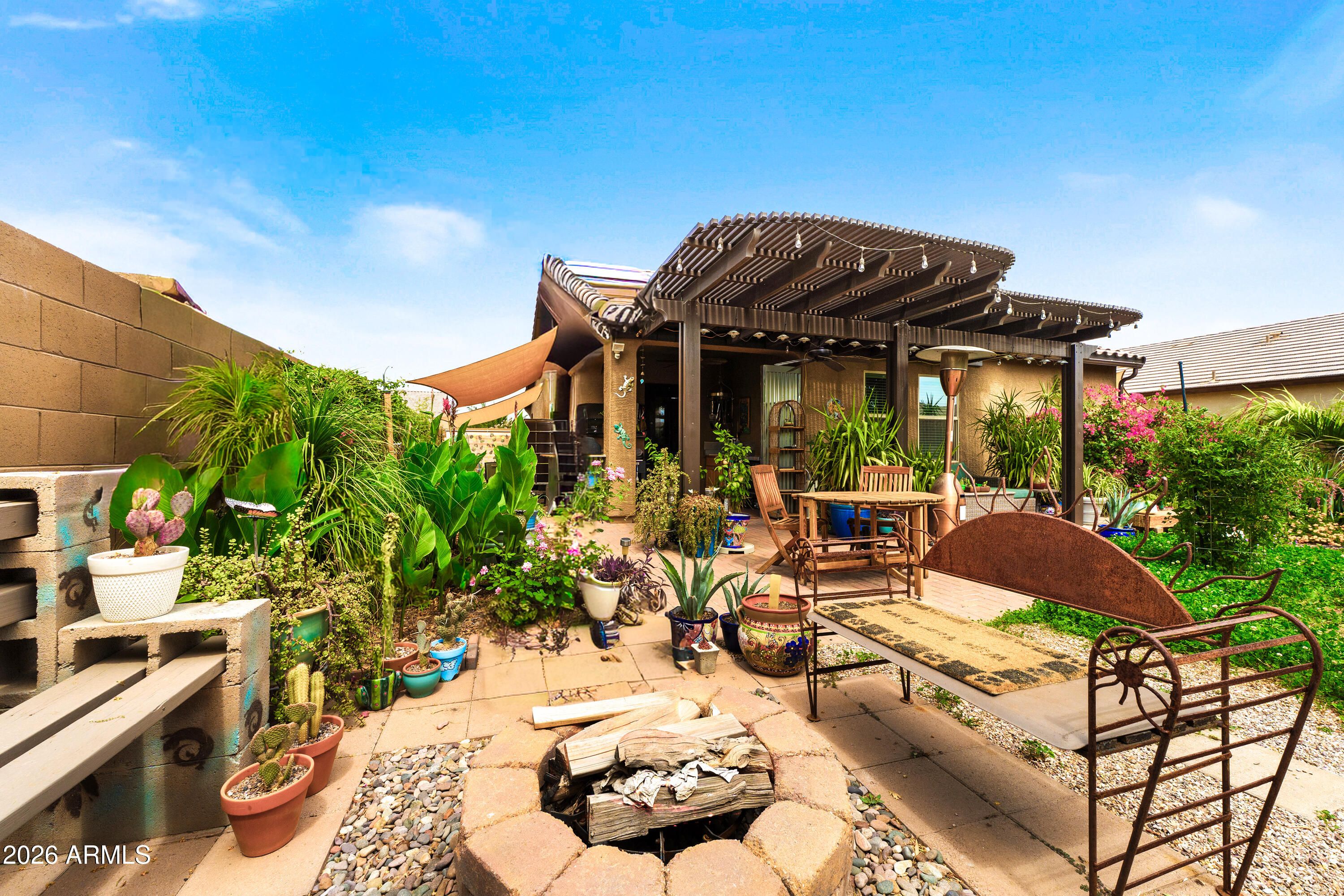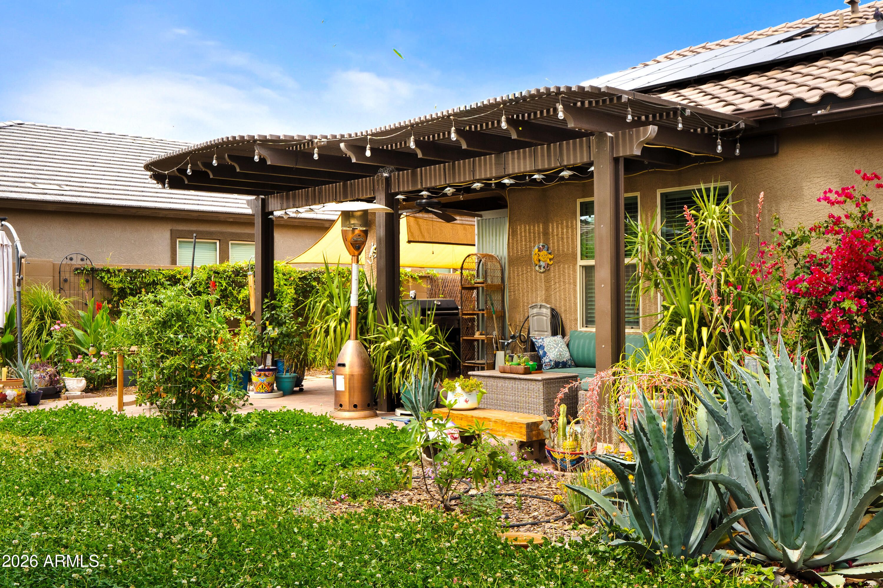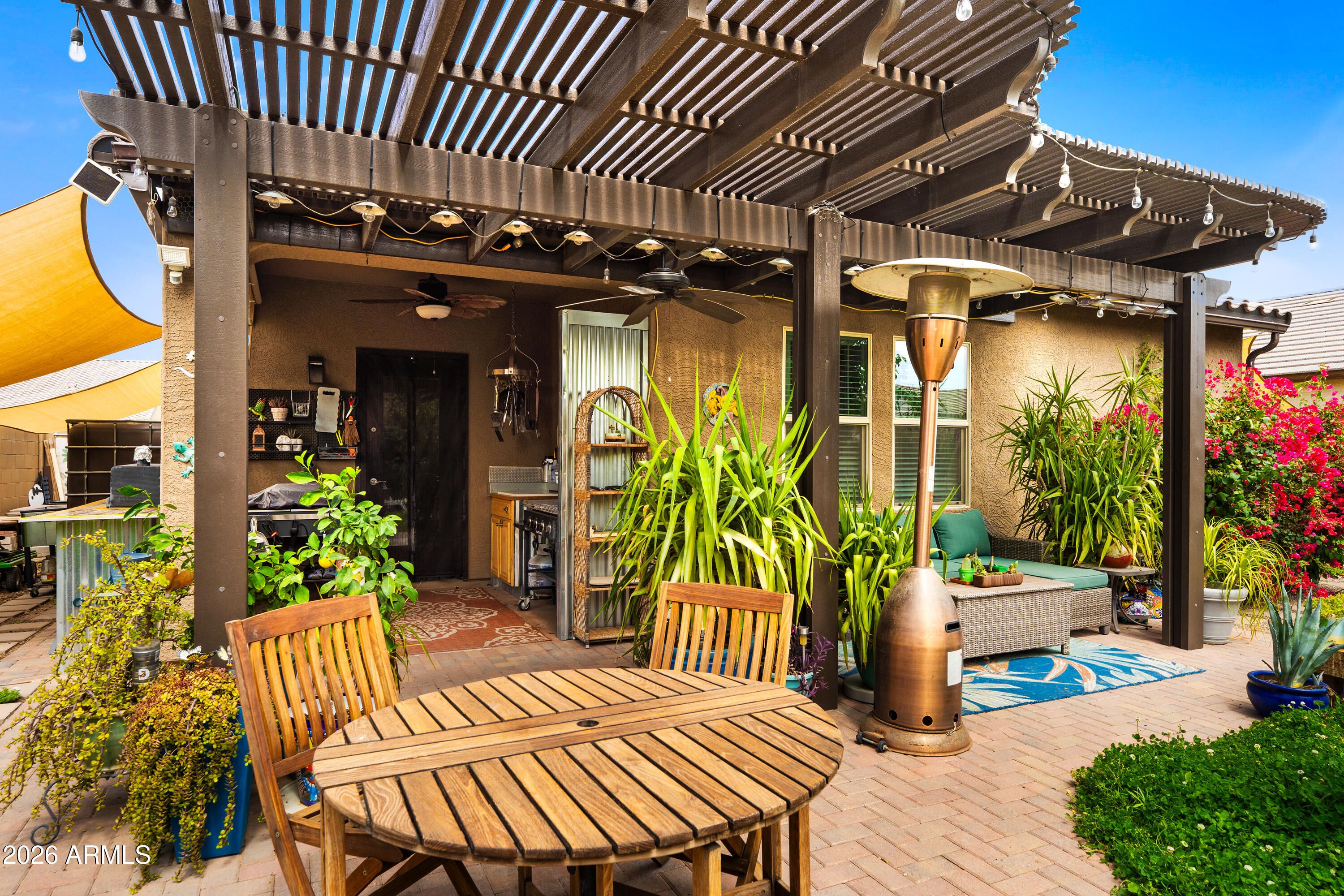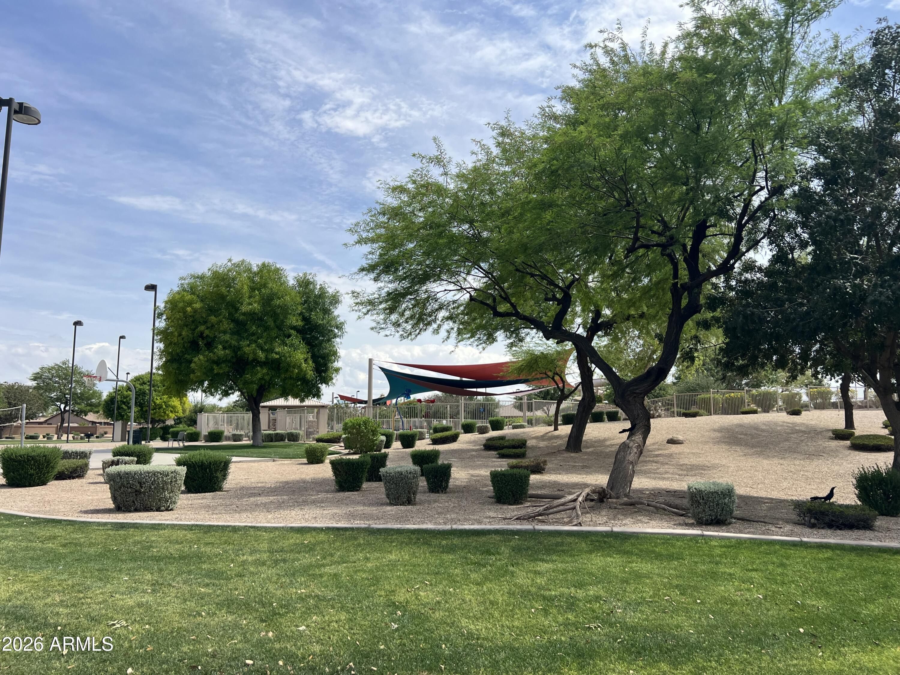 Welcome to your dream home in the highly sought-after, family-friendly community of Mission Royale 2! This NEARLY NEW 3-bedroom, 2-bathroom home is packed with thoughtful upgrades and move-in-ready convenience. From the moment you arrive, you'll notice the beautifully landscaped front and rear yards, complete w/ EXTENDED PAVER PATIO, pergola, shade sails, and a fully equipped OUTDOOR KITCHEN--perfect for entertaining or relaxing Arizona evenings. Inside, enjoy stylish VINYL PLANK FLOORING, upgraded ceiling fans, and a spacious layout, along with a garage door opener with keypad for added convenience.The kitchen is a true standout, featuring GRANITE SLAB COUNTERTOPS, a FARMHOUSE SINK with disposal, stainless steel appliances (including the fridge), 30-inch espresso cabinets with upgraded CROWN MOLDING, and elegant Televera tile accents. This home also includes incredible extras such as a Whirlpool WASHER AND DRYER, 2-inch faux wood blinds, and even select large furniture pieces that stay--including the COUCH, KITCHEN TABLE SET, and QUEEN-SIZED BED-making this an easy, TURNKEY opportunity. Step outside to your own private oasis with a lush green backyard filled with FRUIT AND VEGETABLE plants, including mandarin, lime, peach, pomegranate, Arizona sweet orange trees, and artichoke plants--plus a TRAMPOLINE INCLUDED for added fun! Energy efficiency is a major bonus with solar panels through Good Earth, keeping your electric bills incredibly low. The Mission Royal 2 community also offers a PRIVATE WATER AND RECREATION PARK featuring a variety of amenities for all ages, including exciting WATER SLIDES and an interactive SPLASH PAD for cooling off and family fun. The park also offers a sand volleyball court and a basketball court for active play and friendly competition. In addition, a spacious SHADED RAMADA provides a comfortable gathering space, perfect for picnics, parties, and social events. Shopping, restaurants, schools and more close by. This home truly has it all--style, savings, and a lifestyle you'll love! COME SEE IT TODAY!!