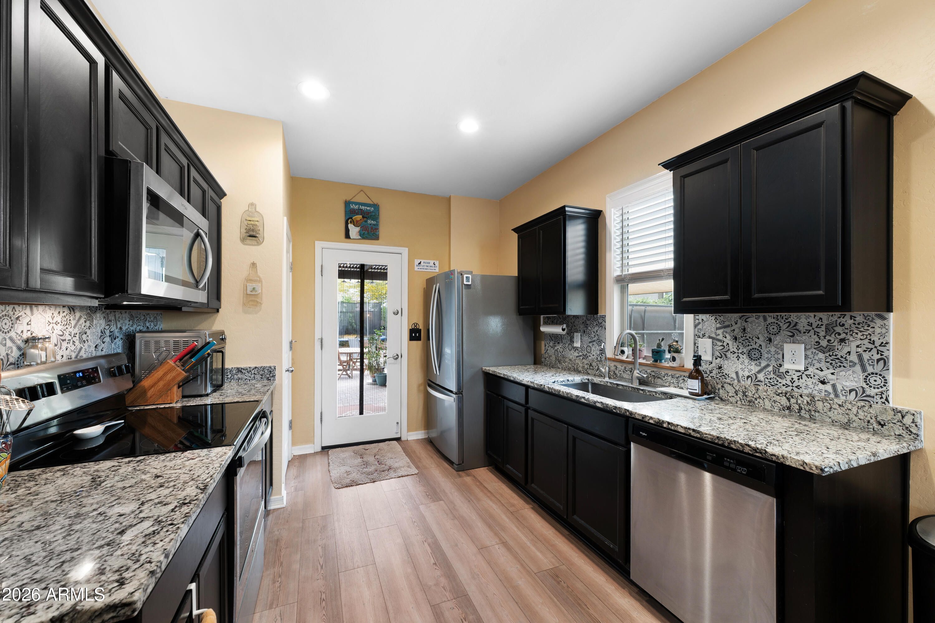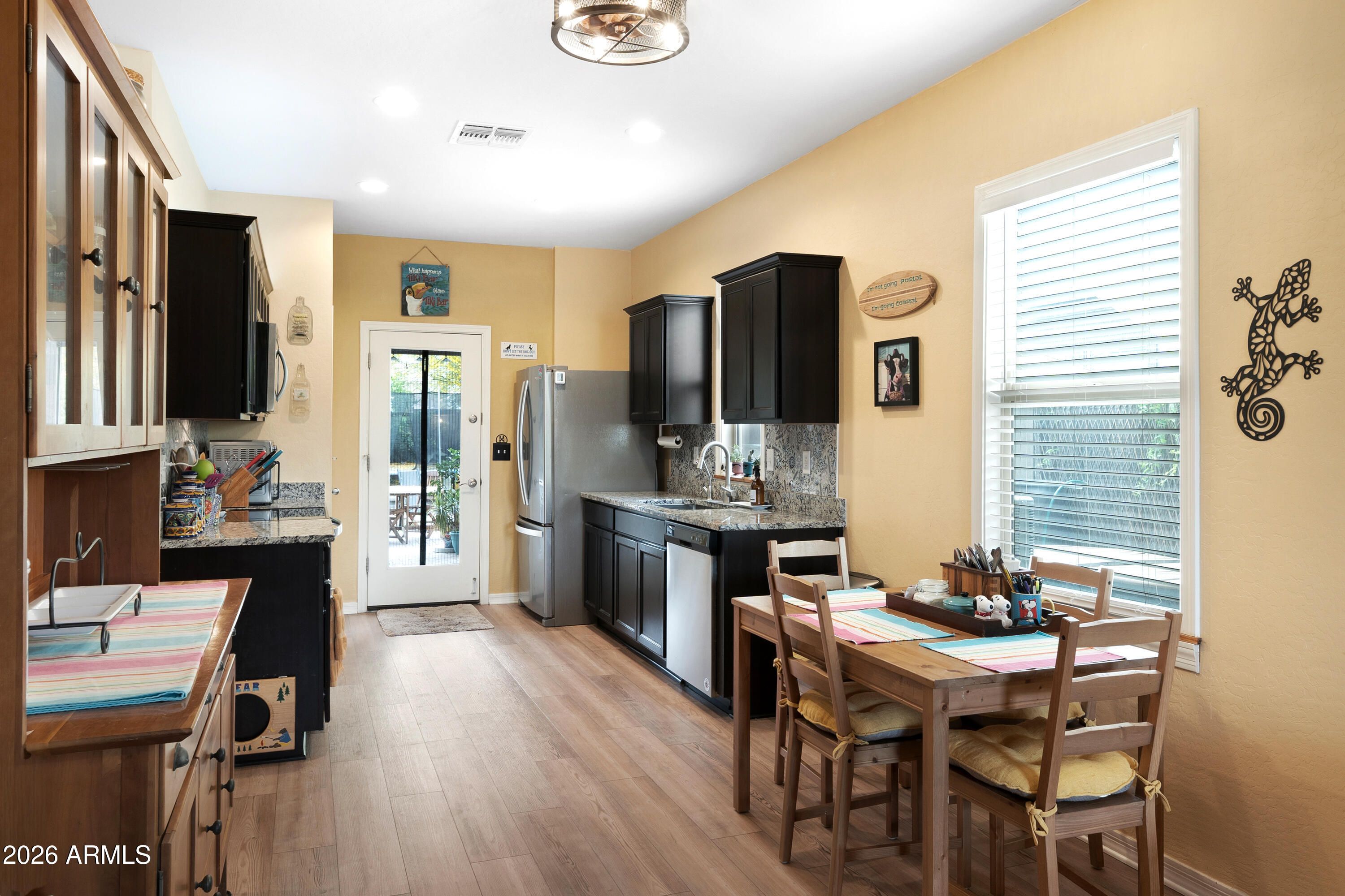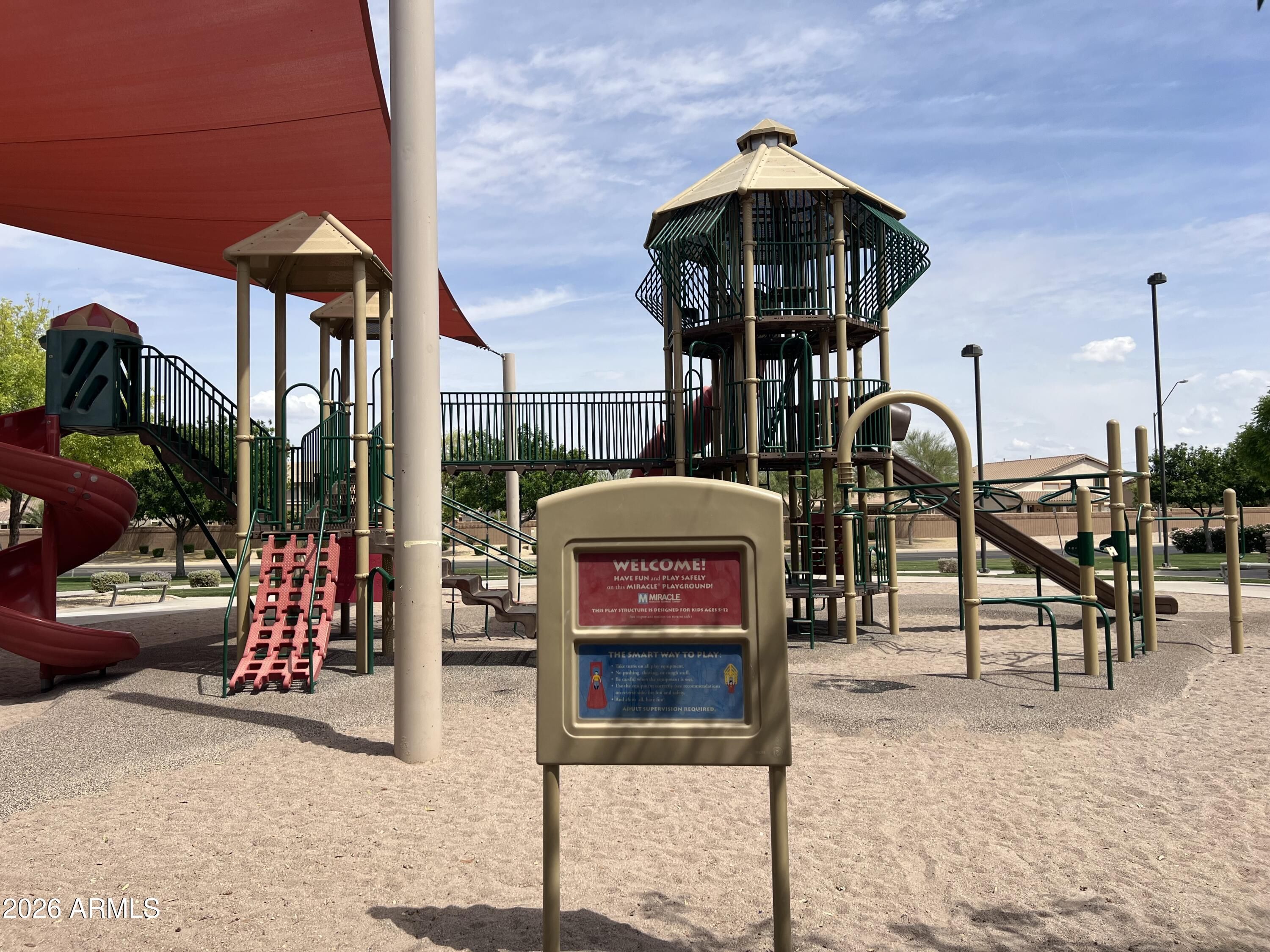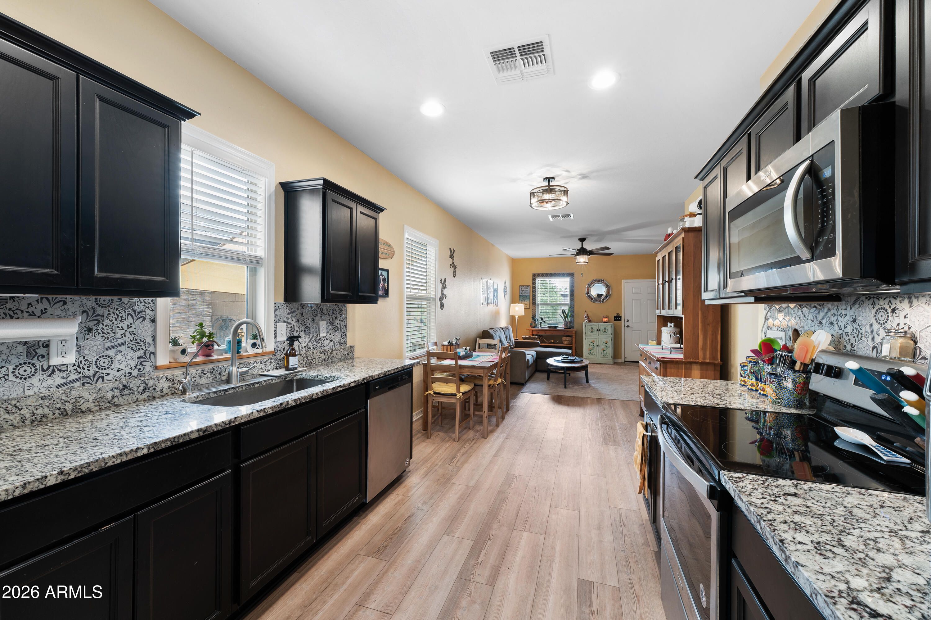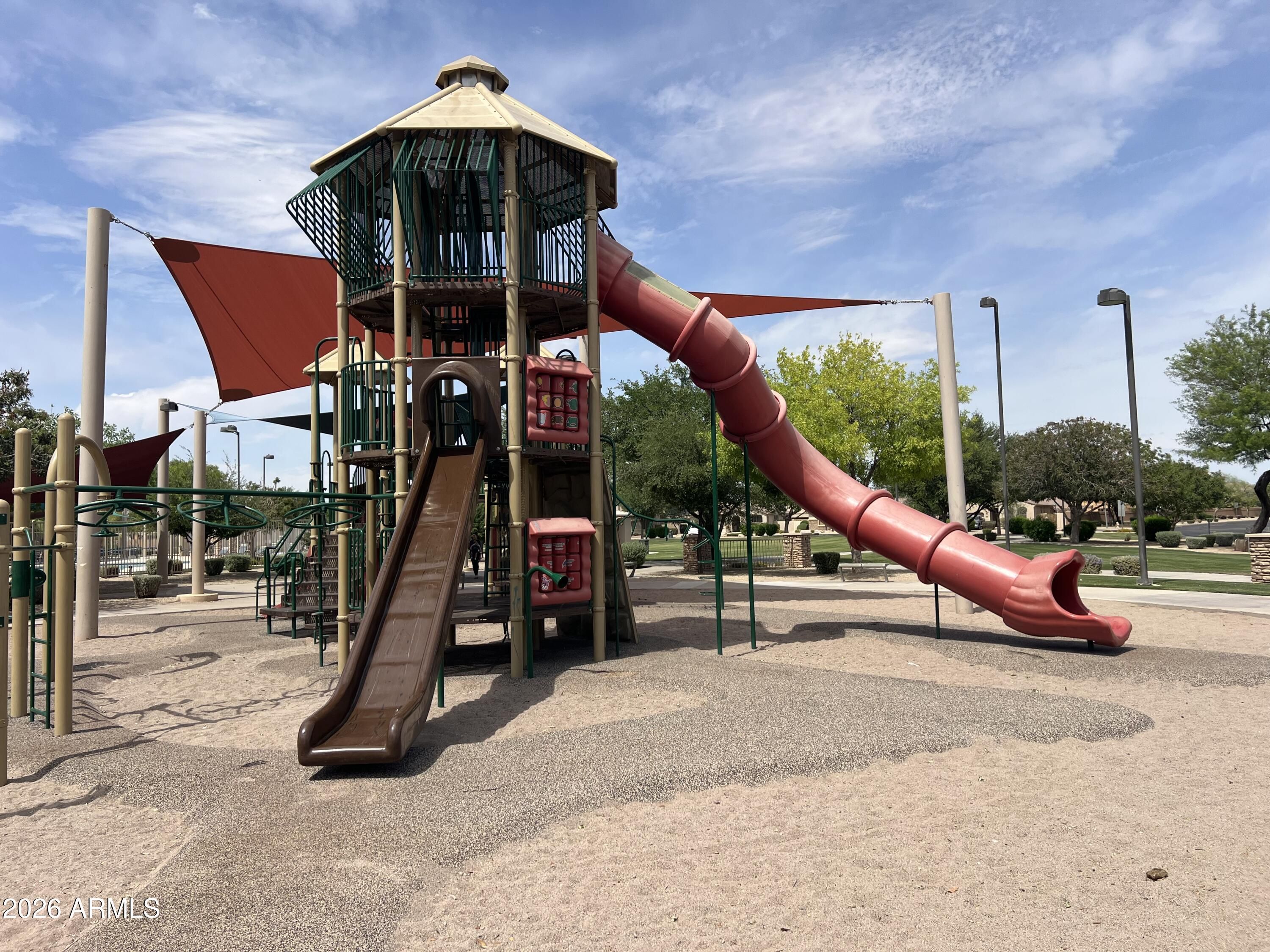 Welcome to your dream home in the highly sought-after, family-friendly community of Mission Royale 2! This NEARLY NEW 3-bedroom, 2-bathroom home is packed with thoughtful upgrades and move-in-ready convenience. From the moment you arrive, you'll notice the beautifully landscaped front and rear yards, complete w/ EXTENDED PAVER PATIO, pergola, shade sails, and a fully equipped OUTDOOR KITCHEN--perfect for entertaining or relaxing Arizona evenings. Inside, enjoy stylish VINYL PLANK FLOORING, upgraded ceiling fans, and a spacious layout, along with a garage door opener with keypad for added convenience.The kitchen is a true standout, featuring GRANITE SLAB COUNTERTOPS, a FARMHOUSE SINK with disposal, stainless steel appliances (including the fridge), 30-inch espresso cabinets with upgraded CROWN MOLDING, and elegant Televera tile accents. This home also includes incredible extras such as a Whirlpool WASHER AND DRYER, 2-inch faux wood blinds, and even select large furniture pieces that stay--including the COUCH, KITCHEN TABLE SET, and QUEEN-SIZED BED-making this an easy, TURNKEY opportunity. Step outside to your own private oasis with a lush green backyard filled with FRUIT AND VEGETABLE plants, including mandarin, lime, peach, pomegranate, Arizona sweet orange trees, and artichoke plants--plus a TRAMPOLINE INCLUDED for added fun! Energy efficiency is a major bonus with solar panels through Good Earth, keeping your electric bills incredibly low. The Mission Royal 2 community also offers a PRIVATE WATER AND RECREATION PARK featuring a variety of amenities for all ages, including exciting WATER SLIDES and an interactive SPLASH PAD for cooling off and family fun. The park also offers a sand volleyball court and a basketball court for active play and friendly competition. In addition, a spacious SHADED RAMADA provides a comfortable gathering space, perfect for picnics, parties, and social events. Shopping, restaurants, schools and more close by. This home truly has it all--style, savings, and a lifestyle you'll love! COME SEE IT TODAY!!