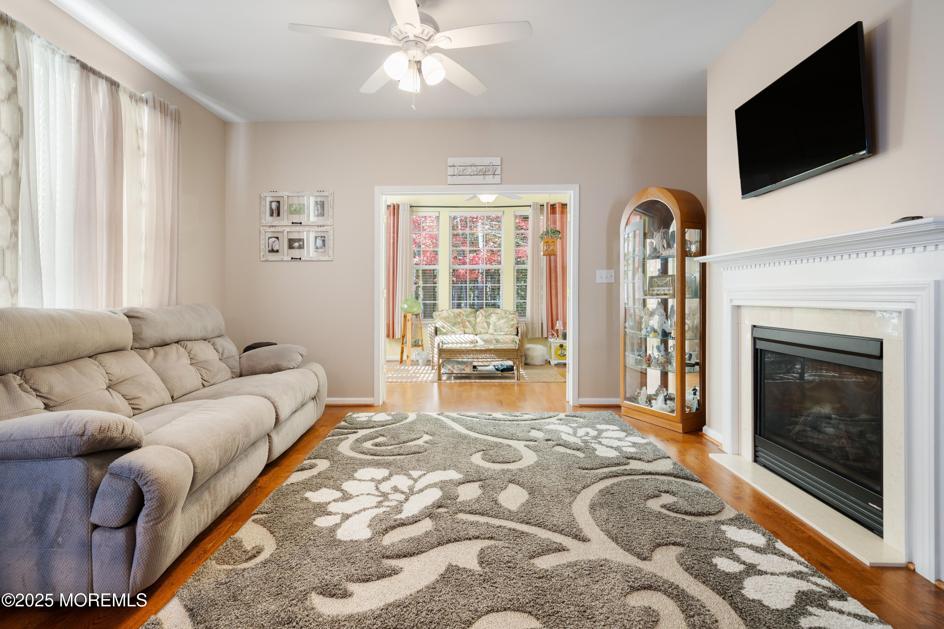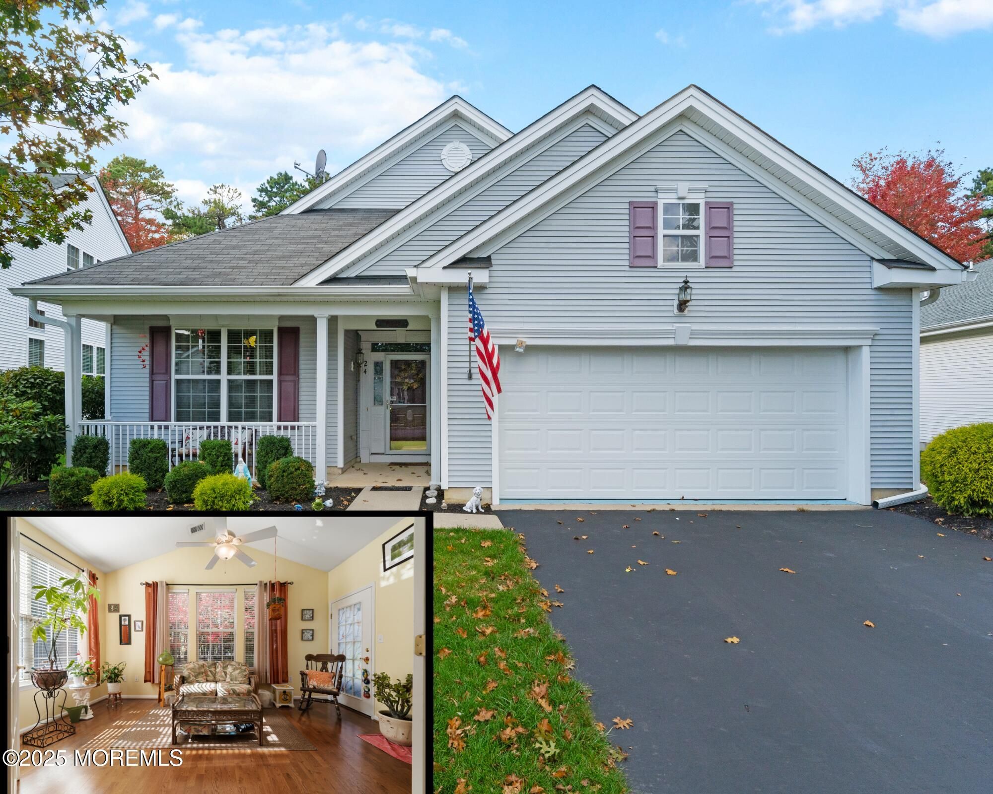Welcome to the home you've been waiting for! Located in the highly sought-after and gated Four Seasons at Mirage community, this beautifully maintained move-in-ready residence offers exceptional amenities and an inviting layout designed for comfort and style. Step onto the rare front porch, then inside to a bright and spacious floor plan featuring hardwood floors, designer lighting, and a cozy gas fireplace in the family room. The adjoining sunroom / three-season room provides a serene, natural, private woodsy view—perfect for morning coffee or quiet relaxation. The updated kitchen is a chef's dream, complete with stainless steel appliances, granite countertops, custom white cabinetry, lazy Susan, double pantry, recessed lighting, and a self-cleaning double oven. A brand-new stainless steel stove, refrigerator, microwave, and dishwasher make this space truly move-in-ready and low-maintenance. The primary suite is impressively large, offering a walk-in closet, recessed lighting, and a spa-like bathroom with a Jacuzzi tub, separate shower, and additional closet space. The second bedroom also includes a walk-in closet and its own full bathroomideal for guests or multi-generational living. A spacious laundry room with utility tub adds convenience, while the carpeted loft above the oversized two-car garage provides endless possibilities as a guest room, office, hobby room, or recreation space. With seven closets, abundant storage, ceiling fans, chandeliers, designer blinds, and lifetime leaf-gutter protection, this home truly has it all. Residents of Four Seasons at Mirage enjoy resort-style amenities including a clubhouse with organized activities, two swimming pools, hot tub/spa, fitness center, tennis courts, shuffleboard, kitchen/common areas, and 24-hour security. Experience the perfect blend of comfort, luxury, and community living. This exceptional home is well-kept, move-in-ready, and packed with highly desirable featuresdon't miss your chance to make it yours!