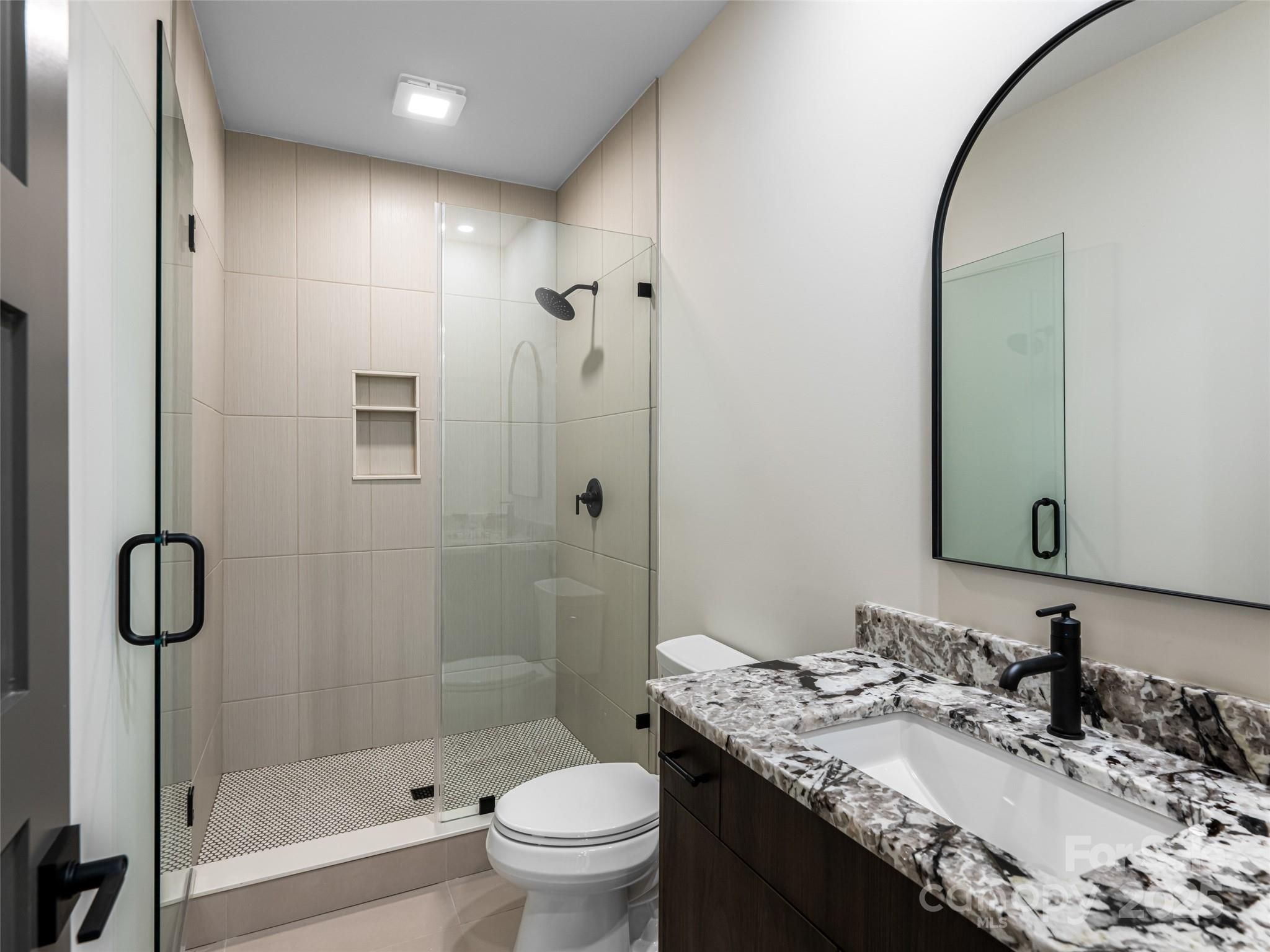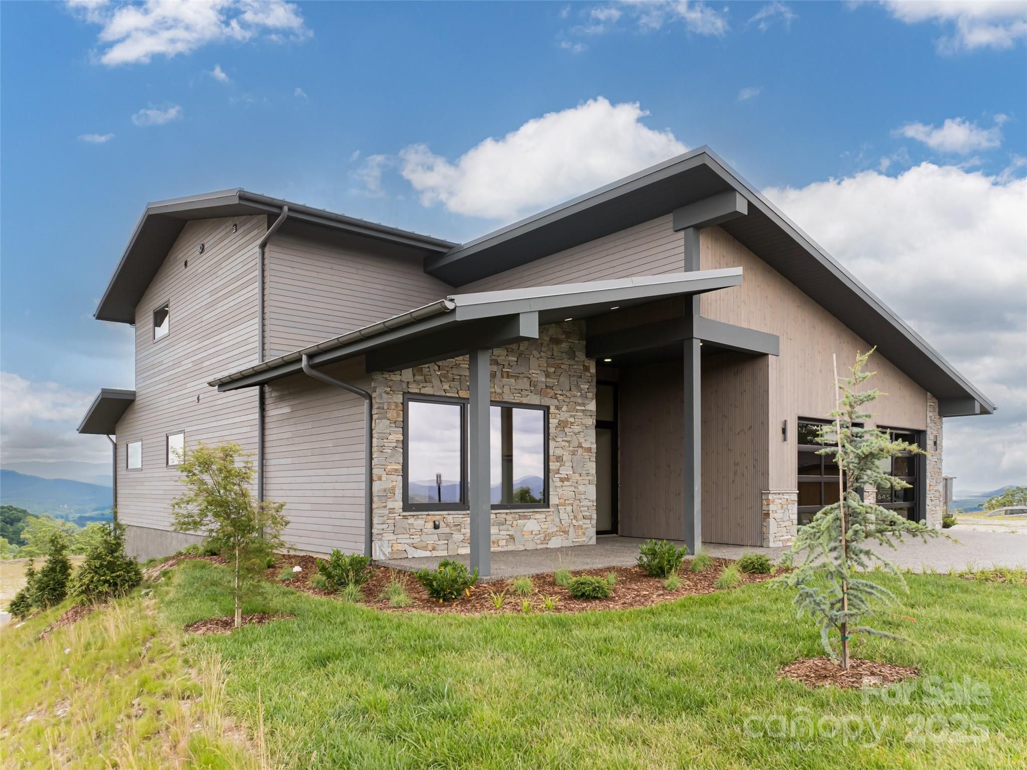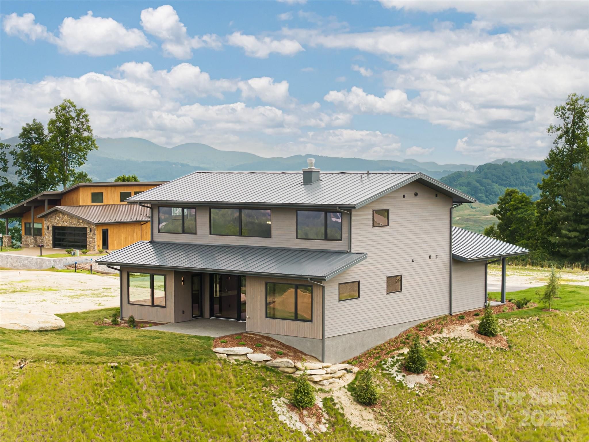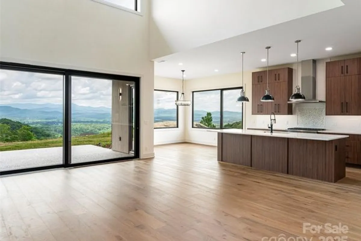 Located in Summit Vista, the newest luxury enclave within the gated Carriage Park community, this brand-new mountain-modern residence is perfectly positioned to capture panoramic, long-range layered mountain views from nearly every room and is further enhanced by a rare double lot that provides added privacy, extra breathing room, and ideal space for outdoor living. Designed for effortless lock-and-leave living, this refined single-family home is just 7 minutes from Historic Downtown Hendersonville and minutes from Asheville Regional Airport, offering both convenience and tranquility. Summit Vista features +/-6 acres of beautifully maintained community common space, extending outdoor living while preserving privacy, with homes thoughtfully sited to feel secluded yet naturally connected to neighbors and the greater Carriage Park community. The open-concept main level is anchored by a dramatic floor-to-ceiling stacked-stone fireplace and expansive 7’ x 14’ sliding glass doors that open to the terrace patio, creating a seamless indoor-outdoor flow ideal for entertaining or relaxing while taking in the views. The chef’s kitchen is both striking and highly functional, featuring Cristallo quartzite countertops and a full suite of Thermador appliances. The main-level primary suite offers a peaceful retreat with private patio access framed by sweeping mountain views and a luxurious bath, while the upper level provides exceptional flexibility with a second primary suite, guest suite, family room with wet bar, and laundry room. Built with durability and efficiency in mind, the home showcases thermally treated natural wood siding, stone accents, a standing-seam metal roof, and European Oknoplast high-performance windows and doors, along with hybrid insulation, two Navien tankless water heaters, and a two-car garage pre-wired for a generator and EV charging. Residents of Carriage Park enjoy 24-hour gated security, a clubhouse, heated indoor pool, tennis and pickleball courts, and scenic shared common spaces, making this a rare opportunity to own new-construction luxury in one of Hendersonville’s premier mountaintop communities