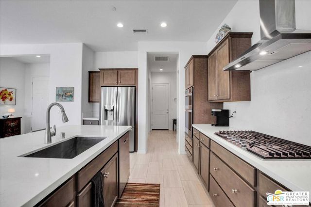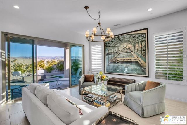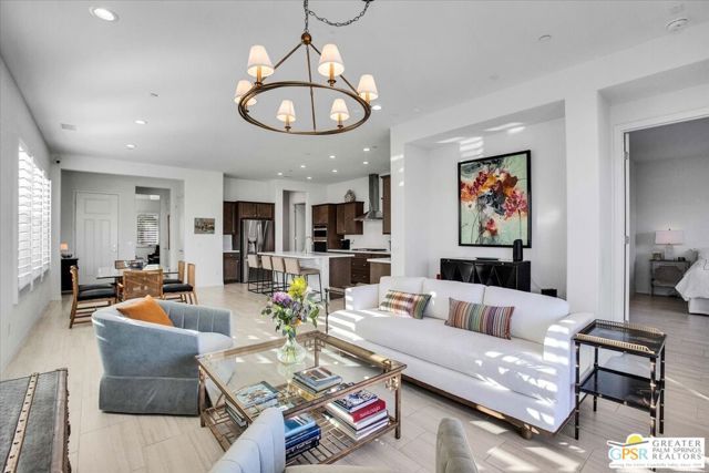 Welcome to luxury living at Del Webb Rancho Mirage's 55+ community! Nestled in phase 6, this upgraded Expedition Model Home offers a truly exceptional living experience. Step into this stunning one-level home built in 2023 and be greeted by 10-foot ceilings and panoramic mountain views. This spacious, 1770 square foot residence features two large bedrooms, two baths, and a den, providing ample space for living, relaxation and entertainment. The interior of the home was completely repainted in April of 2025. The primary bedroom boasts a large walk-in closet, dual vanities in the bath and a linen closet. The second bedroom also offers a walk-in closet, providing extra storage space. The private den offers the perfect office or reading room, located in the front of the home. With an open floor plan seamlessly connecting the kitchen, dining, and living areas, this home is perfect for hosting gatherings or enjoying quiet nights in. This home offers a spacious kitchen with ample cabinetry, a large center island and great storage with a walk-in pantry. The laundry room includes a sink for added convenience and additional shelving above. Custom finish upgrades were made during construction, including prewiring for LVR surround sound, custom tile floors throughout, wood shutters for privacy and sun protection, and owned Solar system! The backyard of this home is completely landscaped to be an entertainer's dream and low maintenance. It offers a covered patio and multiple seating areas. It's the perfect setting for hosting outdoor gatherings or simply relaxing in the sunshine. Living at Del Webb Rancho Mirage means access to an array of exceptional amenities. The 20,000 square-foot clubhouse offers a modern fitness center, aerobics studio, golf simulator, a wine room and an outdoor fireplace. The ballroom is perfect for special events and entertainment. Outdoor enthusiasts will appreciate the large pool and smaller covered pool, as well as the large spa for ultimate relaxation. Stay active with 8 Pickleball courts, 4 tennis courts, 3 bocce courts, a putting green, and six miles of walking trails. There are also dedicated dog areas for your furry friends. At Del Webb Rancho Mirage, residents can enjoy a well-organized and endless variety of activities and events tailored to their interests. It's the perfect place to create lasting memories and forge new friendships.
