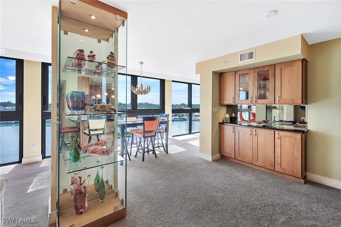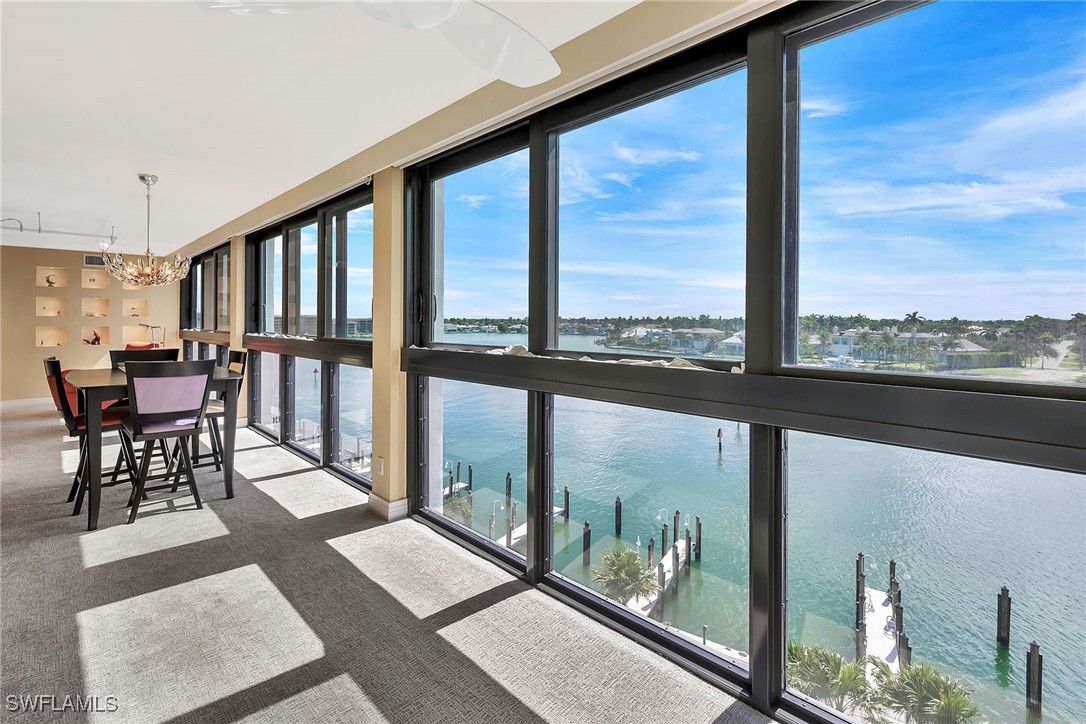 Enjoy sweeping bay views from this fifth-floor residence in the sought-after Admiralty Point II. This highly remodeled spacious two-bedroom, two-bath plus den condominium offers approximately 1,948 square feet of living space with a split-bedroom floor plan, large living and dining area, and a kitchen featuring stainless steel appliances, electric cooktop, and a breakfast bar and beautiful cabinetry. The primary suite includes dual sinks, a separate tub and shower, and two walk-in closets. Additional features include in-residence laundry and a private garage attached to the building. Admiralty Point is a gated, amenity-rich community offering beach access, two community pools, spa/hot tub, fitness center, har-tru clay tennis courts, fishing pier, kayak launch, extra storage, shuffleboard, and dock lease options with electric and water available. Admiralty Point" an exceptional and private 10-acre enclave at tip of Gulf Shore Boulevard with Doctors Pass, Moorings Bay and the Gulf Of America surrounding the property.