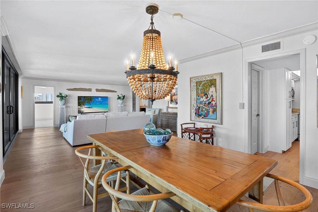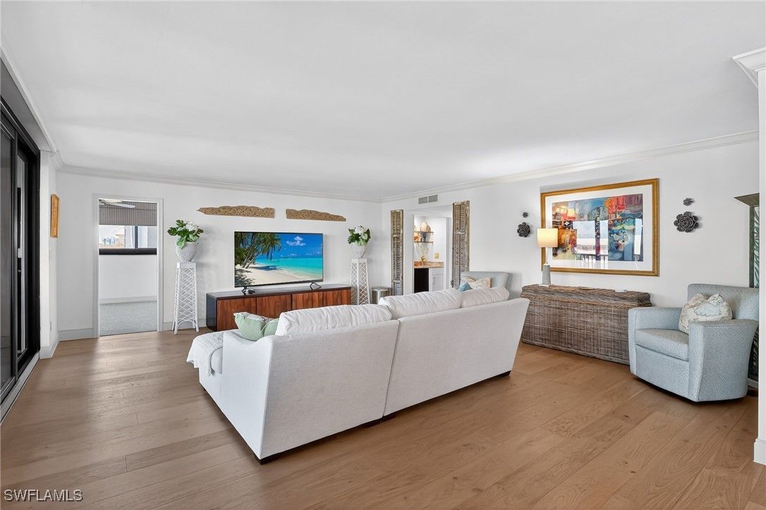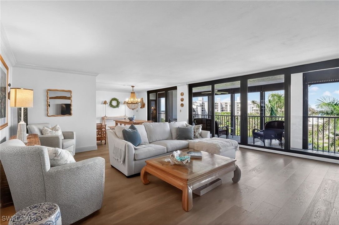 Discover the very best in Coastal Living. "ADMIRALTY POINT" an exceptional and private 10-acre gated enclave located at the tip of Gulf Shore Blvd. Surrounded by the Gulf, Doctors Pass, and Moorings Bay. This remarkable property offers 2,100 square feet of living space, complemented by a spacious screened balcony. Situated on the 6th floor, this turnkey 3-bedroom, 2-bath home boasts stunning Gulf views from every room. The open Great Room floor plan with gorgeous new wood floors includes a generous living area and dining area. The beautiful eat-in kitchen with stainless steel appliances, granite countertops and subway tile backsplash are sure to please the finest chef. The home is a split bedroom floorplan with the primary bedroom with ensuite bathroom on one side and the 2nd bedroom and den are on the other side with a beautiful bathroom adding to the charm of this home. Features such as impact windows and sliding doors, electric hurricane shutters, a carport, and a storage room enhance the property's comfort and appeal. Admiralty Point offers world-class resort-style amenities and 24-hour gatehouse security. Residents have the pleasure to enjoy 2 pools in this community. Watching the sunrise at the bayside pool or unwinding at the brand-new Gulf-side pool. Additional amenities include private beach access, two spas, a children's pool, a state-of-the-art fitness center, two HAR-TRU tennis courts, BBQ grills, dining pavilions, kayak and paddleboard launch, car wash, boat slip lease, guest parking, and Garrison protective panels being installed at all buildings and so much more. Located just a short distance from Venetian Village, with wonderful shopping and waterfront dining. This home is perfect for relaxation, morning walks, bike riding, dolphin and manatee watching, and enjoying the very best of coastal living.