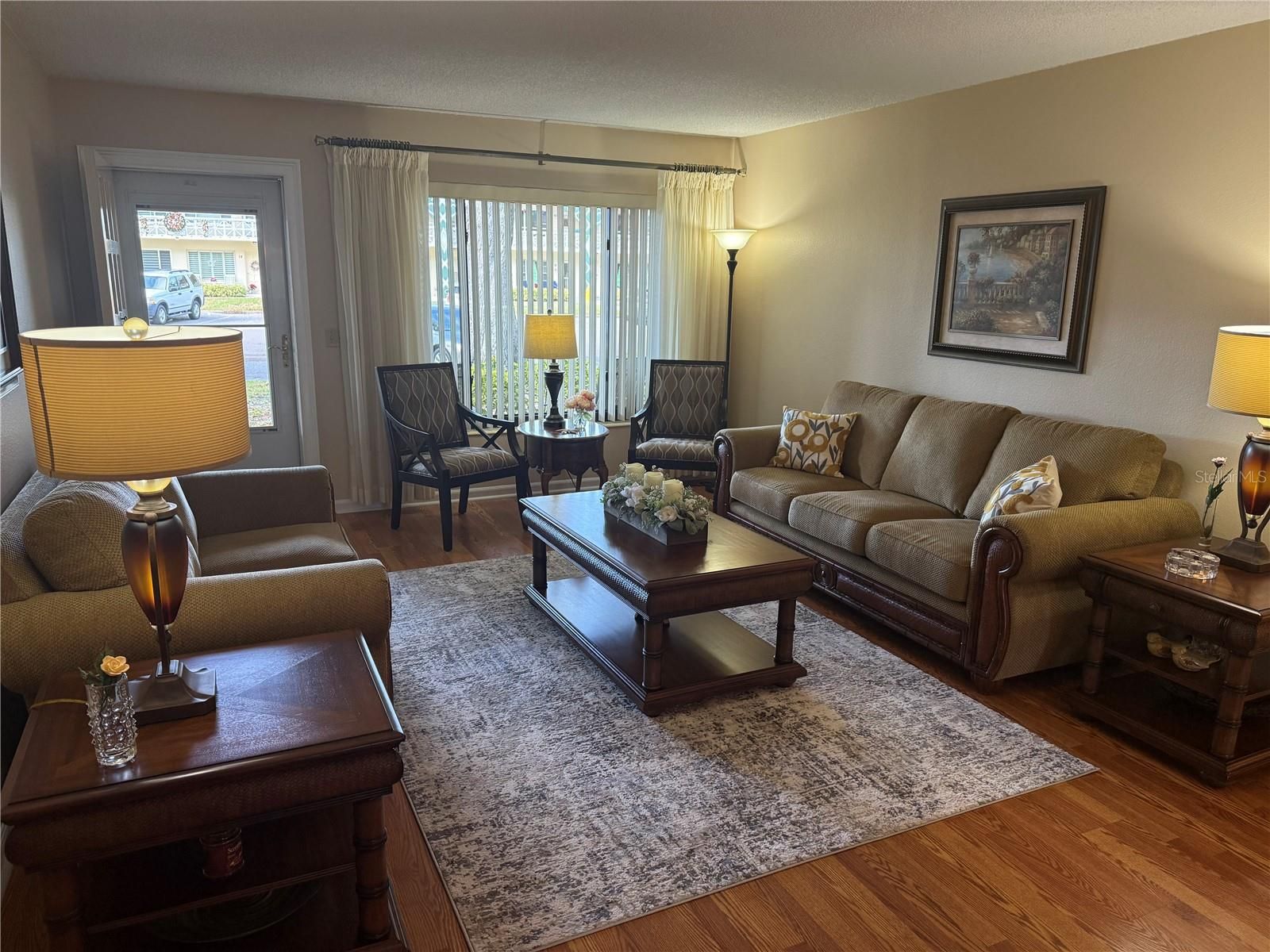 EXQUISITE, MOVE-IN FREADY and TASTEFULLY FURNISHED GROUND-FLOOR condo in a highly sought-after location. The aesthetically pleasing exterior features fresh paint and a spacious front porch with a newer storm door—perfect for relaxing and welcoming guests. Inside, beautiful wood-look laminate flooring flows throughout the main living areas, with tile in the Florida room and bathrooms—no carpet anywhere. This desirable split floor plan offers a spotless guest bathroom with a shower/tub combination. The spacious primary bedroom features new panel-door sliders and a convenient laundry closet with approved washer and dryer hookups. The clean and pristine primary bathroom includes a newer toilet and a walk-in shower. Just off the primary bedroom, the large Florida room is filled with natural light from two generous windows and a patio door. A well-organized storage closet/pantry houses the newer hot water heater. The spacious kitchen, located just off the Florida room, boasts newer matching appliances, solid-surface countertops, a tile backsplash, and shaker-style wood cabinetry. The new A/C unit has been relocated on the beautifully paved patio, creating a more expansive outdoor space ideal for relaxing or entertaining while enjoying serene green-space views—just steps from the golf course. Additional upgrades include double-pane windows throughout, a newer hurricane-rated back door, all original doors replaced with panel doors, a 2022 hot water heater, and a 2024 A/C. Ideally located next to the golf course and just a short distance to the vibrant community center offering numerous activities, a state-of-the-art gym, heated community pool, shuffleboard, pickleball, and tennis courts—this exceptional condo is offered FULLY FURNISHED for added convenience and immediate enjoyment!