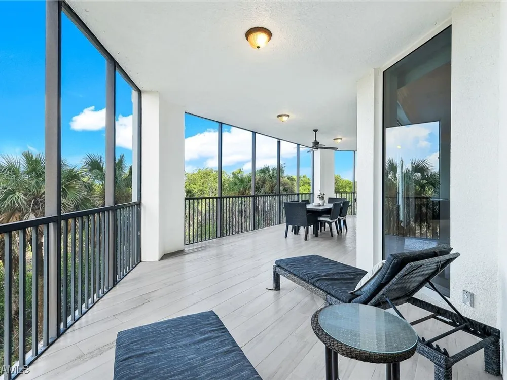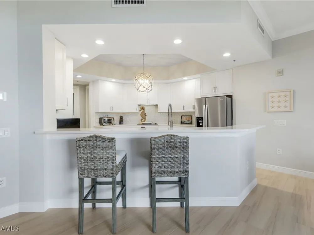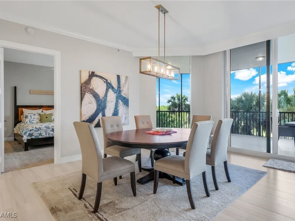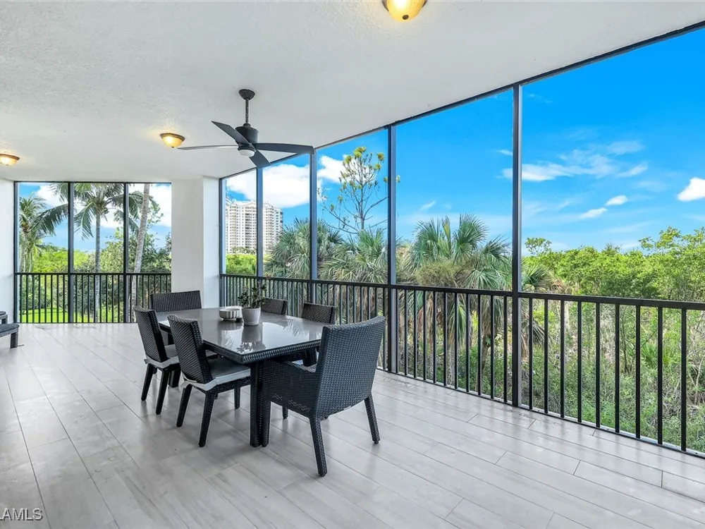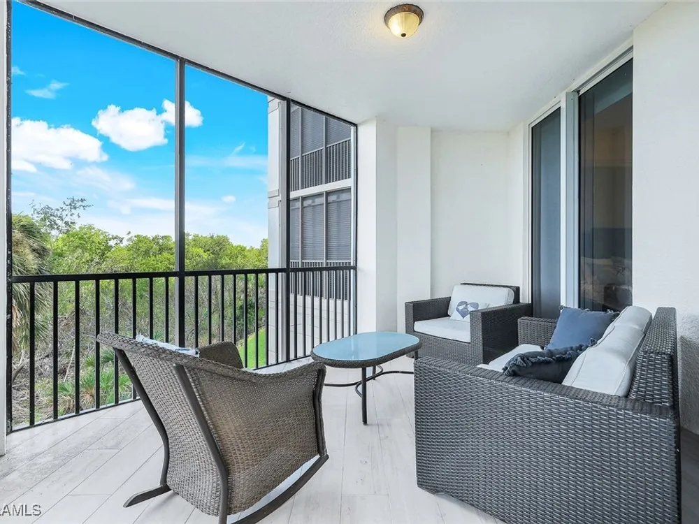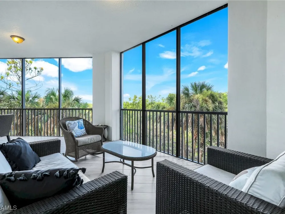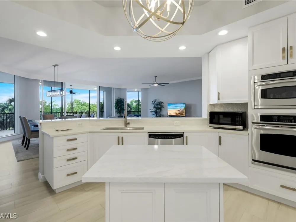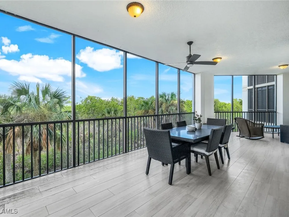 Refined elegance and effortless indoor-outdoor living meet in this updated 3-bed, 2.5-bath residence in the exclusive Castella at The Colony in Pelican Landing. Spanning almost 2,400 sq ft with an additional sprawling screened lanai, this condo blends quiet luxury with resort-style sophistication. From the moment you enter the foyer, you're welcomed by a light-filled great room with new flooring in the main living areas, bathrooms, and lanai. Every detail has been thoughtfully curated, from the designer light fixtures and Minka ceiling fans with remotes, to the recessed LED lighting, 5.5” baseboards, and elegant crown molding throughout. Featuring newer countertops and a stylish backsplash, the updated kitchen pairs modern functionality with timeless design. The primary suite offers private lanai access and an updated ensuite bath with spa-like finishes and refreshed countertops. Convenience abounds in the spacious laundry room with ample storage. A private western-facing lanai with newer flooring frames vibrant sunsets. Additional features include 2 assigned parking spaces. Castella’s 5-star resort-style amenities include a lagoon-style pool and spa, private clubhouse, grilling pavilion, and more. As part of The Colony at Pelican Landing, you’ll also enjoy access to a private beach island, tennis and pickleball courts, fitness center, canoe/kayak park, sailing center, and 36 holes of championship golf (optional membership). Come home to a place where every detail reflects luxury, and every sunset feels like a private show.
