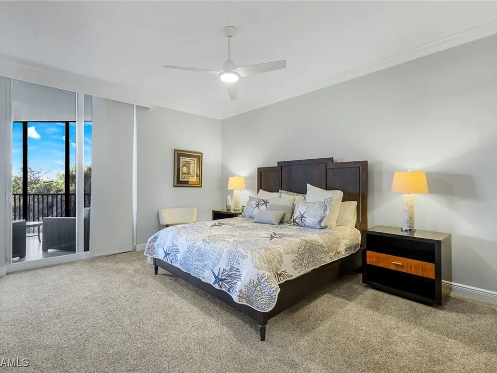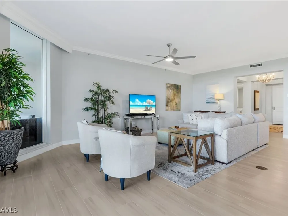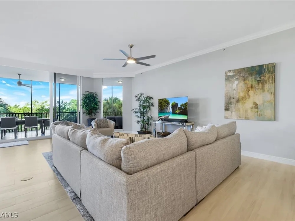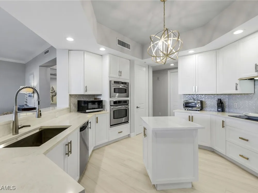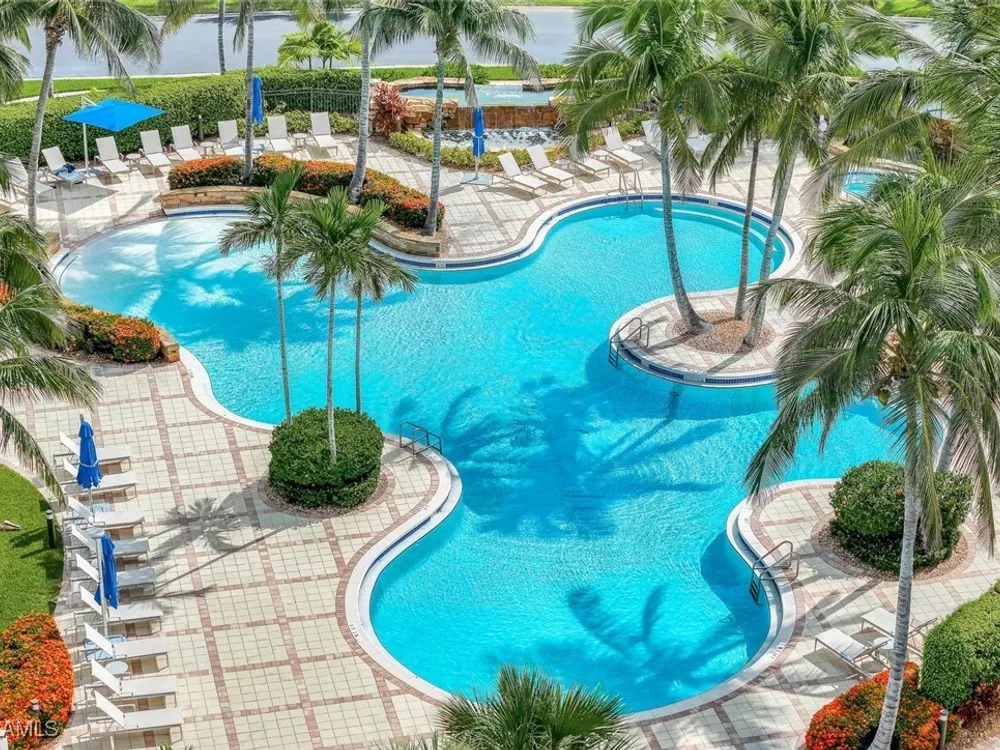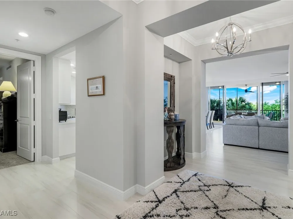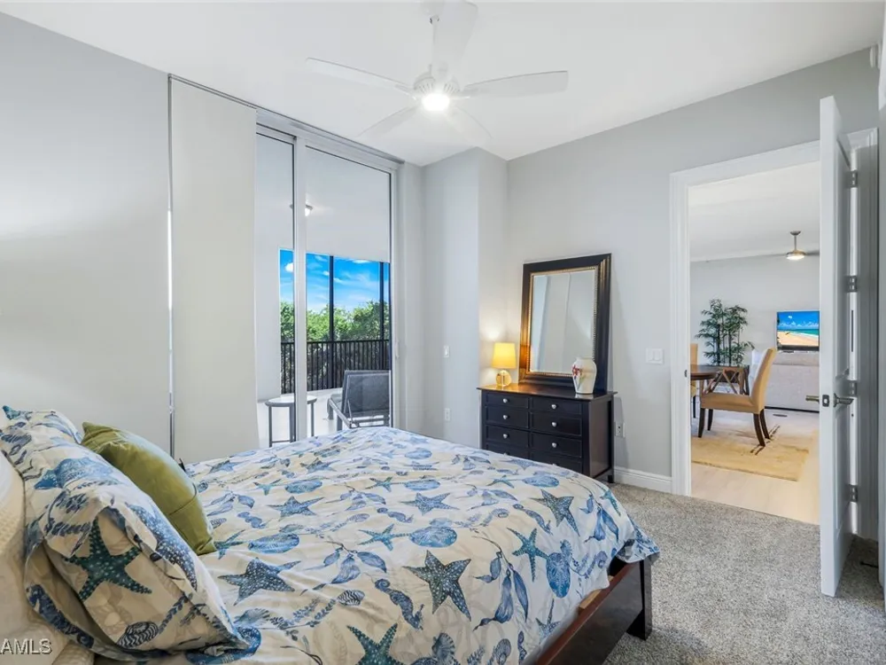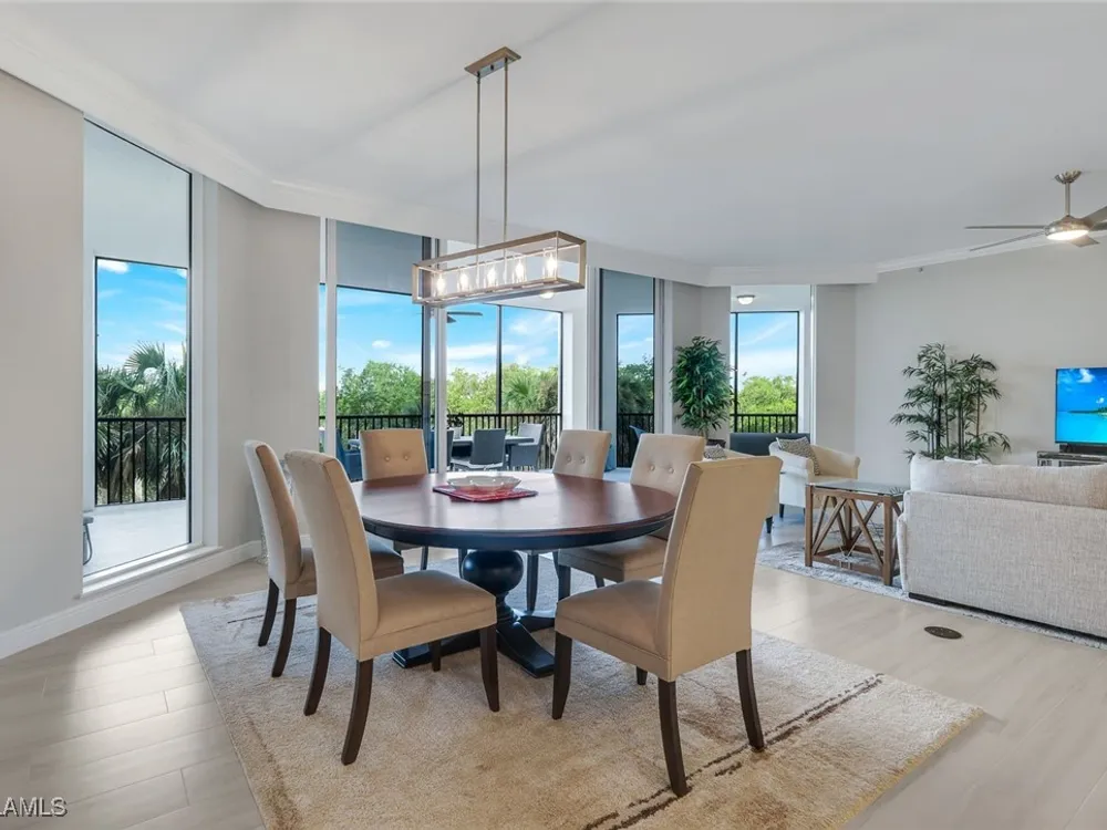Refined elegance and effortless indoor-outdoor living meet in this updated 3-bed, 2.5-bath residence in the exclusive Castella at The Colony in Pelican Landing. Spanning almost 2,400 sq ft with an additional sprawling screened lanai, this condo blends quiet luxury with resort-style sophistication. From the moment you enter the foyer, you're welcomed by a light-filled great room with new flooring in the main living areas, bathrooms, and lanai. Every detail has been thoughtfully curated, from the designer light fixtures and Minka ceiling fans with remotes, to the recessed LED lighting, 5.5” baseboards, and elegant crown molding throughout. Featuring newer countertops and a stylish backsplash, the updated kitchen pairs modern functionality with timeless design. The primary suite offers private lanai access and an updated ensuite bath with spa-like finishes and refreshed countertops. Convenience abounds in the spacious laundry room with ample storage. A private western-facing lanai with newer flooring frames vibrant sunsets. Additional features include 2 assigned parking spaces. Castella’s 5-star resort-style amenities include a lagoon-style pool and spa, private clubhouse, grilling pavilion, and more. As part of The Colony at Pelican Landing, you’ll also enjoy access to a private beach island, tennis and pickleball courts, fitness center, canoe/kayak park, sailing center, and 36 holes of championship golf (optional membership). Come home to a place where every detail reflects luxury, and every sunset feels like a private show.