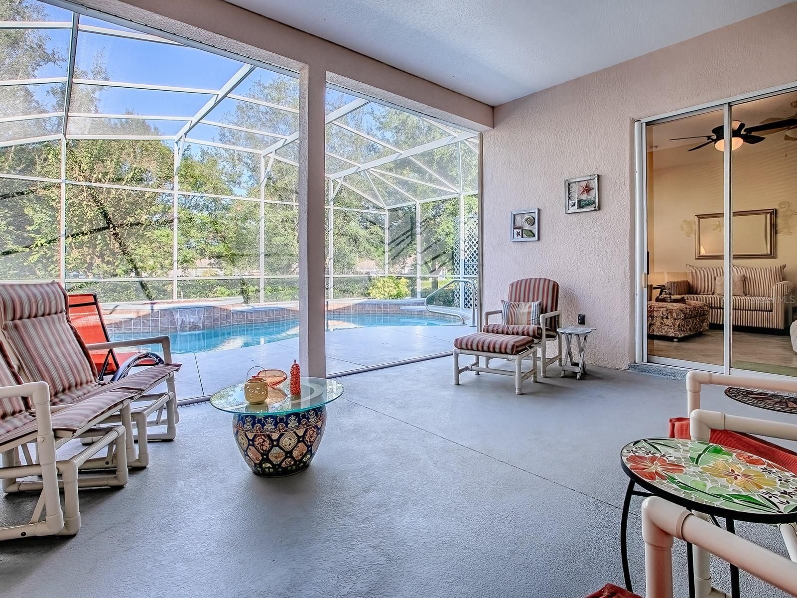 Welcome to this beautifully maintained 2-bedroom plus den, 2.5-bath home with a private heated pool, designed for comfortable living and easy entertaining. This versatile floor plan features two spacious owner’s suites, each with its own private bath, plus a flexible den ideal for an office, craft room, or additional guest space. The kitchen offers abundant counter space and cabinetry along with a dedicated coffee/tea area, and opens to the family room for seamless gatherings. Formal living and dining rooms provide additional entertaining space, and multiple access points lead to the pool area for true indoor-outdoor Florida living. Additional features include an inside laundry room with extra storage, oversized garage, sub-panel for pool (2022), new pool heater (2022), roof (2020), replaced hot water heater, and A/C condenser motor replaced in 2025. Located in The Plantation at Leesburg, residents enjoy a low HOA, on-site management, restaurant, tennis, three pools and spas, pickleball, walking trails, two golf courses, softball, fitness centers, billiards, library, and over 100 activities, plus a pavilion with grill, ice maker, refrigerator, and sink for community gatherings.