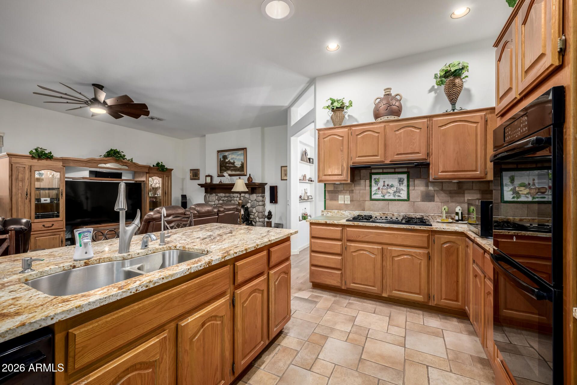 Come experience the good life in Sun Lakes, where everyday living feels like a vacation. This vibrant resort-style community offers an unmatched lifestyle--golf, tennis, pickleball, sparkling pools, a fitness center, clubs, social activities, on-site restaurants, and so much more--right at your fingertips. Set on a beautifully maintained lot, this updated Lexia model is a true gem featuring 3 bedrooms, 2.5 baths, office and a coveted 3-car garage with inviting curb appeal. Step inside to a spacious, flowing floor plan highlighted by soaring vaulted ceilings, plantation shutters, and a charming fireplace that anchors the living space with warmth and character. The kitchen is designed to impress; perfect for the home chef with sleek appliances, a gas cooktop, double wall ovens, two Solar Tubes, abundant warm wood cabinetry, and a center island with breakfast bar seating. Enjoy newer granite countertops, sinks and faucets in both the kitchen and laundry room, plus a new dishwasher for added convenience. A dedicated office/den with built-in bookshelves provides the ideal space for working from home, hobbies, or quiet reading. The primary suite is a relaxing retreat with a private en suite bath featuring dual sinks and thoughtful comfort. His and her walk-in closets with a Classy Closet system for two are an added bonus! This Integra Block home is packed with valuable upgrades including cultured marble window stills, water softener, a newer RO system, a newer roof, garage cabinets along one side leaving ample room for vehicles and an A/C system that has been partially updated. Upstairs access is made effortless with an $18,500 Acorn lift, offering added convenience and peace of mind. Outside, unwind in the beautifully landscaped backyard, complete with a built-in BBQ perfect for entertaining or simply enjoying the Arizona sunshine. This is more than a home; it's a lifestyle. Welcome to Sun Lakes.