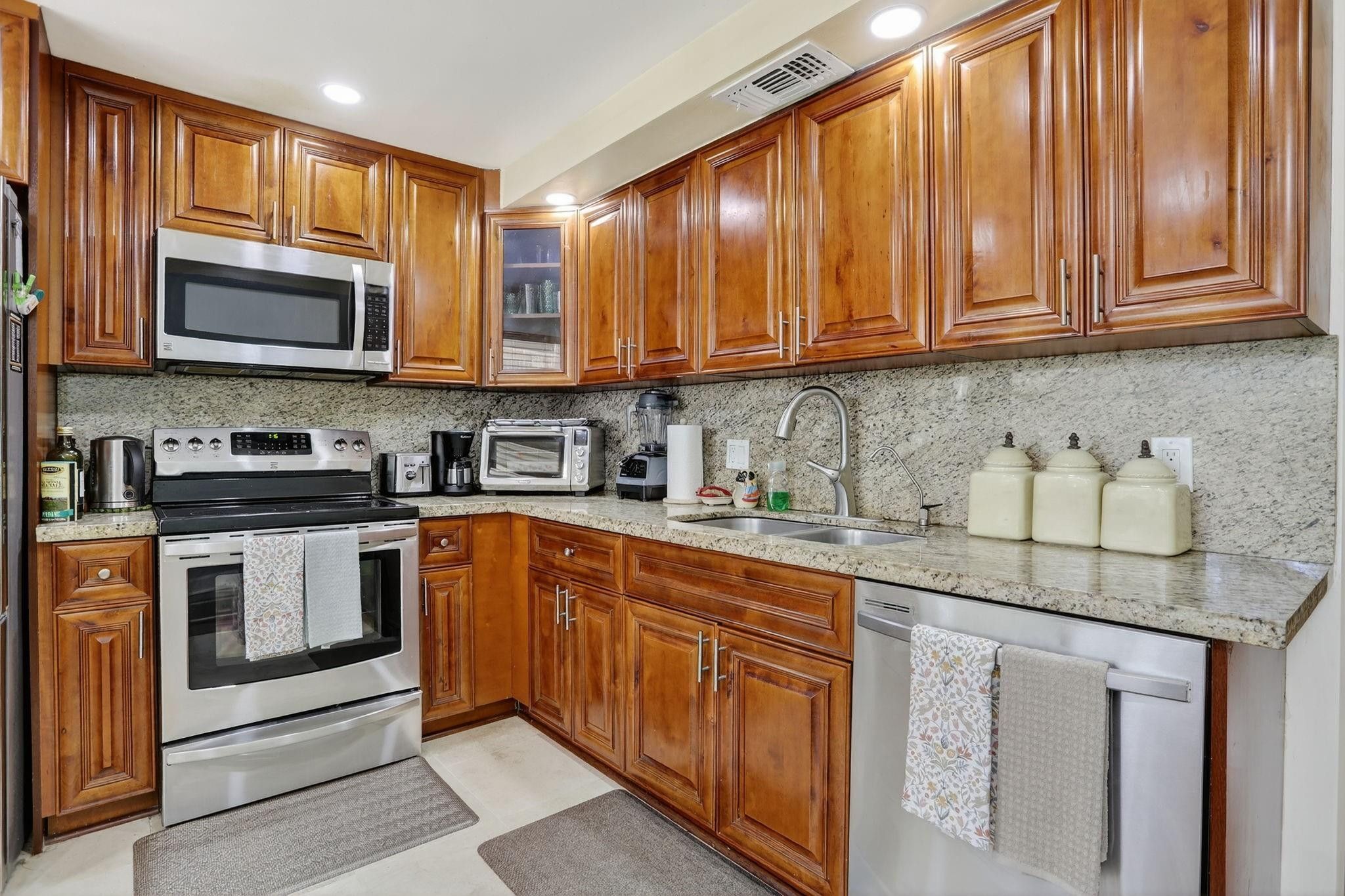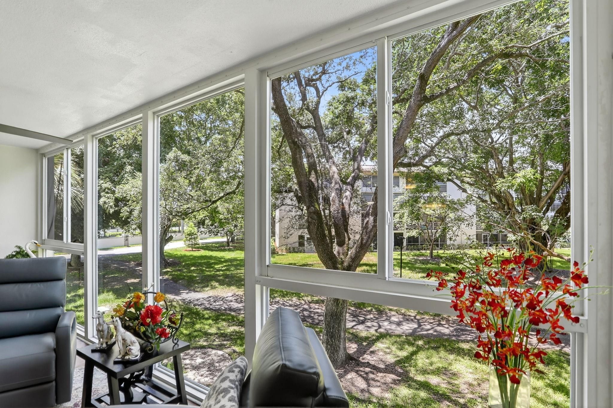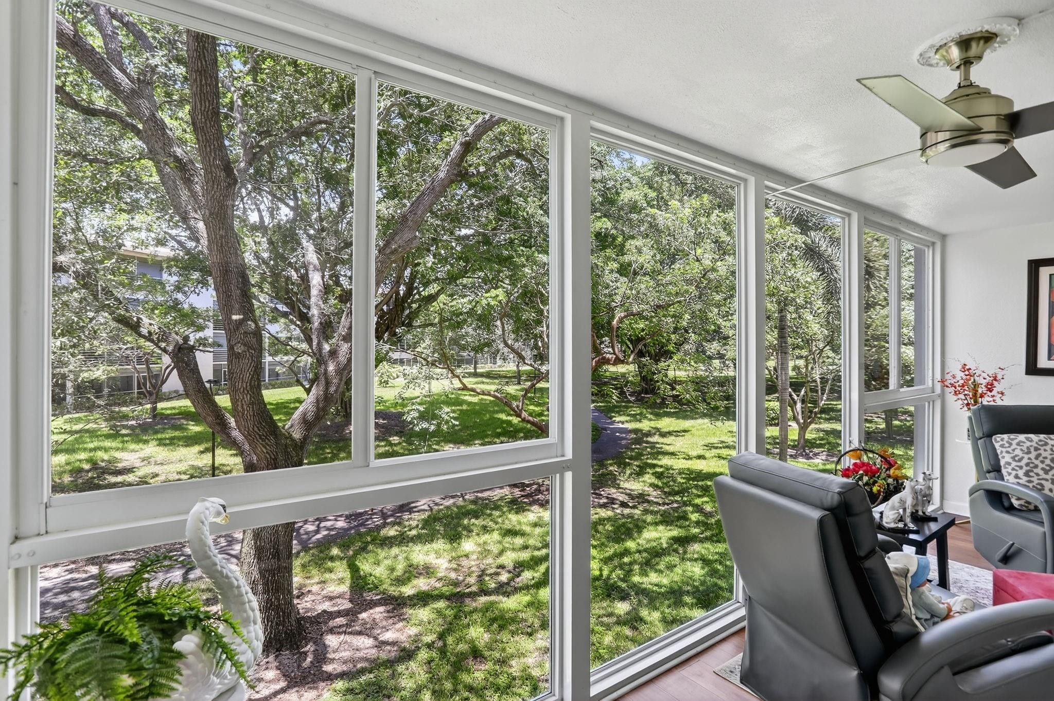 This charming and move-in ready condo features 2 spacious bedrooms and 2 modern bathrooms, with tile flooring in the kitchen and bathrooms and rich hardwood floors throughout the rest of the home. The updated kitchen offers real wood cabinets with lots of storage, while both bathrooms have been tastefully renovated for comfort and style.Enjoy peace of mind with hurricane impact windows and doors, and relax with serene garden views from your inclosed balcony. Located near the community gate, this unit offers quick and easy access in and out — ideal for your daily convenience. A perfect blend of style, comfort, and location! This charming and move-in ready condo features 2 spacious bedrooms and 2 modern bathrooms, with tile flooring in the kitchen and bathrooms and rich hardwood floors throughout the rest of the home. The updated kitchen offers real wood cabinets with lots of storage, while both bathrooms have been tastefully renovated for comfort and style.Enjoy peace of mind with hurricane impact windows and doors, and relax with serene garden views from your inclosed balcony. Located near the community gate, this unit offers quick and easy access in and out — ideal for your daily convenience. A perfect blend of style, comfort, and location!