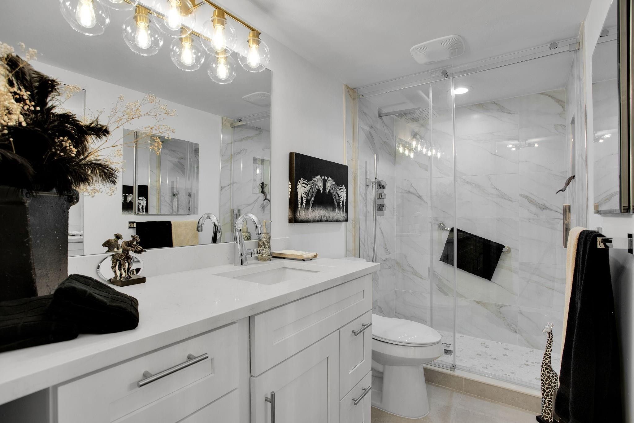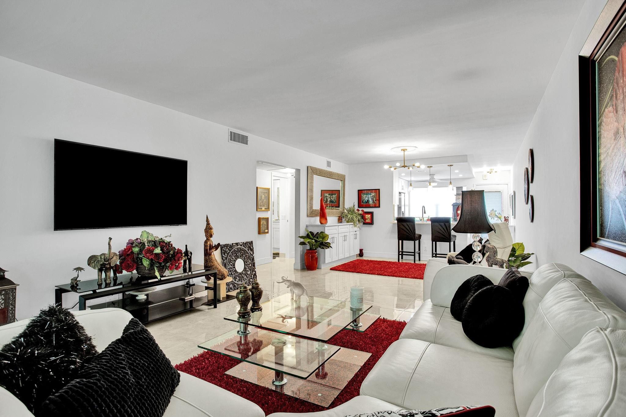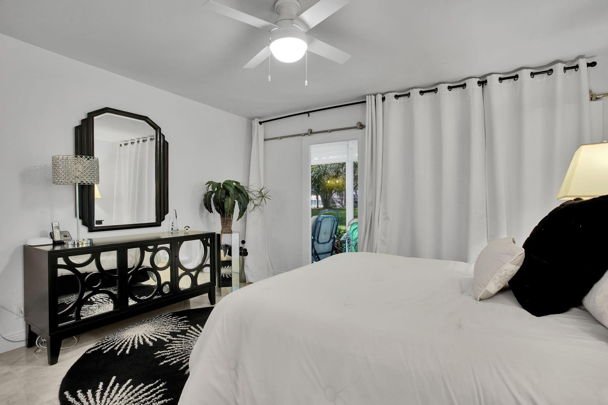 Discover your ideal ground-floor condo, complete with high-impact hurricane windows and panoramic sliding doors that lead to a private patio equipped with motorized window treatments. Enjoy beautifully landscaped garden, located steps away from the village pool. Features porcelain flooring throughout. Stylish open kitchen, white shaker cabinets, quartz countertops, stainless steel appliances, slide-in glass-top stove, a counter-depth refrigerator. The dining room includes additional storage with a built-in buffet. Both bathrooms have been renovated, floor-to-ceiling glass shower doors and modern vanities with single sinks, maximizing space for toiletries. all smooth ceilings, free of popcorn texture, new interior bedroom doors, and a barn door that connects the bedroom to the patio. Discover your ideal ground-floor condo featuring high-impact hurricane windows, a patio with motorized window treatments, and porcelain flooring throughout. The open kitchen boasts stylish white shaker cabinets, quartz countertops, stainless-steel appliances, a slide-in glass-top stove, and a counter-depth refrigerator. Host friends and family with the built-in buffet in the dining room, and enjoy your private patio overlooking a landscaped garden, just steps from the village pool. Both bathrooms have been elegantly renovated with floor-to-ceiling glass shower doors and modern vanities with a single sink to maximize space for toiletries. The design includes smooth ceilings (no popcorn), along with new interior bedroom doors and a barn door from the bedroom to the patio