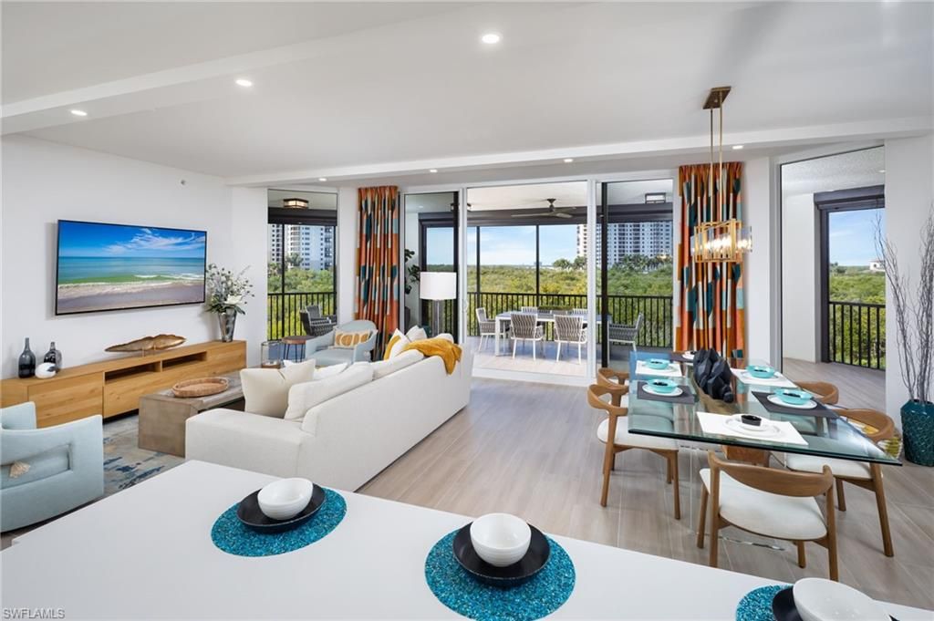 Come home to this Castella “Home in the Sky” and enjoy unparalleled water views and sunsets of Estero Bay and the Gulf of Mexico at The Colony Golf & Bay Club!!! Step into this welcoming, totally reimagined, and fully renovated home filled with natural light and spacious luxury living. This newly renovated Castella Home in the Sky was designed by Clive Daniel and renovated by Imperial Homes of Naples. This redesigned kitchen is a chef’s dream with an expanded center island featuring new glass front cabinets, new countertops, new custom backsplash, under cabinet lighting, counter height breakfast bar, built-in appliances, and a pantry! The peaceful, spacious master bedroom offers picturesque views of Estero Bay, including spectacular sunsets! The master suite also features a well thought designed custom closet, along with a new luxurious master bath newly designed with new tile, custom mirrors, wall treatment, new countertops, a separate shower, dual vanities, and a dedicated makeup vanity area. Additional features of this newly designed Castella home include wood look wide plank tile flooring throughout, custom window treatments, Clive Daniels furnishings, volume ceilings, electric remote hurricane screen shutters, a formal dining area with new lighting, and a spacious family room great for entertaining! Enjoy the natural light and sunsets with floor-to-ceiling sliding glass doors, and lanai access from your master suite and your guest suite! Both guest suites have been updated with wood look wide plank tile flooring and an updated guest bath with new custom tile and dual vanity for your guests! Entertaining is a delight on the oversized, spacious lanai featuring three separate sitting areas, which is perfect for watching the sunsets! Luxury living at Castella offers every element for recreation and relaxation, including a resort-style pool and spa with newly renovated amenities. Castella also features a stunning tropical open-air lobby with a waterfall, offering a true “welcome to paradise” experience. The Colony at Pelican Landing offers state-of-the-art amenities, including a 34-acre private beach park with a private water taxi shuttle, kayak park, pickleball courts, tennis, fitness center, bocce ball courts, and the list goes on and on! Residents also enjoy waterfront dining at The Colony Bay Club, featuring casual dining overlooking Estero Bay on the third floor and formal dining on the second floor—just minutes from your front door! THIS IS THE BEST OPPORTUNITY IN CASTELLA RIGHT NOW!!! DO NOT MISS OUT!!! SCHEDULE YOUR PRIVATE SHOWING TODAY AND BEGIN LIVING THE SOUTHWEST FLORIDA LIFESTYLE!!! THIS HOME IS MOVE-IN READY WITH ALL DESIGNER FURNISHINGS INCLUDED!! COME SEE YOUR NEW HOME IN PARADISE TODAY!!