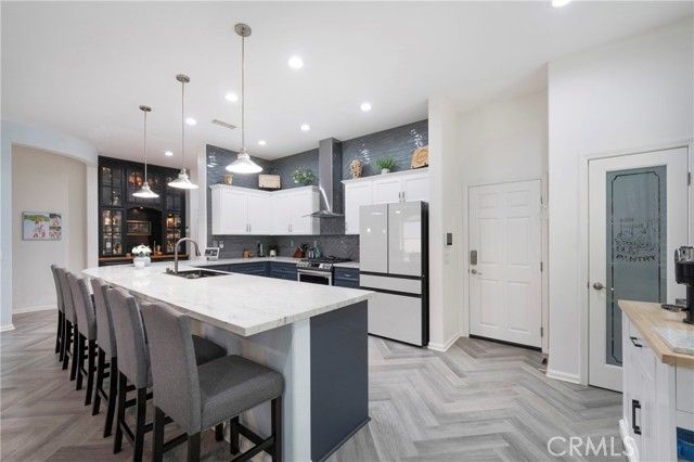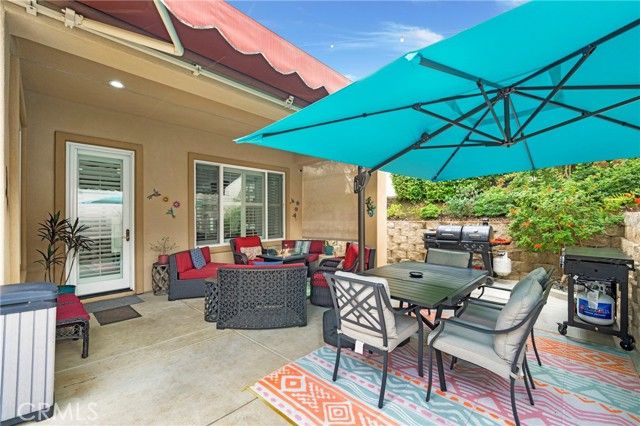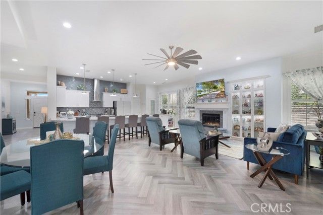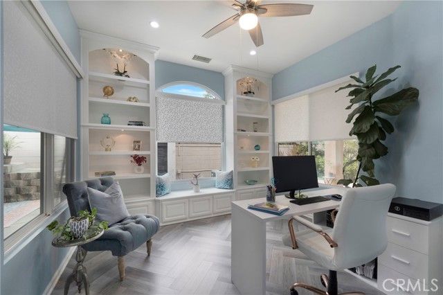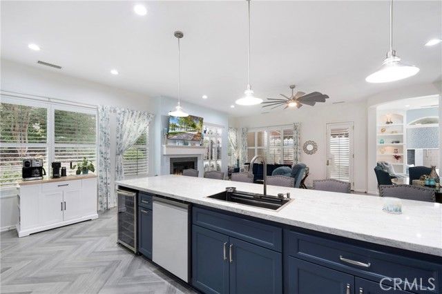 This impeccably remodeled single-story gem captures the effortless Trilogy lifestyle. Boasting two bedrooms + office, this turnkey residence shines with a fully remodeled kitchen and bathrooms, brand-new flooring throughout, and thoughtful upgrades at every turn. Step inside to an open living room featuring a built-in bar – the perfect entertaining hub. The cozy family room invites relaxation with a fireplace ideal for fireside conversations. The heart of the home is the stunning remodeled kitchen, complete with a spacious counters, pull out shelves in lower cabinets, bar-top seating, sleek countertops, and modern finishes designed for both casual dining and hosting. Retreat to the generous primary suite with direct access to an outside patio, a spa-like primary bath showcasing a large walk-in shower with bench and rainfall shower head, dual vanities, and an expansive walk-in closet. The second bedroom is perfect for guests. A versatile office with built in book shelves overlooks a low maintenance back patio. The beautifully updated guest bath complete the interior. Outside, enjoy living on the private patio with electric retractable awning – perfect for shaded gatherings or quiet mornings. Additional features include double-pane windows with plantation shutters, smart ceiling fans, and new flooring that flows seamlessly throughout. The Trilogy community features fitness centers, pools, tennis, pickleball, bocce, and the award-winning Glen Ivy Golf Course – all surrounded by rolling hills and natural beauty.