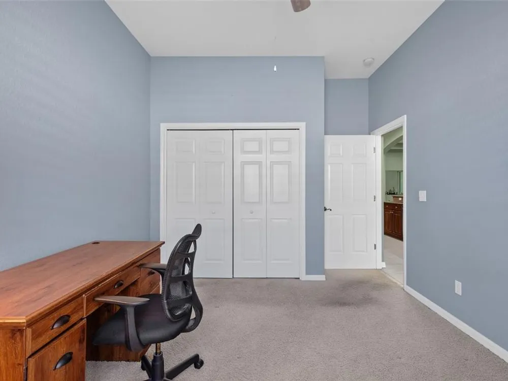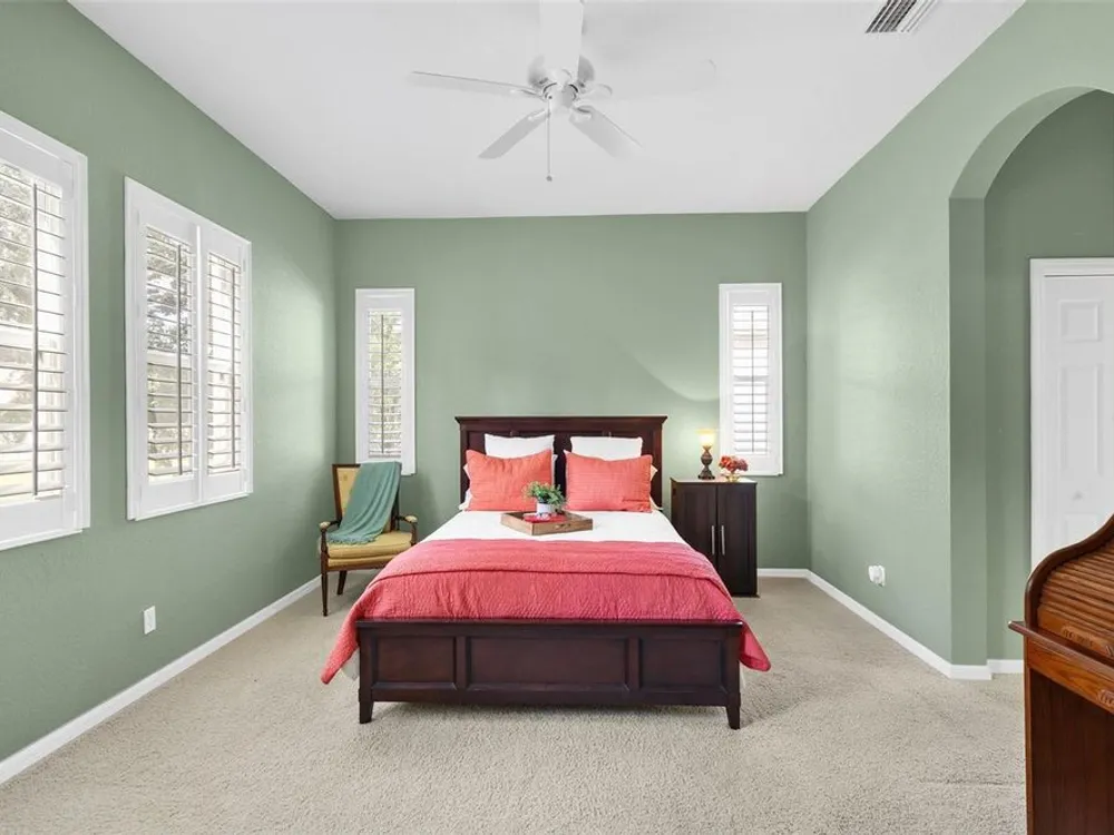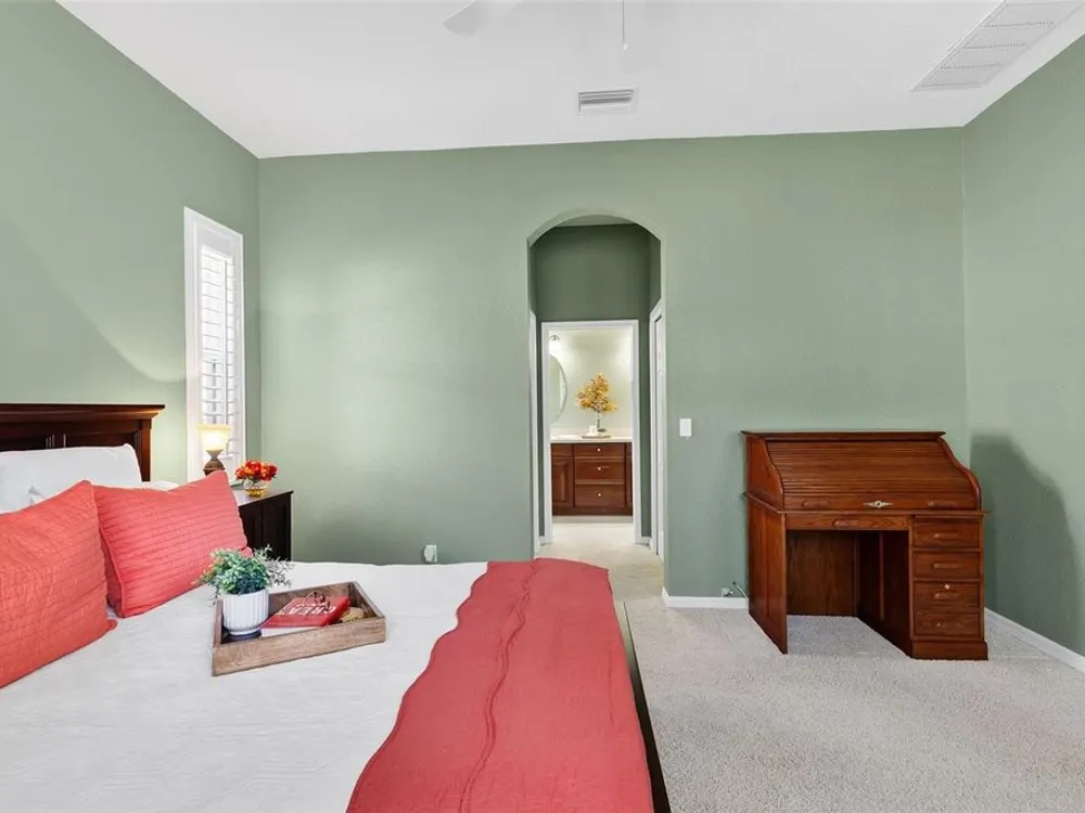 - Kitchen/Family Room Combo, Living/Dining Room, Main Level Primary, Split Bedrooms, Stone Counters, Thermostat, Walk-In Closet(s), Window Treatments