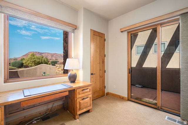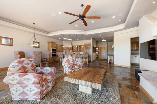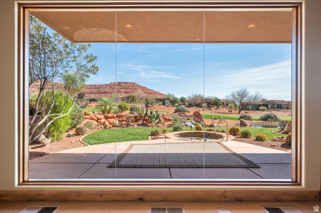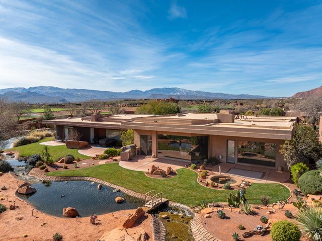 Set along the 5th fairway of Entrada at Snow Canyon, this exceptional single-level residence offers a rare combination of privacy, views & tranquil water features. Positioned w/generous common-area separation, enjoy a peaceful setting while capturing sweeping vistas of Kachina Cliffs, red rock formations & surrounding golf course. A natural stream and water feature flows behind the property, providing a calming backdrop of moving water, enhancing the serene outdoor ambiance. Designed for both comfort and elegance, the home features an open layout filled with natural light, multiple fireplaces, and seamless indoor-outdoor living. The kitchen is appointed with Sub-Zero and Wolf appliances, while additional highlights include a built-in outdoor barbecue, in-ground hot tub, and a flexible office or 4th bedroom with views. The thoughtful floor plan balances everyday living with effortless entertaining. Enjoy Entrada's renowned amenities including championship golf, resort-style pools, fitness center, pickleball and tennis courts, scenic walking trails, & gated security, all within one of Southern Utah's most prestigious communities. This is luxury desert living at its finest-where views, privacy, and lifestyle come together effortlessly.