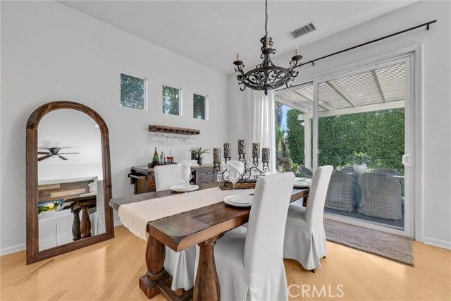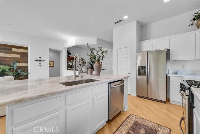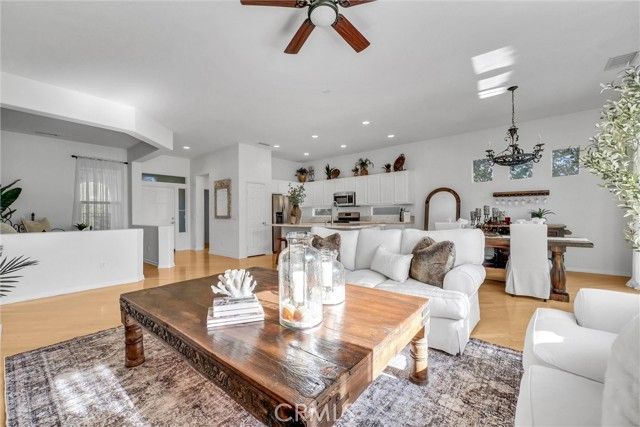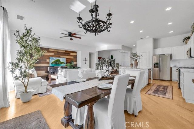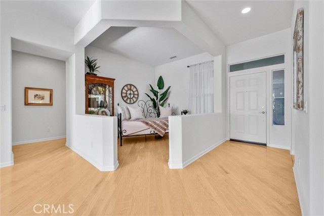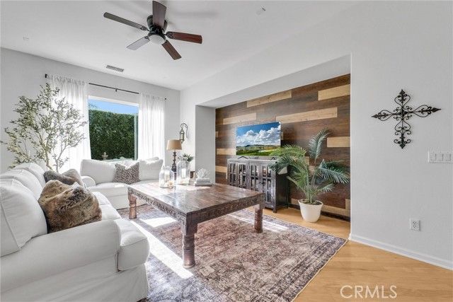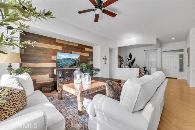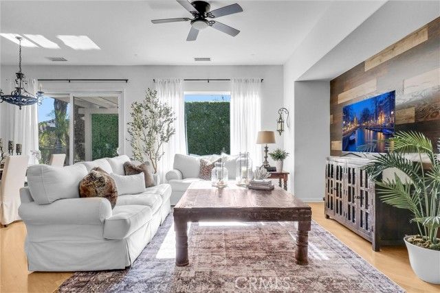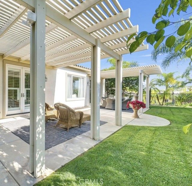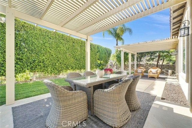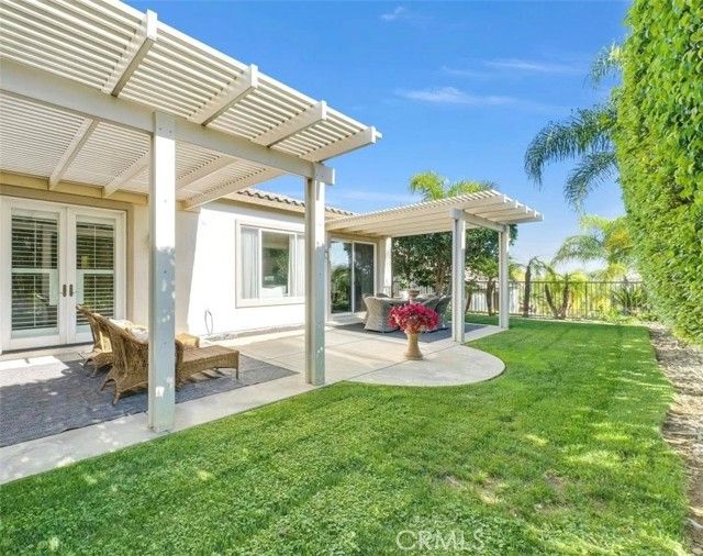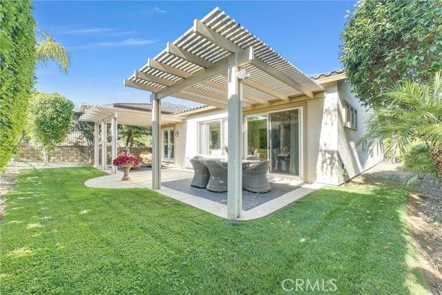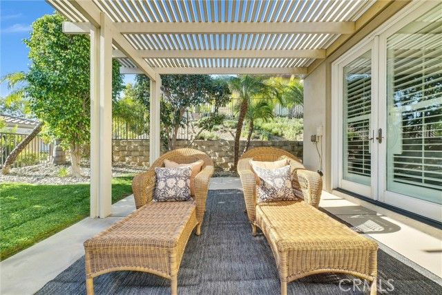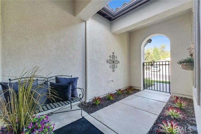 Welcome to this beautiful single-story home where relaxed California comfort meets luxury. This home offers a serene, open, light filled, and seamless indoor-outdoor flow. A private gated courtyard creates a striking first impression—an intimate, tranquil entry that sets the tone for the elegance found throughout the home. Inside, soaring ceilings, wood flooring, and designer finishes create a sense of understated sophistication, while expansive living spaces are bathed in natural light. At the center of the home, the gourmet kitchen is both beautiful and functional—featuring crisp white cabinetry, stainless steel appliances, and an oversized island designed for gathering, entertaining, and everyday indulgence.The open-concept layout effortlessly connects the kitchen, dining, and living areas, offering a grand yet inviting space ideal for hosting. Walls of sliding glass doors blur the line between indoors and out, creating a true extension of the living space. Step into your private backyard retreat to enjoy your morning coffee or gorgeous sunsets with a glass of wine. Pergola-covered areas provide distinct spaces for alfresco dining, lounging, and year-round enjoyment. Surrounded by lush, mature landscaping, the grounds offer both beauty and seclusion, evoking a peaceful, resort-like atmosphere. The luxurious primary suite serves as a serene sanctuary, complete with direct outdoor access and a spa-inspired feel. The additional bedroom is generously sized, offering comfort for guests, family, or can be used as a home office. Located in one of the most desirable communities, this home offers a rare combination of privacy, sophistication, and lifestyle—just moments from Glen Ivy Golf Course, resort like indoor and outdoor pools and spa, scenic trails, parks, and premier local amenities. An exceptional property that embodies modern California elegance and resort-style living at its finest.