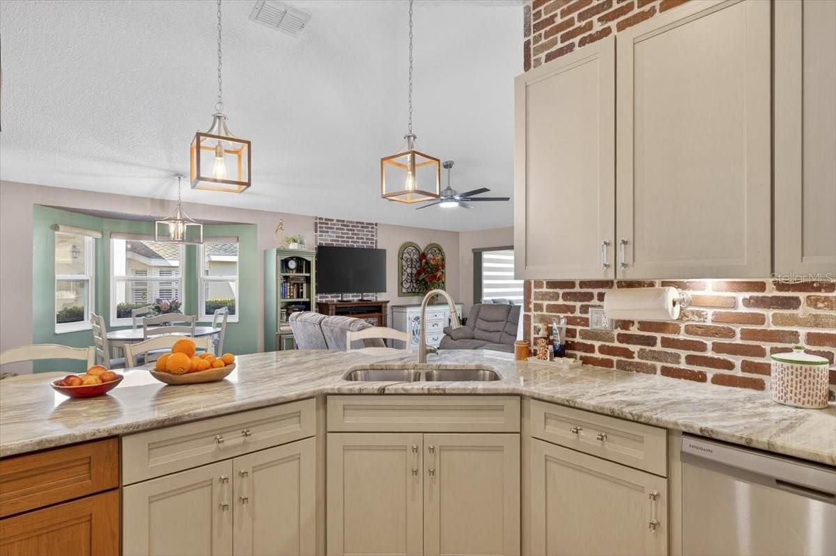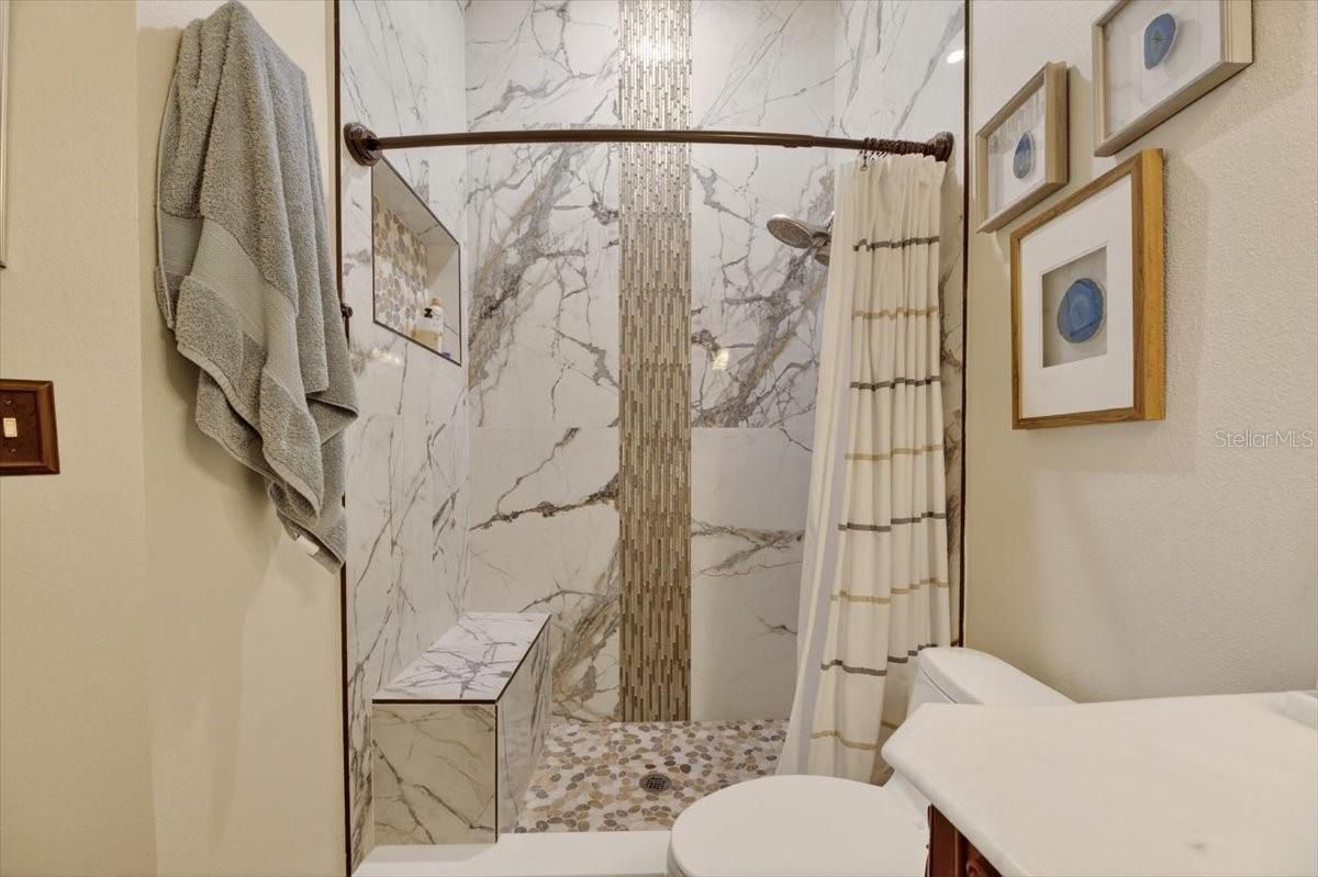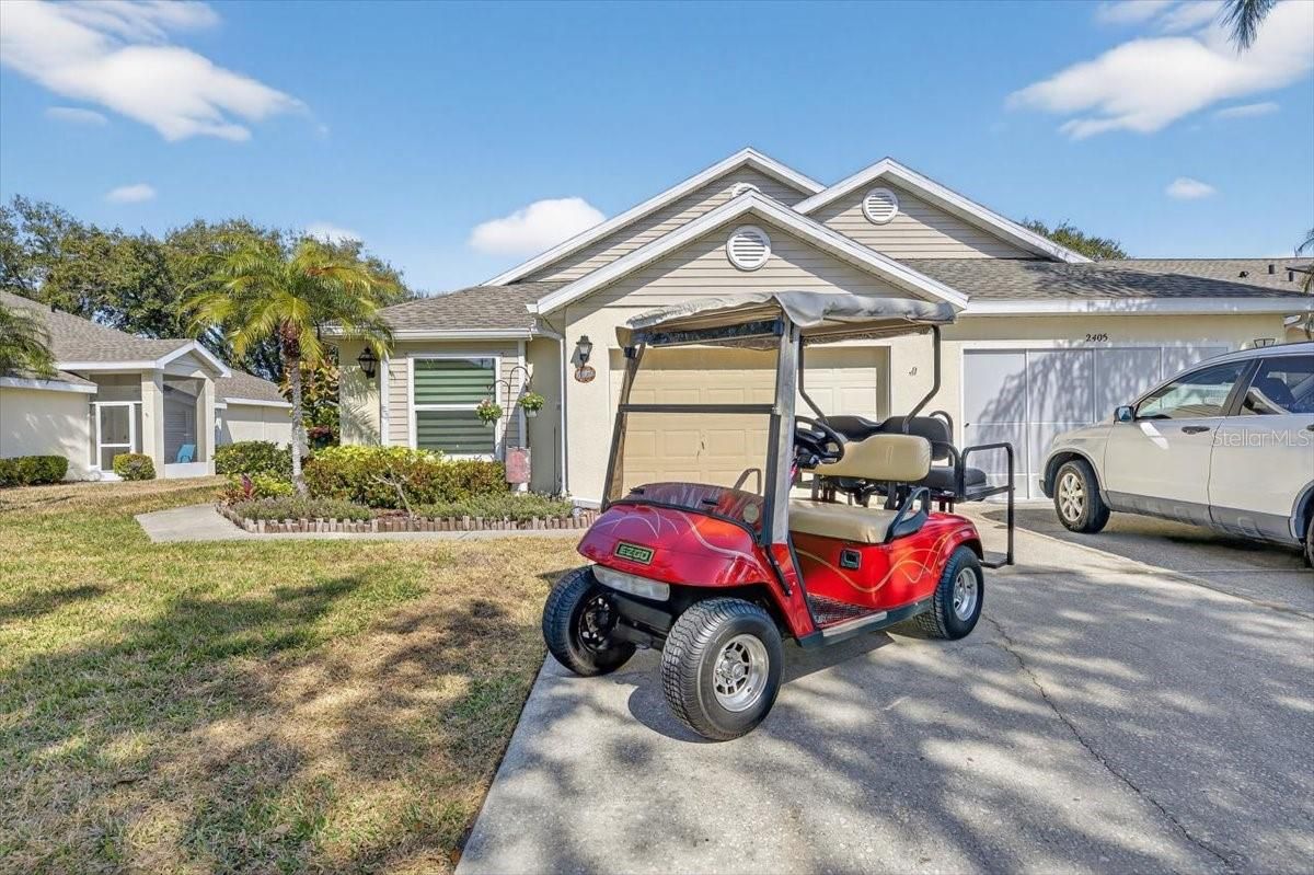 Beautifully renovated and luxuriously upgraded, this stunning 2-bedroom, 2-bath home in the highly sought-after 55+ Kings Point community seamlessly blends modern comfort with timeless elegance. This affordably priced, maintenance-free condo is spectacular throughout. Featuring real brick accent walls, stylish flooring, elegant two-panel doors, hurricane-impact windows, designer lighting and fans, custom Hunter Douglas day/night blinds, and matching SunSetter electric awnings. This residence offers true sophistication at every turn. The gourmet kitchen showcases 42" KraftMaid cabinetry, level 4 granite countertops, a breakfast bar and wine bar, under cabinet lighting and premium appliances. The Samsung smart washer and dryer set stays with the home. Both bathrooms have been fully remodeled with floor-to-ceiling tile, new vanities, high-end fixtures, comfort-height toilets and the primary suite boasts a luxurious walk-in shower with a rain shower head and built-in bench. Additional highlights include a cozy electric fireplace, cypress wood ceiling in the bonus room, custom pantry door, California Closet systems in every closet, AND a golf cart. The 1 1/2 car garage offers pull down attic stairs and built-in overhead storage. Outdoor living is enhanced by remote-controlled SunSetter awnings, a patio with decorative iron fencing is perfect for pets and entertaining. New seamless gutters were just installed. A new roof was installed in January 2026. There's nothing to do here but move-in and start enjoying the Kings Point lifestyle. Residents of Kings Point enjoy world-class amenities including two spectacular clubhouses, six heated pools, hot tubs, fitness centers, golf courses, tennis, pickleball, billiards, an 850-seat theater, the Serenity Spa and countless clubs and social events—all within a secure, gated community offering 24/7 security, free paramedic and ambulatory services, and condo fees that cover high-speed internet, premium cable, water, sewer, landscaping, exterior maintenance, pest control, trash, roof, building insurance, and lower taxes. With a free transportation system, golf-cart access to shopping and dining, and close proximity to Florida’s top attractions including beaches, Disney, Busch Gardens, and Tampa’s cruise port, this exquisite home offers the ultimate in luxury, lifestyle, and peace of mind—an exceptional opportunity to experience resort-style living at its finest.
