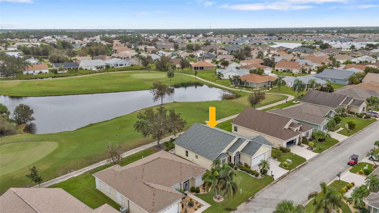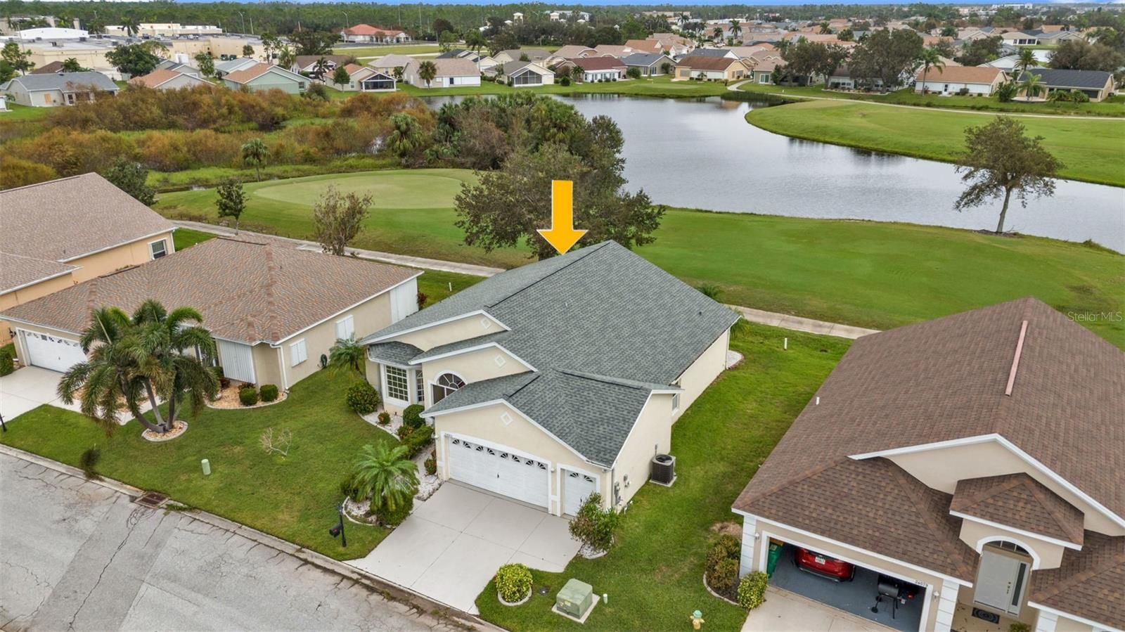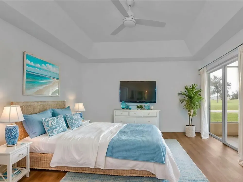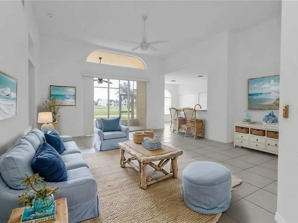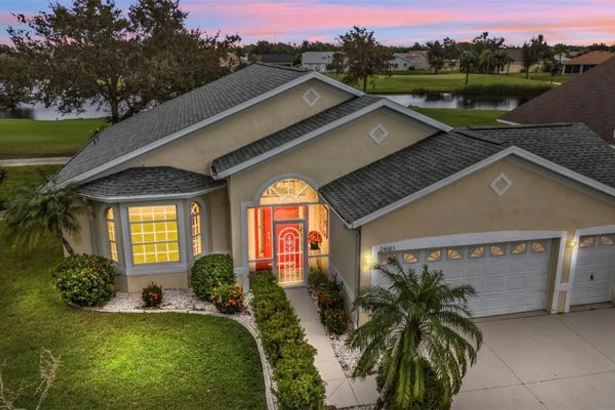 One or more photo(s) has been virtually staged. Rarely available NOTTINGHAM floor plan in the gated golf course/active resort of highly desirable Kings Gate, a 55+ community (evacuation zone D - have not been under any evacuation order, NOT in a flood zone - no flood insurance required). This 2 1/2 CAR GARAGE home has extensive updates (AC 2021, Roof 2022, updated kitchen counters, cabinets and SS appliances from 2024, both bedrooms with updated LVP flooring and both bathrooms updated as well). Come enjoy the SENSATIONAL VIEW of the 8th and 7th holes along with the water/nature view this home provides. Step inside and you'll notice the HIGH ceilings - the large living room - before gazing out to the lanai and external paver patio along with that A+ view. The open concept floor plan connects the kitchen - living room - lanai seamlessly. To the front left is a bonus room - could be used as a 2nd TV room, an office/den or even a third bedroom depending on your lifestyle. The guest bedroom with two large closets (great for storage) has its own entrance to the guest bathroom. The master bedroom has sliders to the lanai and a master bathroom with large tub, separate shower and dual sinks. This house has a LIKE NEW feel to it with all the updates/upgrades. And if you haven't been to Kings Gate before - you're going to love the options for activity (Olympic size heated swimming pool and spa, tennis courts, pickle ball, lawn bowling, shuffle board, bocce, horseshoes, gym, billiards, library, euchre, bingo, bridge, Texas hold em, poker, mahjong and more). The onsite AND NEWLY REMODELED Lions Den restaurant and bar is super convenient and also offers Tuesday night Karaoke and monthly trivia contests. Many residents love the fact that they are just a golf cart ride away from the Winn Dixie shopping plaza that provides you access to grocery store, drug store, bank, restaurants and shopping. Want to explore outside of Kings Gate – you are minutes away from the restaurants and shops of downtown Punta Gorda and Fisherman's village. And if you want to explore more of Florida's fun spots you’re near I75 to quickly head north or south. An AWESOME and very RARE home that is totally updated with a GREAT VIEW in a PREMIER gated community needs to be on your list. Call today for a private showing and a golf cart tour of the community/amenities.