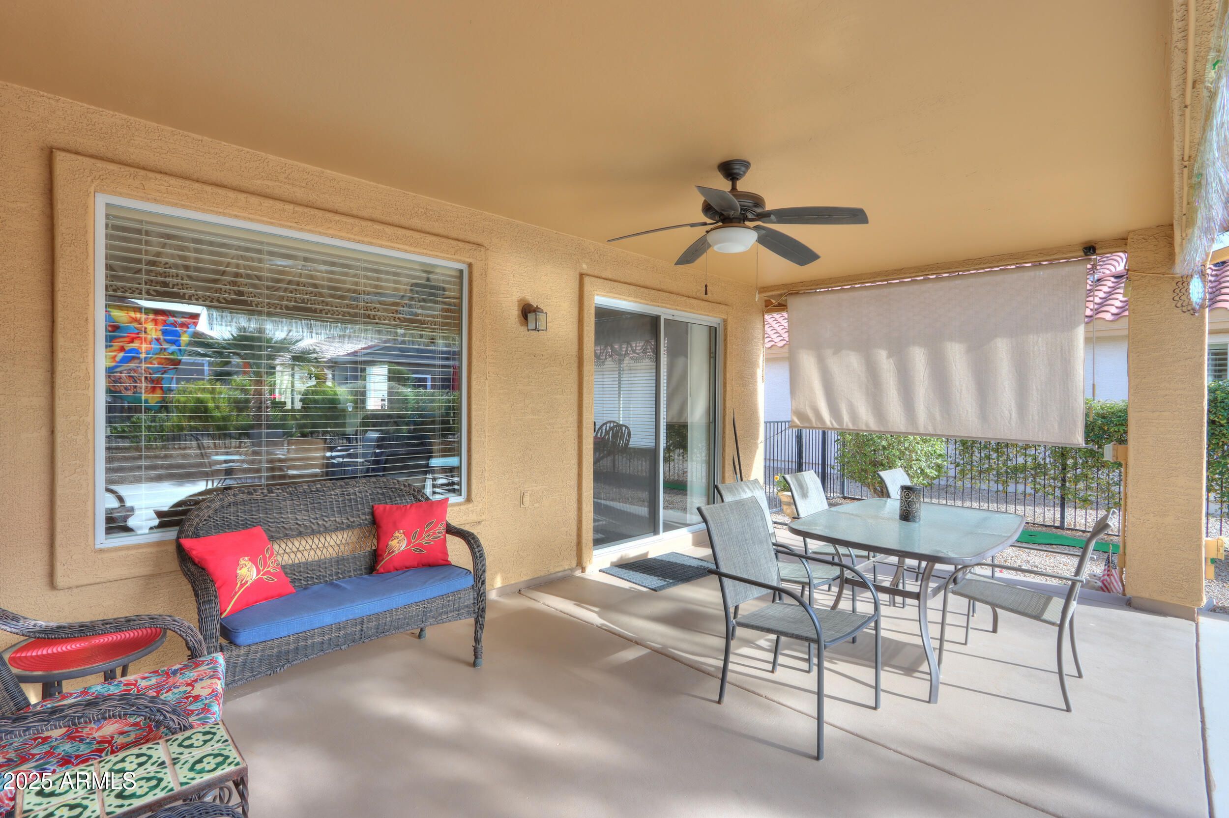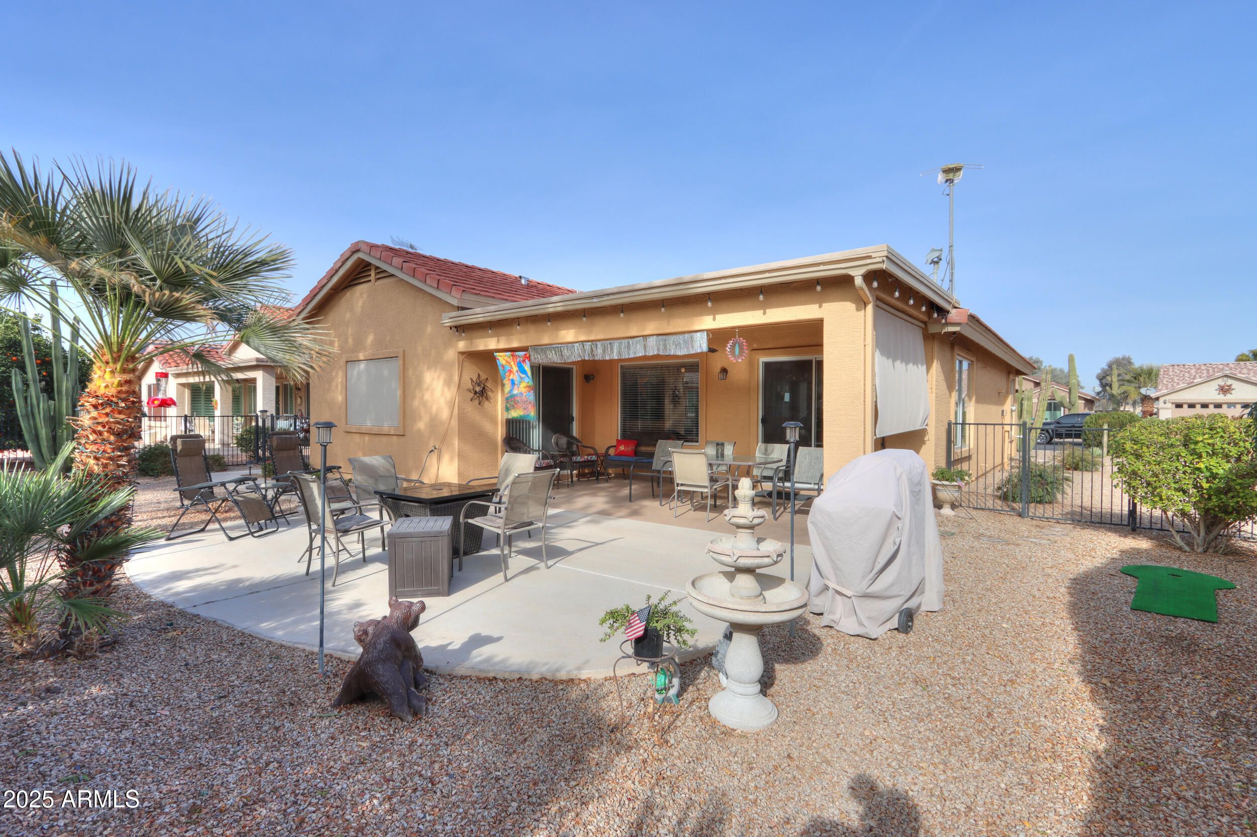 Charming 2-Bed, 2-Bath Home in Mission Royale! Discover this beautifully upgraded home in the highly sought-after Mission Royale Active Adult Community! New heat pump in 2025! Featuring staggered floor tiles, quartz countertops, stainless steel appliances and tile backsplash. The kitchen is a chef's delight with upgraded cabinets. The primary suite boasts double sinks and a walk-in shower, as well as a large walk in closet and sliding glass door for easy access to your back yard! Enjoy outdoor living on the extended back patio in your fenced-in yard with desirable north-south exposure. New garage door opener in 2025. Added security door for peace of mind. Don't miss this stunning home!