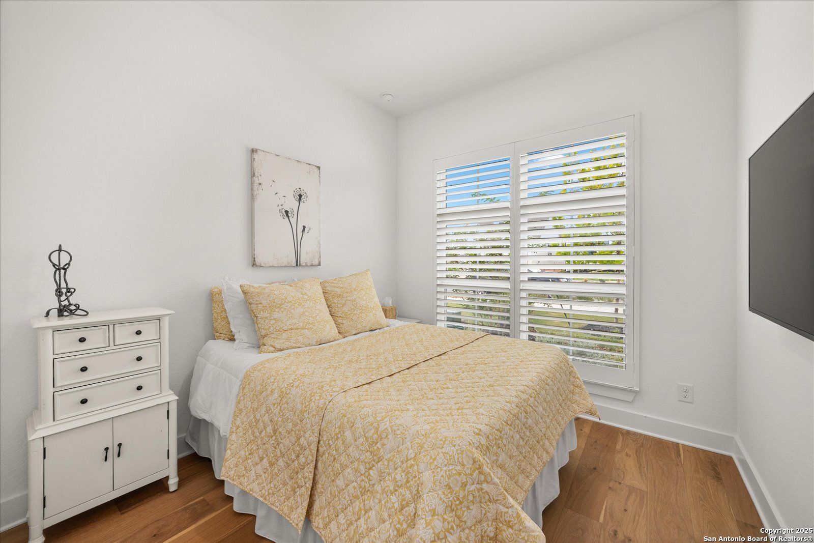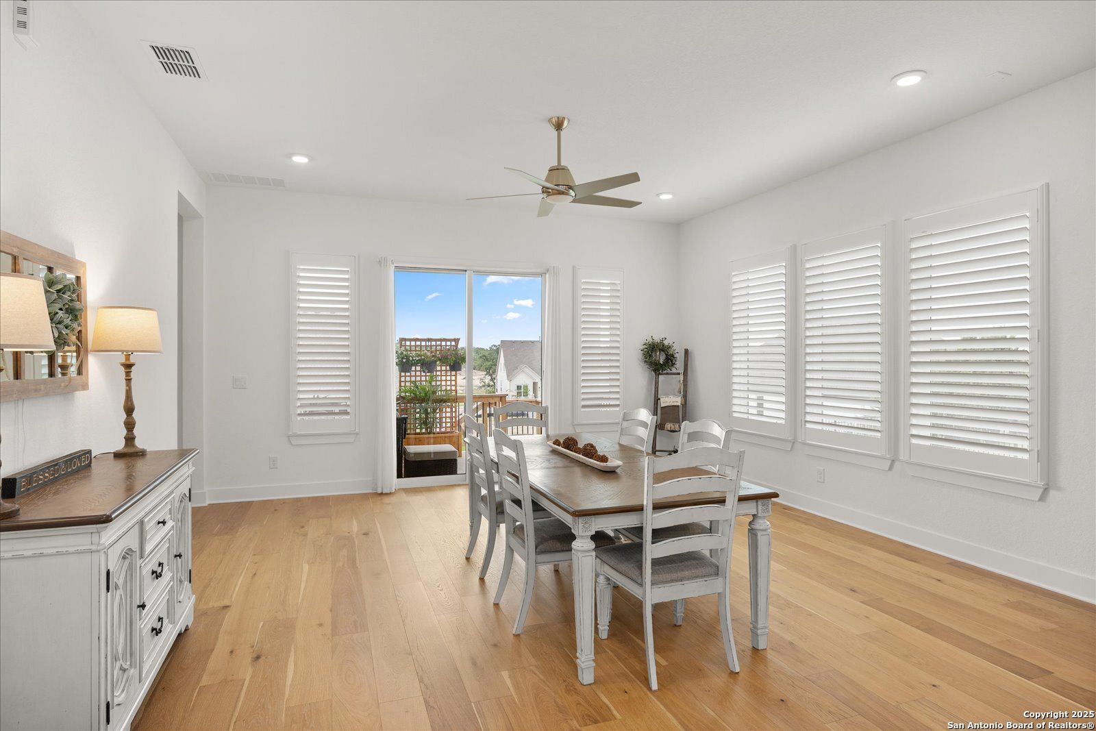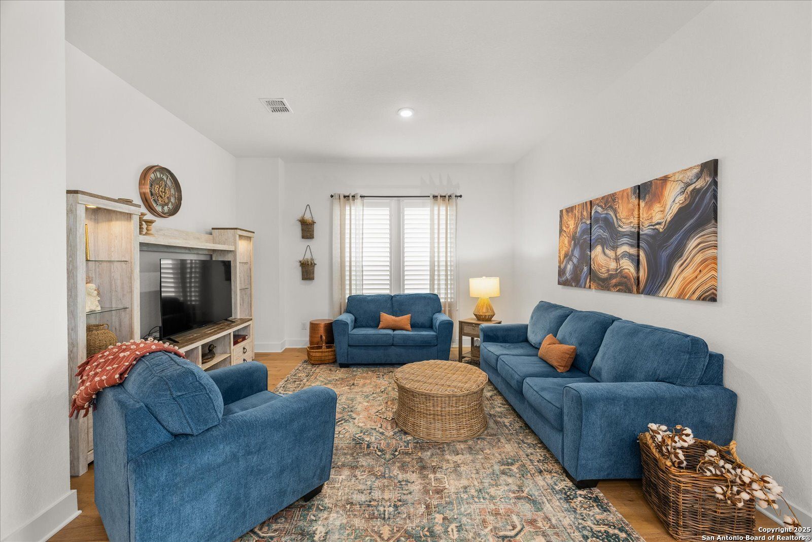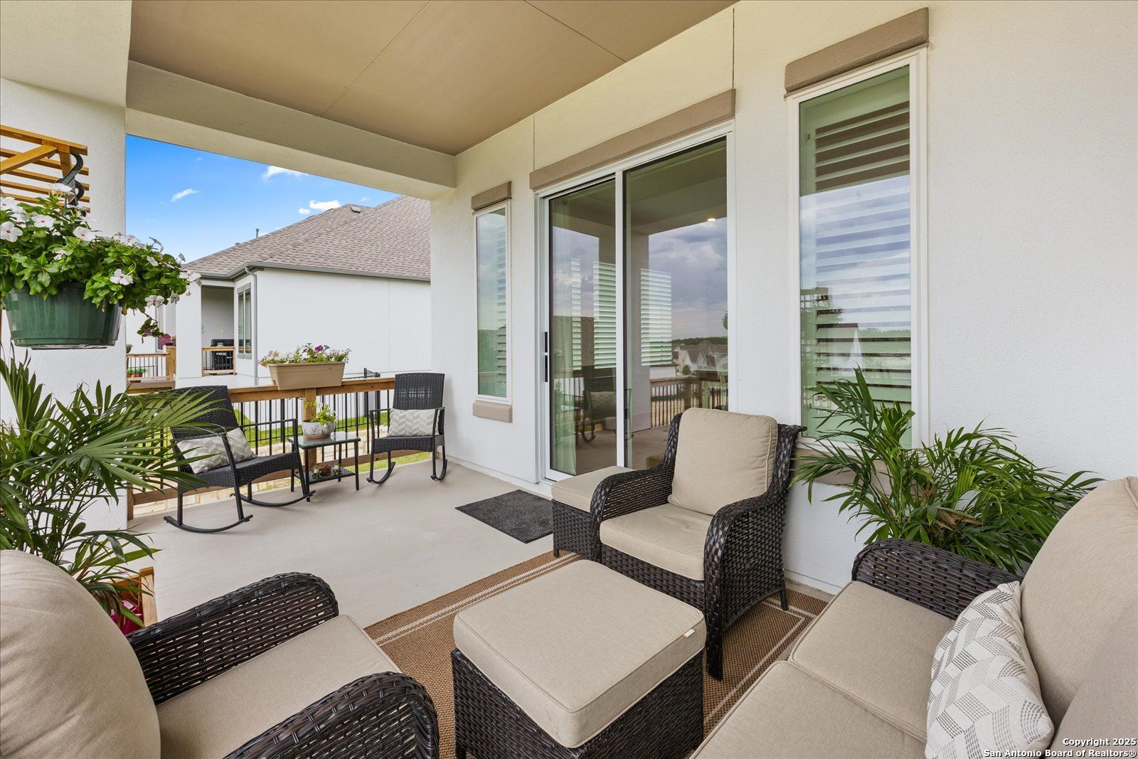 Welcome to 241 Sentido, a beautifully designed single story home located in the highly sought-after gated community of Regency at Esperanza, Boerne's vibrant active 55 plus community! This nearly new home offers 2 bedrooms, 2 full bathrooms, a 2 car attached garage; all thoughtfully designed for comfort, convenience and style. Upon entering, you will will immediately notice the gorgeous engineered wide plank flooring throughout, as well as an open concept layout featuring a light filled dining area, a large kitchen island, walk-in pantry, built-in stainless appliances and quartz counters. Custom plantation shutters have been added to all of the windows already, so there is literally nothing for you to do other than just move right in. The family room is located off the kitchen and provides a private space for gatherings. The spacious primary bedroom suite is located in the rear corner of the house, creating privacy from the guest bedroom. The primary bathroom includes a beautiful quartz double vanity, a frameless glass shower and a large walk-in closet with built-in features. The guest bedroom is located in the front of the home off the entry and has access to the gorgeous guest bathroom within a few feet. Work from home and need an office? There is a private study with french doors that is ideal for the work from home buyer. You will also appreciate the spacious laundry room, as well as the black hardware throughout that really stands out from the standard chrome often found in other homes. The rear covered patio is a perfect place to sit and have your morning coffee or evening glass of wine, while also having the benefit of green space on one side of the house, creating even more privacy. Built less than a year ago and better than new, this home boasts all of the benefits of new construction, but without the wait! Enjoy the ease of single level living in a home that has been so gently lived in and meticulously maintained, you will feel you are in the model home! The activities offered within this 55 plus community are literally endless! From pickleball, to corn hole, to Aqua Fitness, to card groups to Bocee ball and many more, it's impossible to be bored! Such a lifestyle awaits you here at 241 Sentido! If all of this isn't enough, you will also have full access to the all of the other amenities throughout the greater Esperanza community such as the lazy river, pool, dog park, walking trails and more! If you are in the market for a 55 and older community, want a gorgeous home that is essentially new and want to have access to an array of daily activities at your fingertips, you need to put 241 Sentido on your short list!