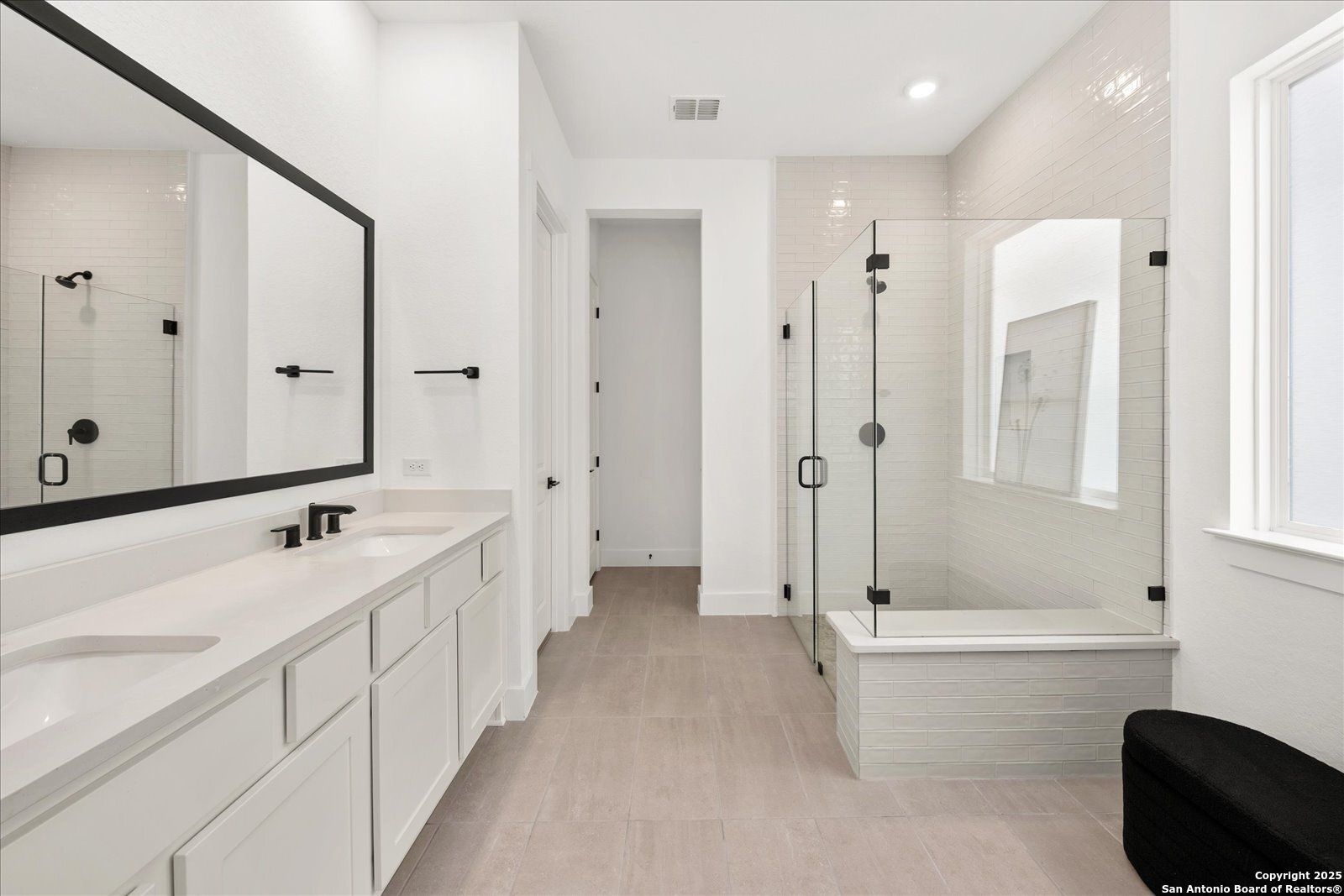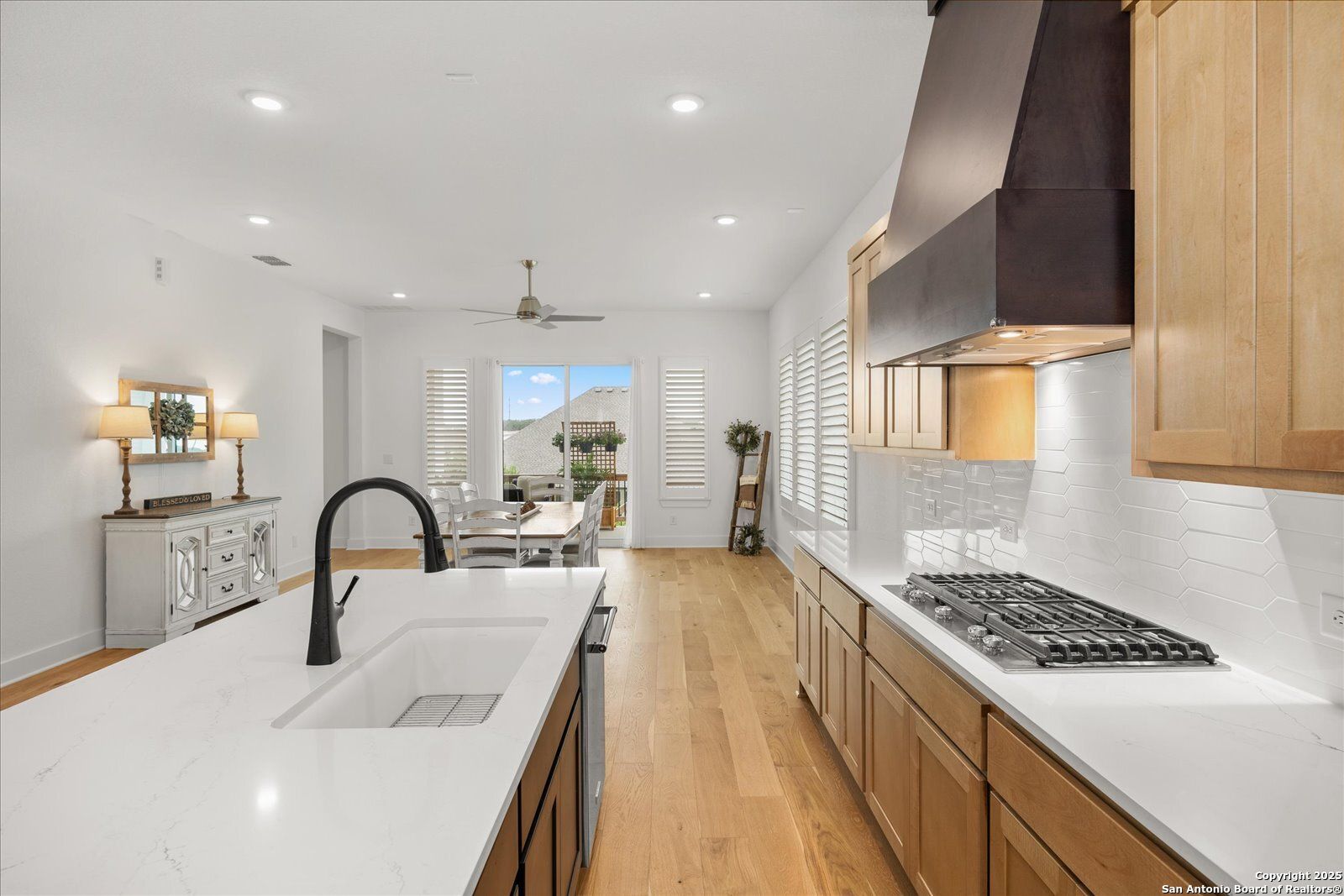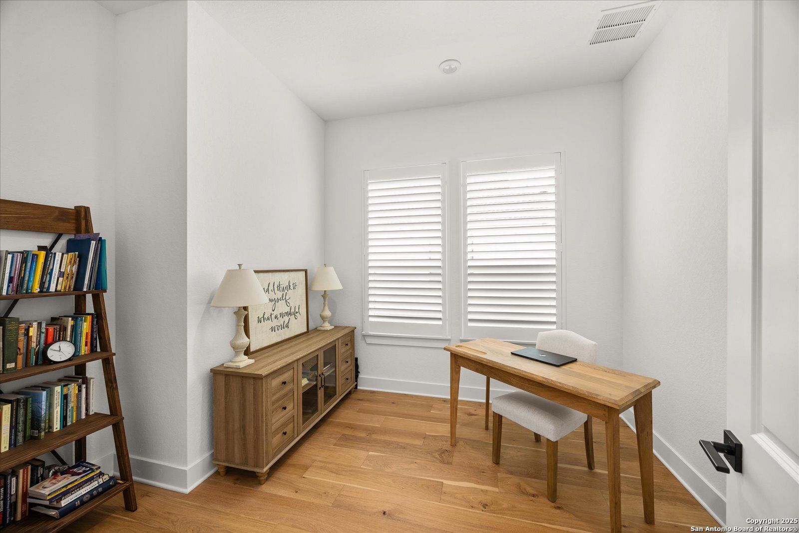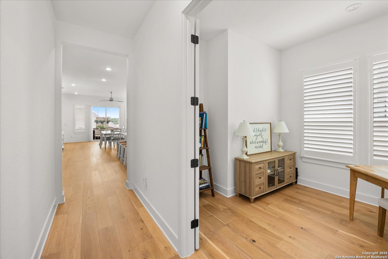 Welcome to 241 Sentido, a beautifully designed single story home located in the highly sought-after gated community of Regency at Esperanza, Boerne's vibrant active 55 plus community! This nearly new home offers 2 bedrooms, 2 full bathrooms, a 2 car attached garage; all thoughtfully designed for comfort, convenience and style. Upon entering, you will will immediately notice the gorgeous engineered wide plank flooring throughout, as well as an open concept layout featuring a light filled dining area, a large kitchen island, walk-in pantry, built-in stainless appliances and quartz counters. Custom plantation shutters have been added to all of the windows already, so there is literally nothing for you to do other than just move right in. The family room is located off the kitchen and provides a private space for gatherings. The spacious primary bedroom suite is located in the rear corner of the house, creating privacy from the guest bedroom. The primary bathroom includes a beautiful quartz double vanity, a frameless glass shower and a large walk-in closet with built-in features. The guest bedroom is located in the front of the home off the entry and has access to the gorgeous guest bathroom within a few feet. Work from home and need an office? There is a private study with french doors that is ideal for the work from home buyer. You will also appreciate the spacious laundry room, as well as the black hardware throughout that really stands out from the standard chrome often found in other homes. The rear covered patio is a perfect place to sit and have your morning coffee or evening glass of wine, while also having the benefit of green space on one side of the house, creating even more privacy. Built less than a year ago and better than new, this home boasts all of the benefits of new construction, but without the wait! Enjoy the ease of single level living in a home that has been so gently lived in and meticulously maintained, you will feel you are in the model home! The activities offered within this 55 plus community are literally endless! From pickleball, to corn hole, to Aqua Fitness, to card groups to Bocee ball and many more, it's impossible to be bored! Such a lifestyle awaits you here at 241 Sentido! If all of this isn't enough, you will also have full access to the all of the other amenities throughout the greater Esperanza community such as the lazy river, pool, dog park, walking trails and more! If you are in the market for a 55 and older community, want a gorgeous home that is essentially new and want to have access to an array of daily activities at your fingertips, you need to put 241 Sentido on your short list!