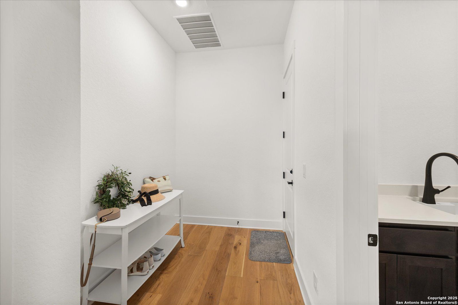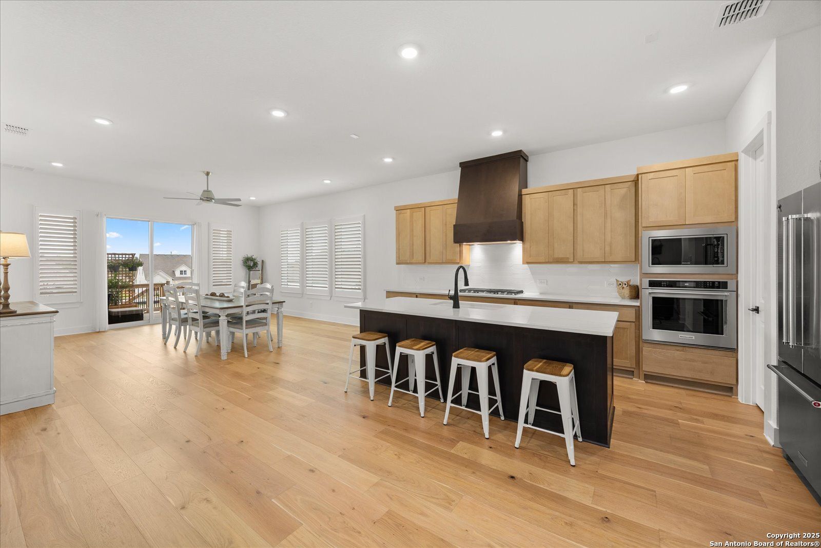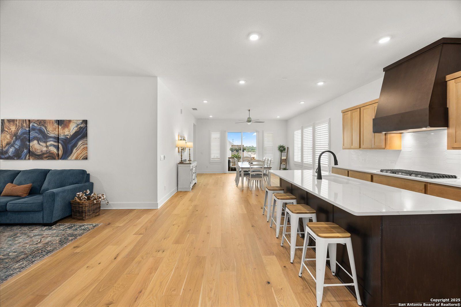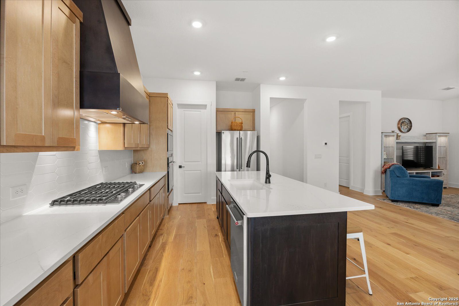 Welcome to 241 Sentido, a beautifully designed single story home located in the highly sought-after gated community of Regency at Esperanza, Boerne's vibrant active 55 plus community! This nearly new home offers 2 bedrooms, 2 full bathrooms, a 2 car attached garage; all thoughtfully designed for comfort, convenience and style. Upon entering, you will will immediately notice the gorgeous engineered wide plank flooring throughout, as well as an open concept layout featuring a light filled dining area, a large kitchen island, walk-in pantry, built-in stainless appliances and quartz counters. Custom plantation shutters have been added to all of the windows already, so there is literally nothing for you to do other than just move right in. The family room is located off the kitchen and provides a private space for gatherings. The spacious primary bedroom suite is located in the rear corner of the house, creating privacy from the guest bedroom. The primary bathroom includes a beautiful quartz double vanity, a frameless glass shower and a large walk-in closet with built-in features. The guest bedroom is located in the front of the home off the entry and has access to the gorgeous guest bathroom within a few feet. Work from home and need an office? There is a private study with french doors that is ideal for the work from home buyer. You will also appreciate the spacious laundry room, as well as the black hardware throughout that really stands out from the standard chrome often found in other homes. The rear covered patio is a perfect place to sit and have your morning coffee or evening glass of wine, while also having the benefit of green space on one side of the house, creating even more privacy. Built less than a year ago and better than new, this home boasts all of the benefits of new construction, but without the wait! Enjoy the ease of single level living in a home that has been so gently lived in and meticulously maintained, you will feel you are in the model home! The activities offered within this 55 plus community are literally endless! From pickleball, to corn hole, to Aqua Fitness, to card groups to Bocee ball and many more, it's impossible to be bored! Such a lifestyle awaits you here at 241 Sentido! If all of this isn't enough, you will also have full access to the all of the other amenities throughout the greater Esperanza community such as the lazy river, pool, dog park, walking trails and more! If you are in the market for a 55 and older community, want a gorgeous home that is essentially new and want to have access to an array of daily activities at your fingertips, you need to put 241 Sentido on your short list!