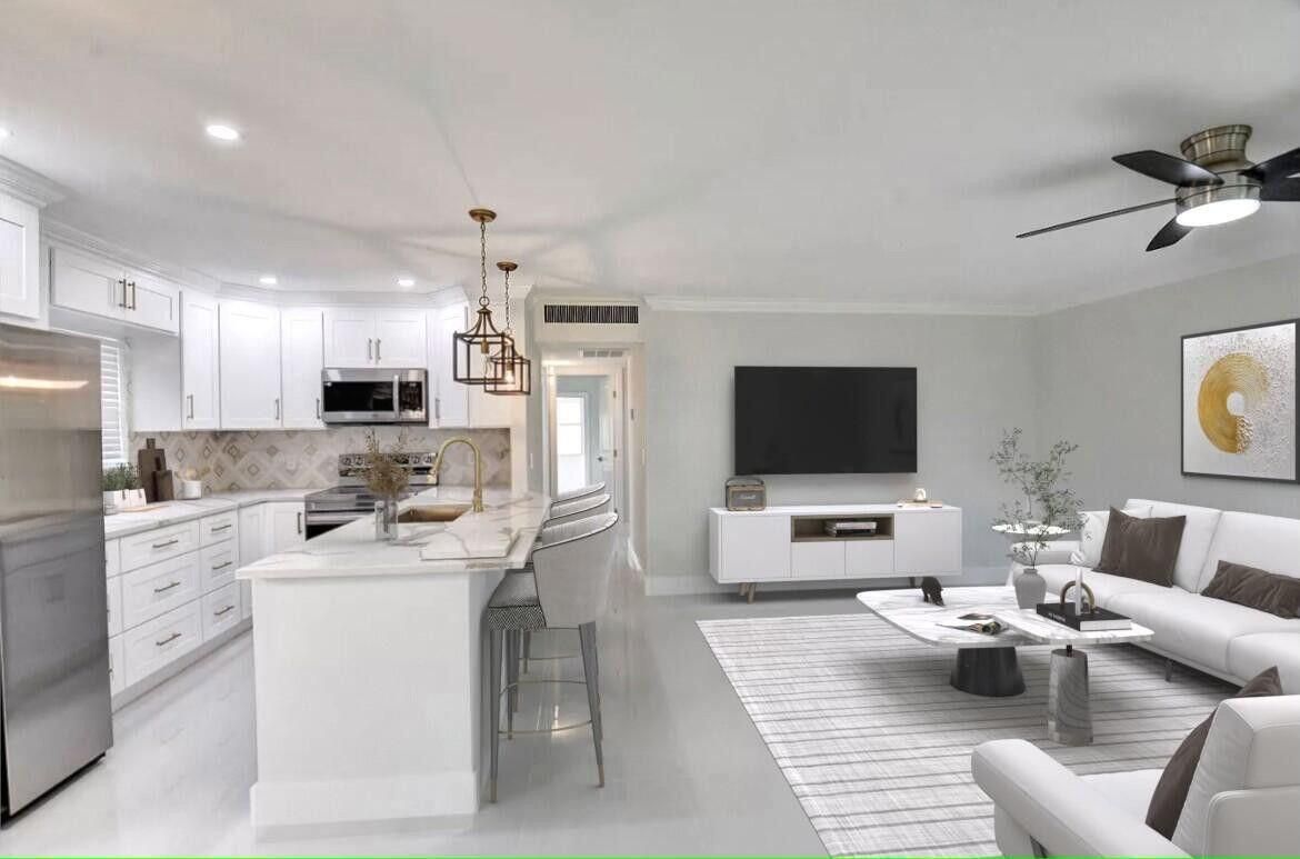 Fully renovated 55+ corner villa located in desirable Kings Point. This move-in-ready home features full impact windows and sliding doors, brand-new A/C, custom built-in closets, and modern porcelain tile flooring throughout. The completely updated kitchen showcases wood shaker cabinets, stainless steel appliances, and new finishes. Both bathrooms have been fully renovated, and the home offers fresh interior paint, no popcorn ceilings, and new appliances including washer and dryer. Thoughtfully upgraded from top to bottom—nothing left to do but move in!