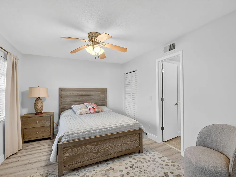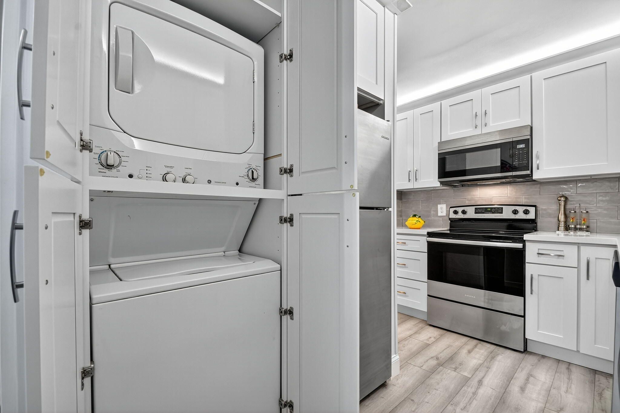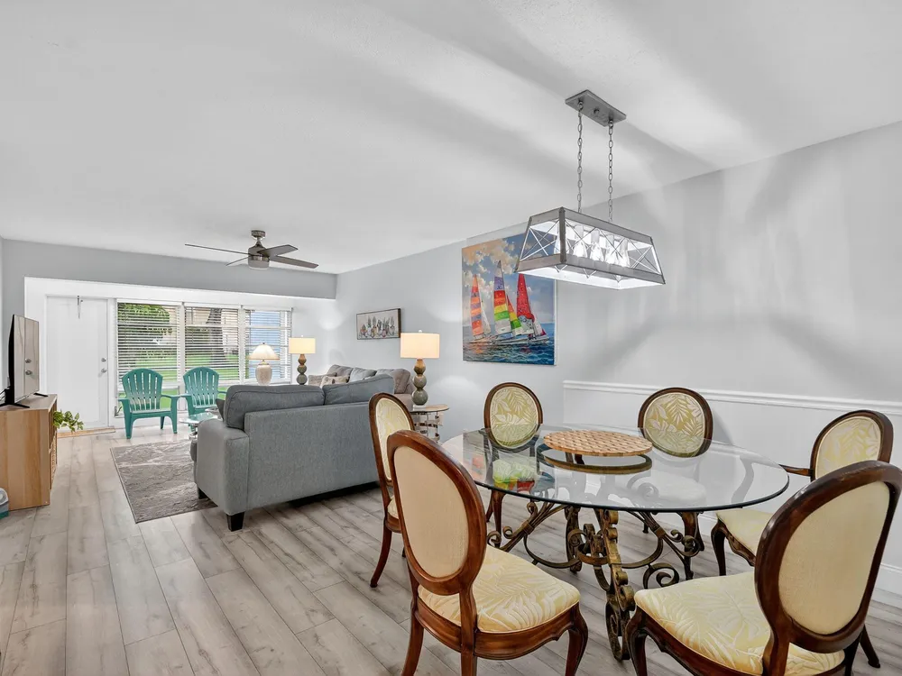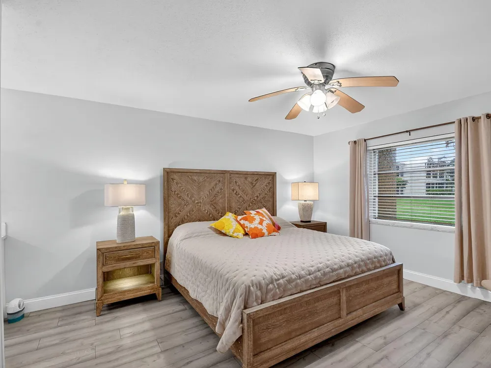 Beautiful 2/2 ground floor unit with washer and dryer inside. Renovated white kitchen with seamless quartz counter tops, newer SS appliances, and subway tile back splash. Master Bedroom features walk in closet and large ensuite bathroom. One of the best locations with an amazing green area views off the back patio. Updated electrical panel, newer AC, newer accordion shutters and new laminated waterproof flooring throughout. Desginated parking space 1069 right by your unit. This 55+ community is an extremely well maintained community offering social activities, 2 pools, hot tub, tennis, pickleball, boccie, shuffleboard, 2 exercise rooms and more! Snow bird ready home-make it yours!