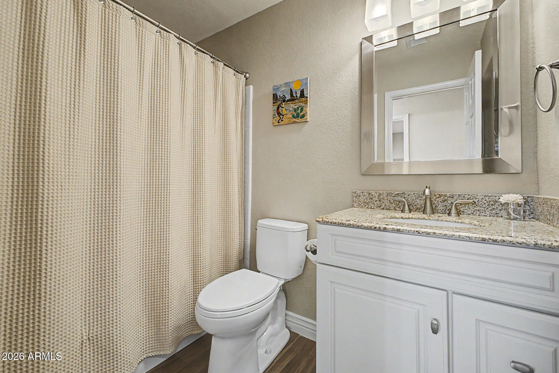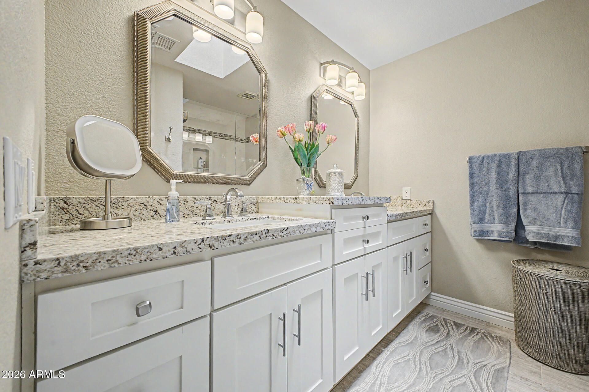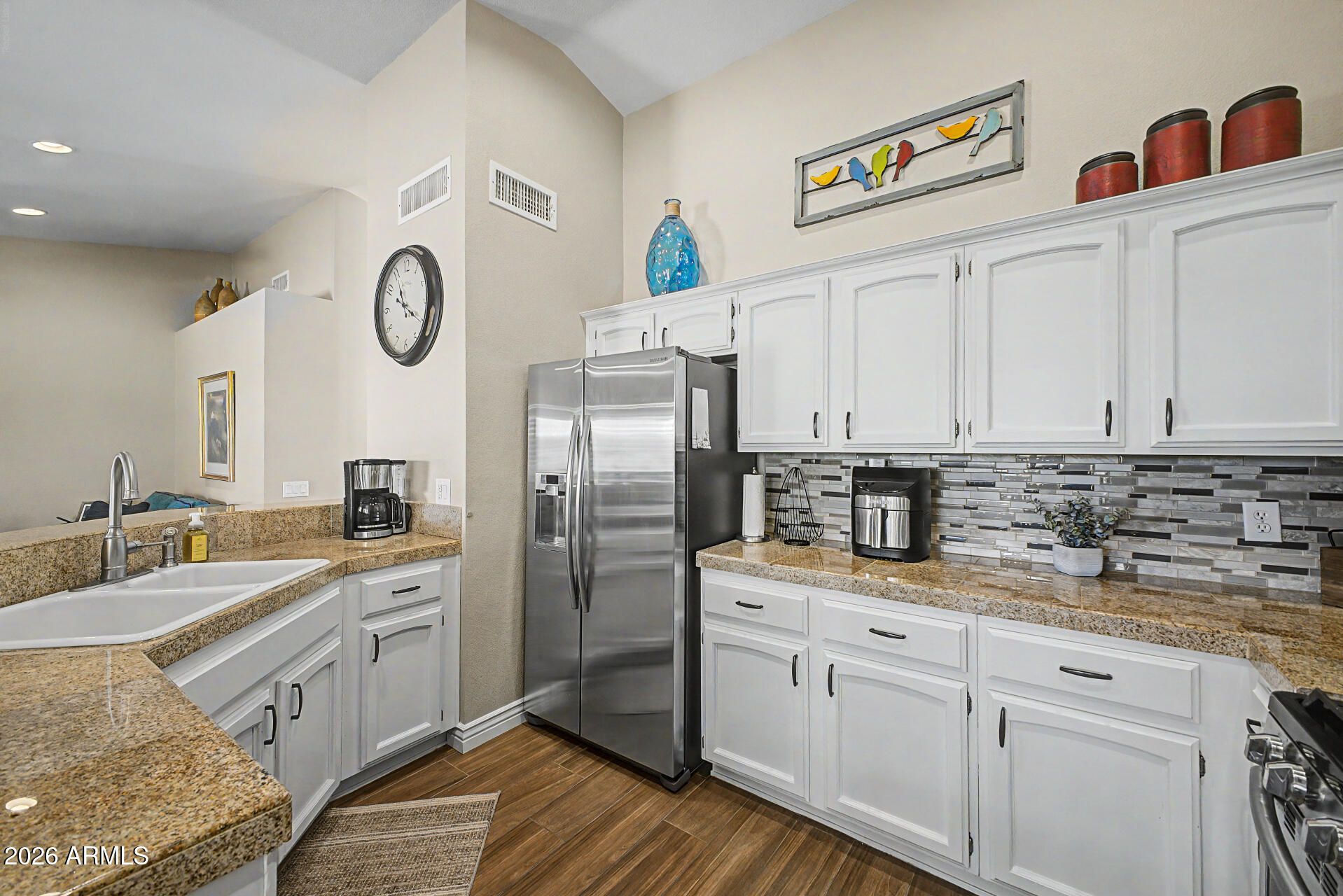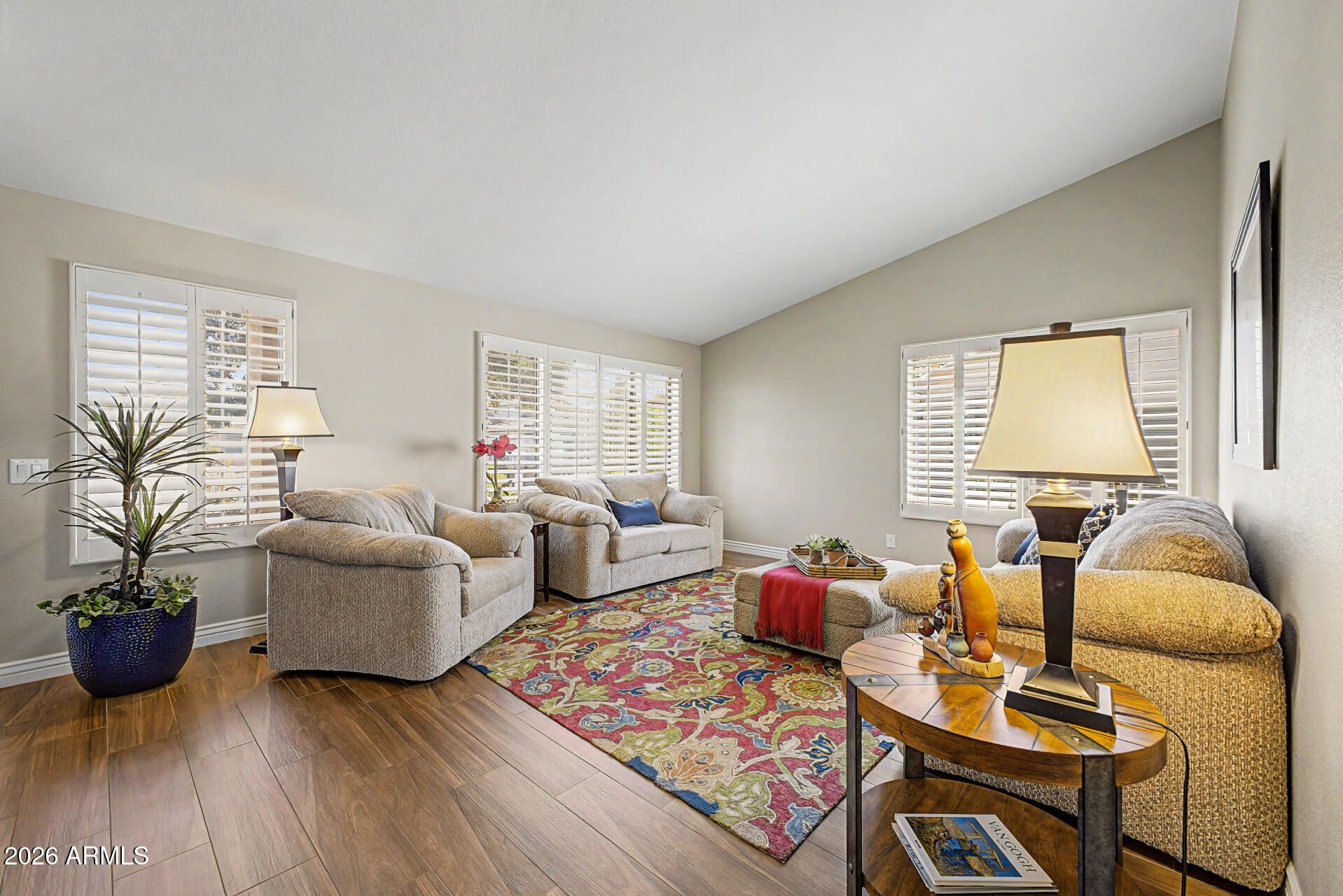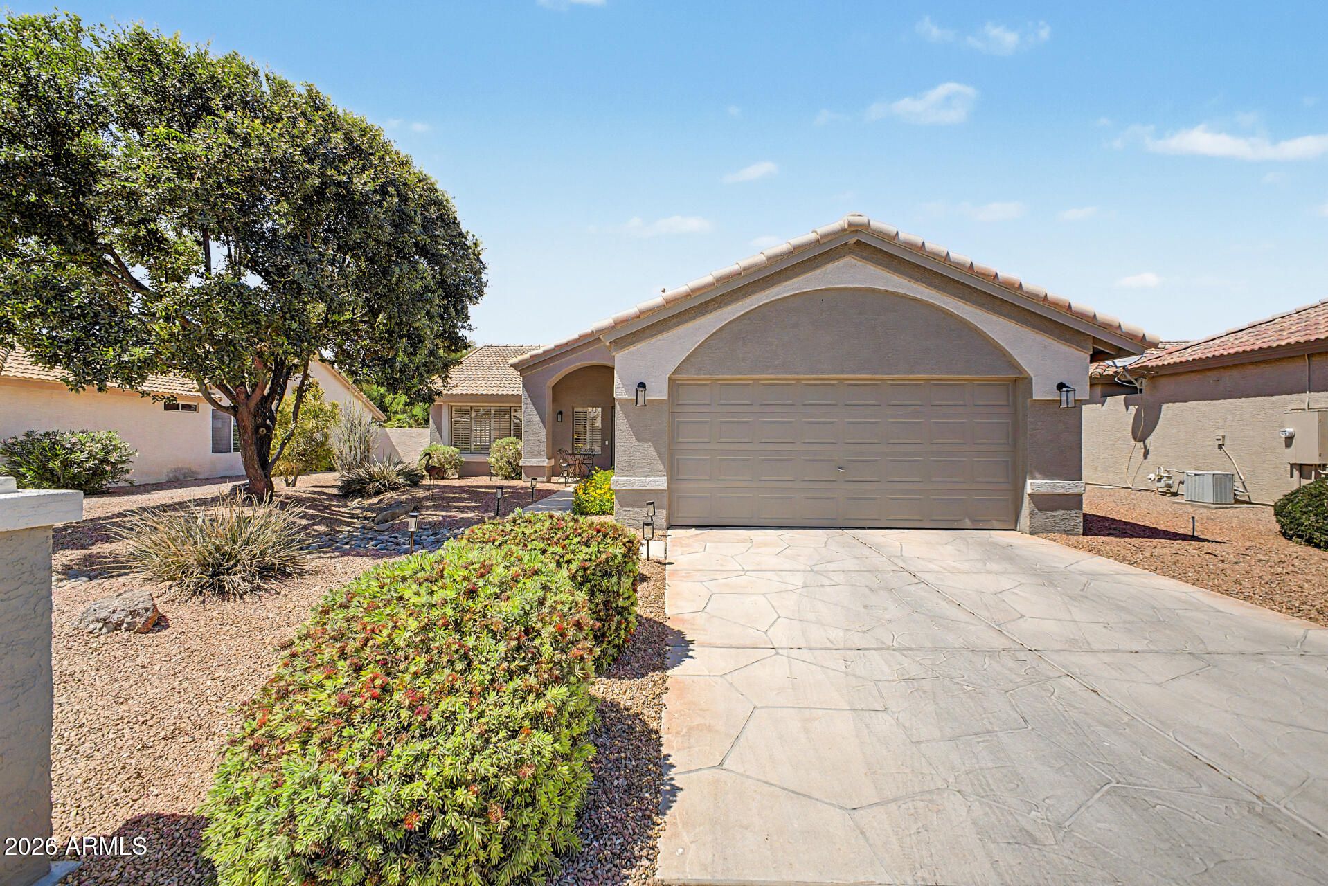 Starcrest is an immaculate, updated single-story Sun Lakes residence offering 2 bedrooms and 2 baths, along with a versatile master suite that includes its own private sitting room/office. Bright, open living spaces feature plantation shutters throughout, updated canned lighting, and modern fixtures, creating a warm, contemporary ambiance ideal for everyday living and entertaining. The fully remodeled master bath showcases contemporary finishes, an enlarged walk-in shower, upgraded tile and vanities, and modern hardware for a spa-like retreat, while the guest bath has been thoughtfully updated with a new vanity and toilet for added style. The kitchen includes granite countertops, a stainless steel refrigerator, a new dishwasher (2025), a new garbage disposal (2025), and abundant cabinetry. Additional interior upgrades include carpet and wood-look tile and raised-panel interior doors. Major system and exterior improvements provide peace of mind, including a roof replacement in 2021, new exterior paint in 2024 and a water softener installed in 2016. Sliding glass door leads to a low-maintenance backyard with a covered patio, making outdoor living effortless. The home's location offers close proximity to Sun Lakes amenities such as golf courses, pools, walking paths, pickleball courts, clubhouses and restaurants. Move-in ready with tasteful updates throughout, this home is the perfect blend of comfort, style, and low-maintenance living.