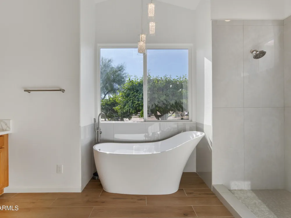 Welcome to your dream home in the highly sought-after IronOaks community of Sun Lakes. This beautifully remodeled 3-bedroom, 2-bathroom residence sits on a prime golf course lot with breathtaking views of the Oakwood Golf Course and tranquil water, offering great opportunities to take in the afternoon sunsets. Step into an open concept living area with soaring vaulted ceilings that create a bright and spacious atmosphere. The primary suite is a true retreat, featuring a one-of-a-kind, double walk-in closets and a luxurious spa-like bathroom with a dramatic shower and stand-alone bathtub with chandelier overhead. Two additional bedrooms offer generous space, ample storage, and abundant natural light, perfect for guests or a home office. The backyard oasis is designed for both