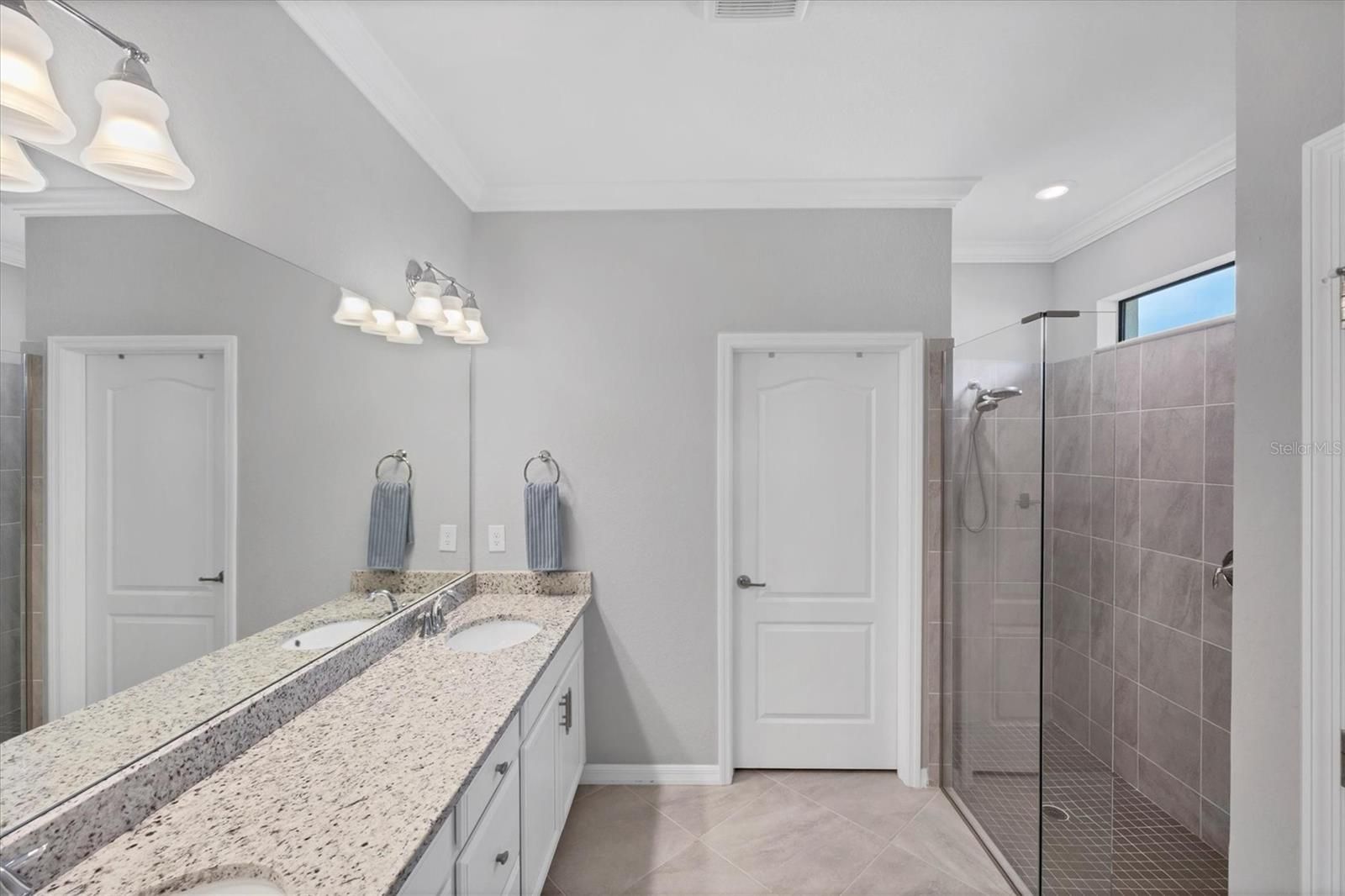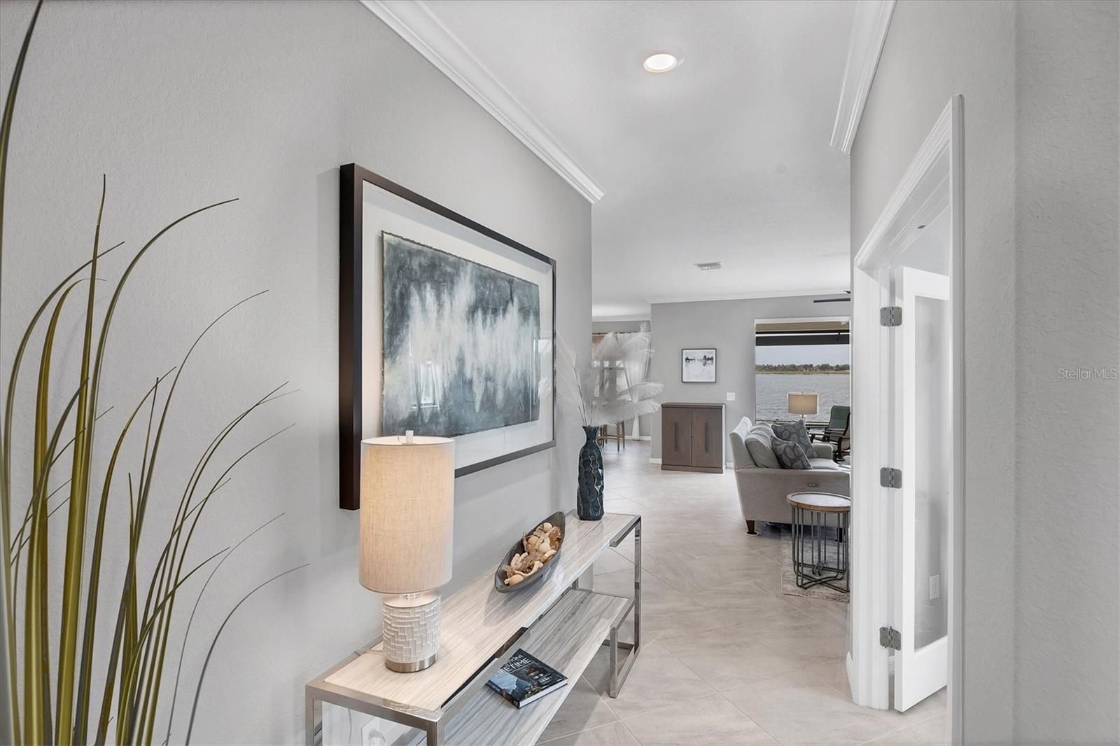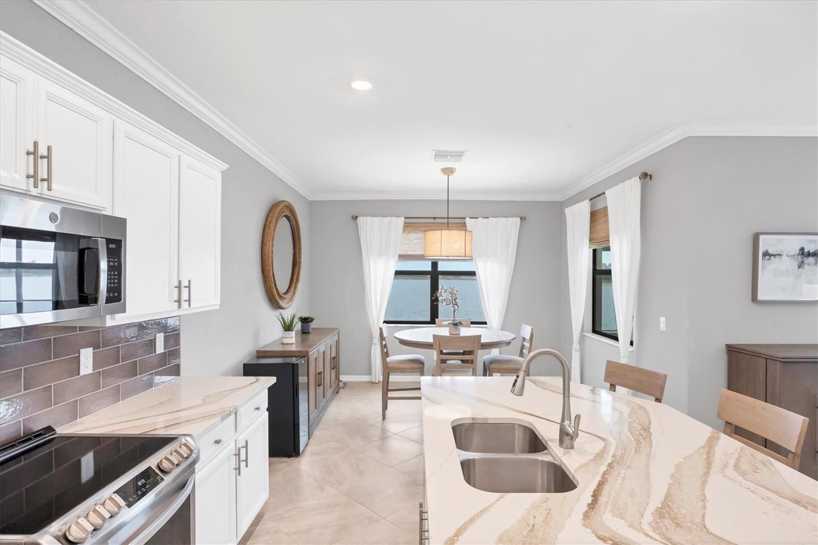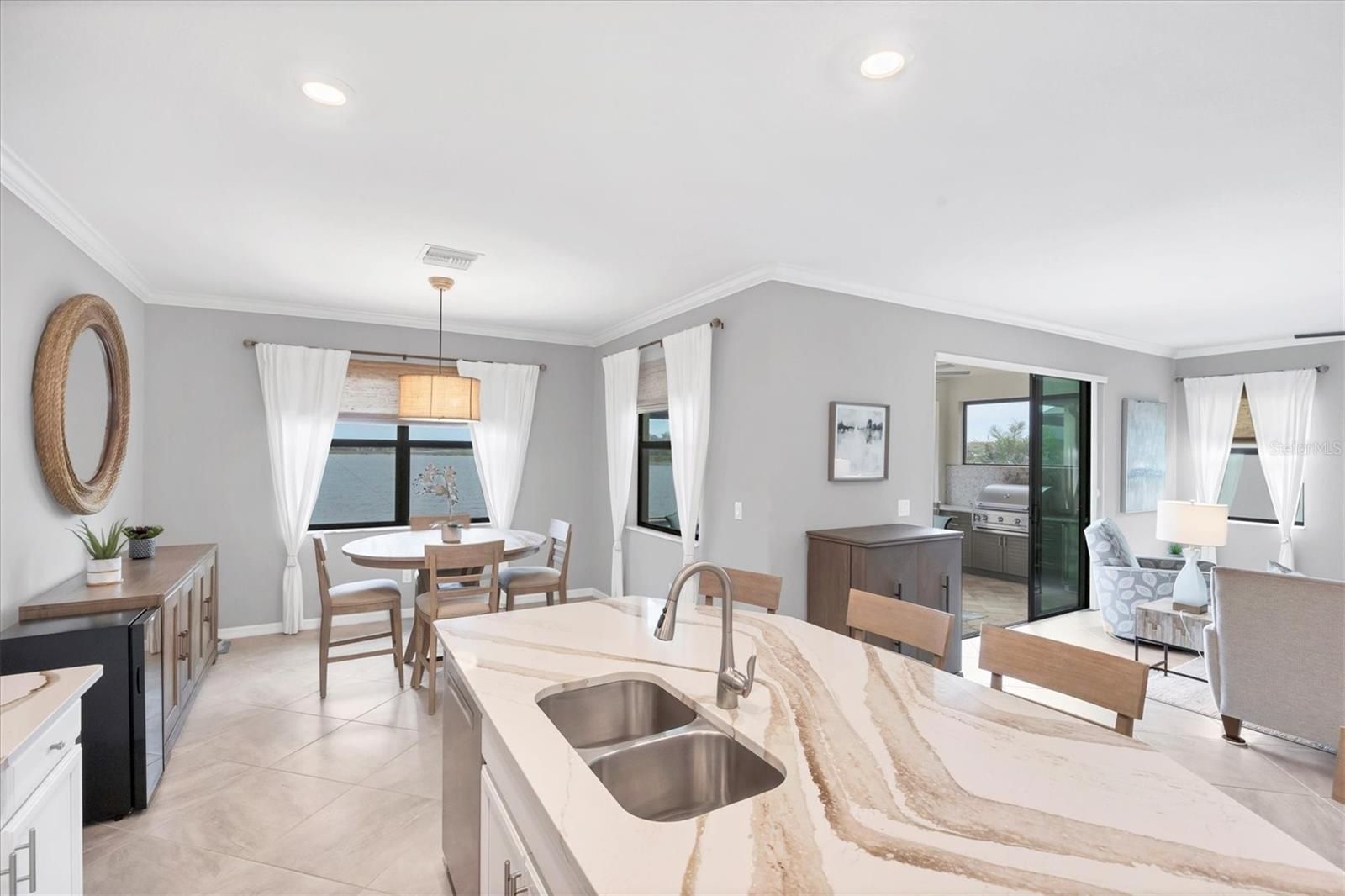 BEYOND COMPARE. This GORGEOUS home should definitely be on your list to see! JUST THE RIGHT SIZE, the popular Roma floor plan offers 2BD/2BA/DEN/2CG. AND, You know what they say, LOCATION, LOCATION. This home has one of the most EXPANSIVE LAKE VIEWS in the community. Open floor plan with kitchen, living room, and dining area flowing together for functionality and elegantly designed. Gourmet kitchen offers new QUARTZ counter tops, 42 inch cabinetry, STAINLESS STEEL appliances (new stove, new BOSCH dishwasher), and SUBWAY TILE BACKSPLASH. STUNNING PORCELAIN TILE flooring runs throughout the villa. CROWN MOLDING. PLANTATION SHUTTERS. Step out on to your lanai and enjoy the peaceful tranquility that THE VIEW creates. Enjoy MAJESTIC VIEWS through the PANORAMIC SCREEN. Enjoy floating in your own PRIVATE POOL and soothe your cares away in the HOT TUB. OUTDOOR KITCHEN IS CALLING THE CHEF'S NAME. Watch the outdoor TV while you wait for your cuisine. Back inside the spacious Master Bedroom has en suite bath offering dual sinks, walk in shower, Granite counters, and transom window for natural light. Plus a large walk in Custom Closet. Guest bedroom with custom closet also Guest bath has Granite counter top and shower/tub combo. Laundry room is a dream with cabinets, hanging rack, and wash sink. If you are looking for more active viewing sit on your SCREENED front lanai and soak up the Florida sun while you people watch. The 2 Car garage is a delight with Workbench and cabinet, Wall Organizers, 2 Overhead storage racks, Insulated Floor, and A/C. Garage Door is also insulated.Other notables include Water Filter System for Whole house, Widened Driveway by 3 ft, outdoor curbing surrounds Tropical landscaping. Sarasota National is a marvelous community with over 1300 acres designated for preservation, conservation, lakes, and open space with amazing views, Proclaimed as an Audubon International Certified Sanctuary, making it the most gorgeous and enjoyable golf course to play at in the area. Offering resort style amenities with huge resort style pool and spa,Tiki Bar to serve refreshing drinks and a bite of lunch, tennis courts, pickle ball, Bocce courts, coffee lounge/library/card room/meeting place, 7000 sq ft fitness facilities offering classes and day spa, and a 30,000 sq ft Clubhouse with dining and spectacular views. 18 Hole championship golf course surrounded by native wetlands and preserves provides an exhilarating and dramatic back drop for your golfing adventure. Minutes away from the new Wellen Park shopping area and Atlanta Braves stadium. Venice Beach and Venice Downtown are just a short drive. Your choice of restaurants and outdoor activities await. Come find YOUR Florida lifestyle TODAY and Live everyday like your on vacation!