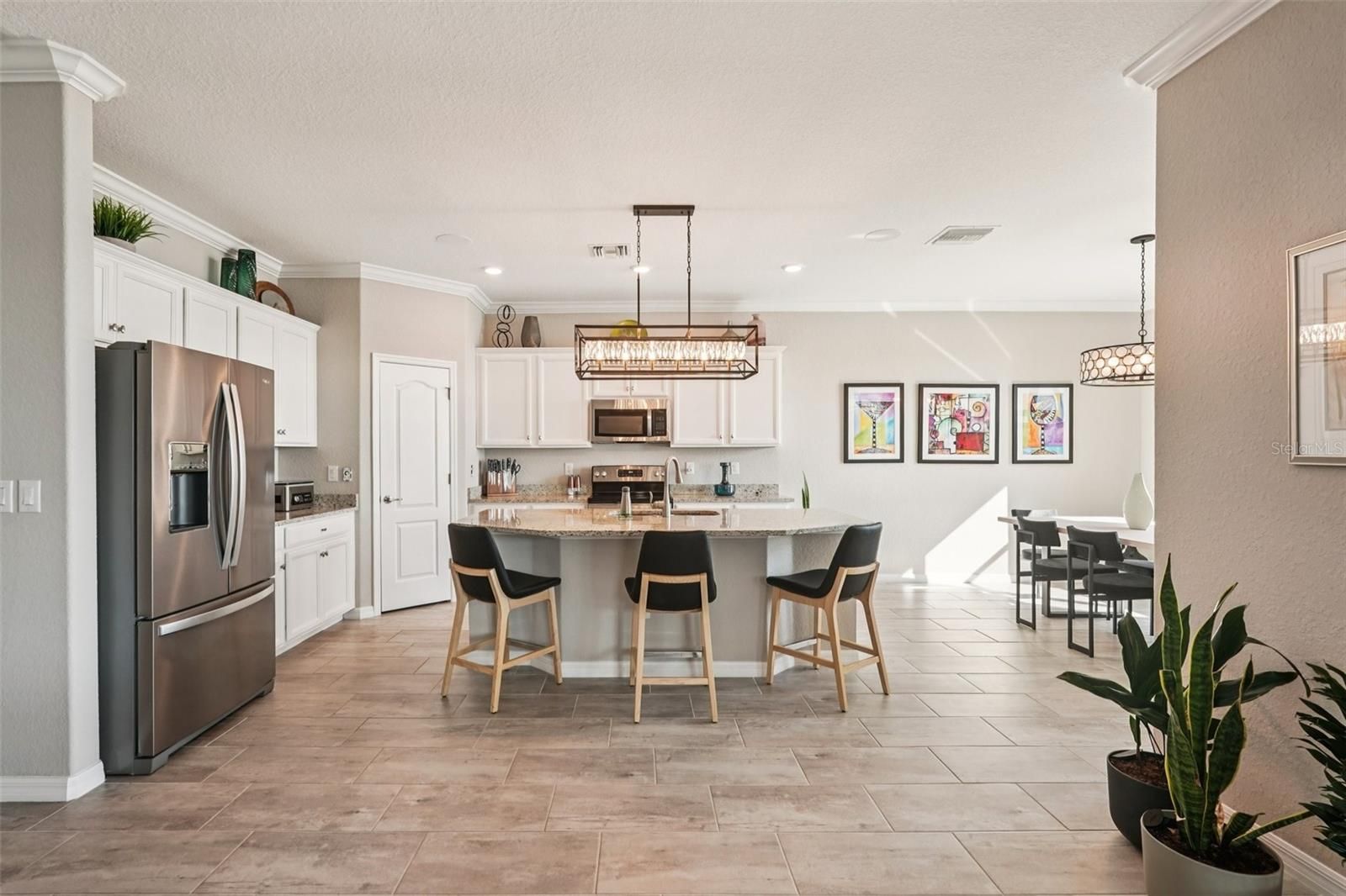 - Built-in Features, Ceiling Fan(s), Crown Molding, In-Wall Pest Control, Kitchen/Family Room Combo, Solid Surface Counters, Stone Counters, Walk-In Closet(s), Window Treatments