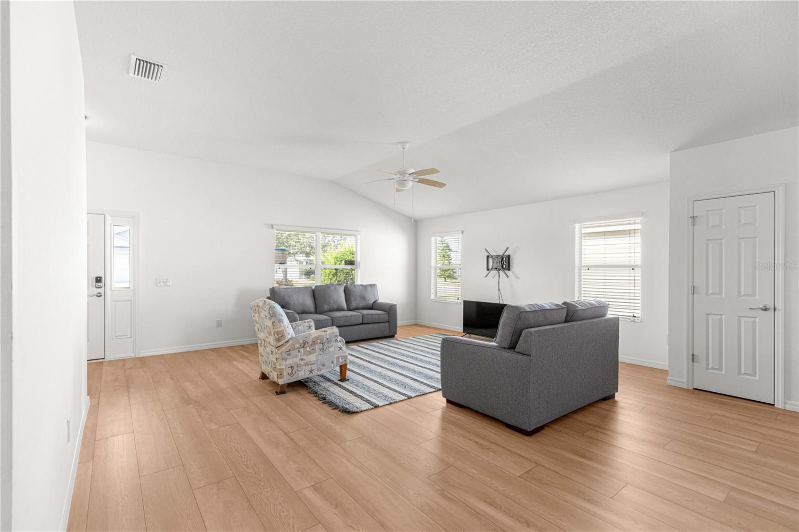 - Ceiling Fan(s), High Ceilings, Living/Dining Room, Open Floorplan, Main Level Primary, Thermostat, Window Treatments
