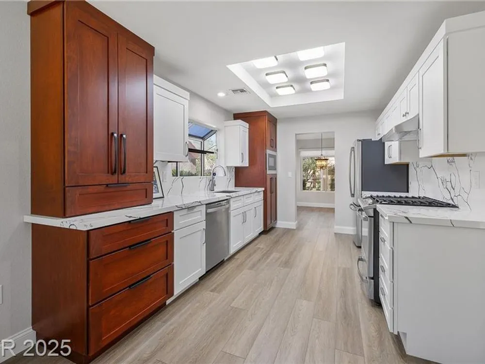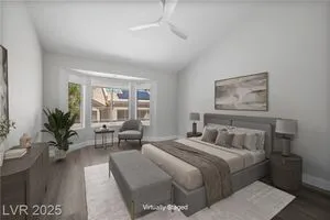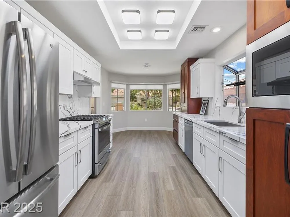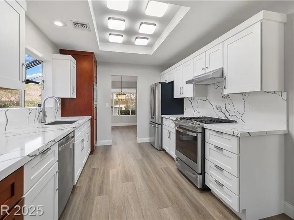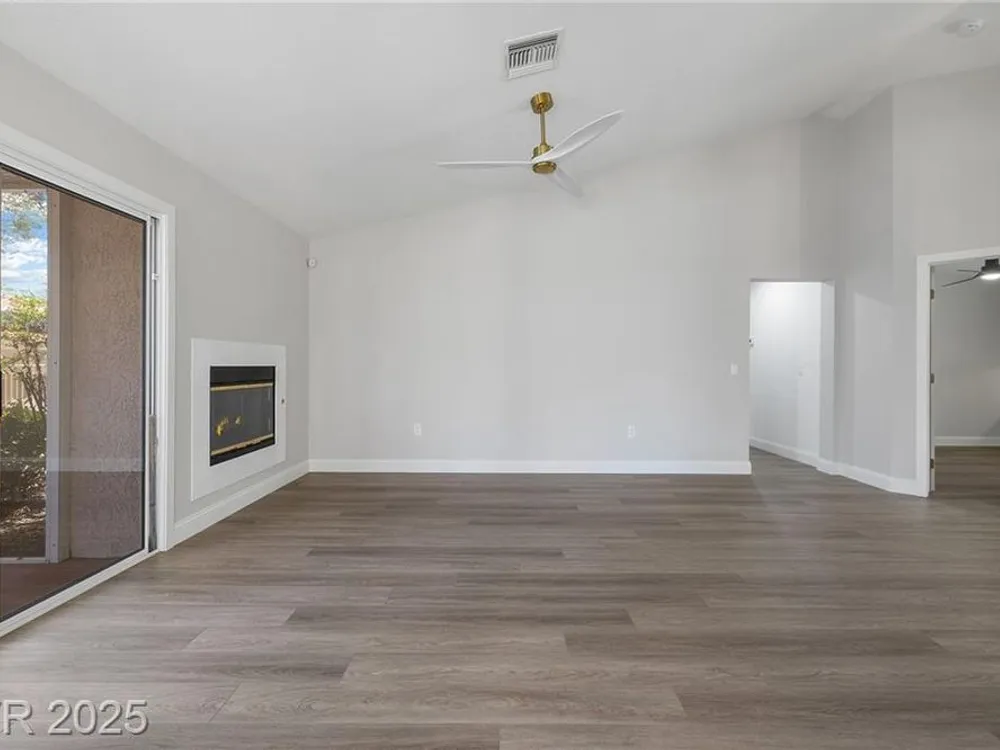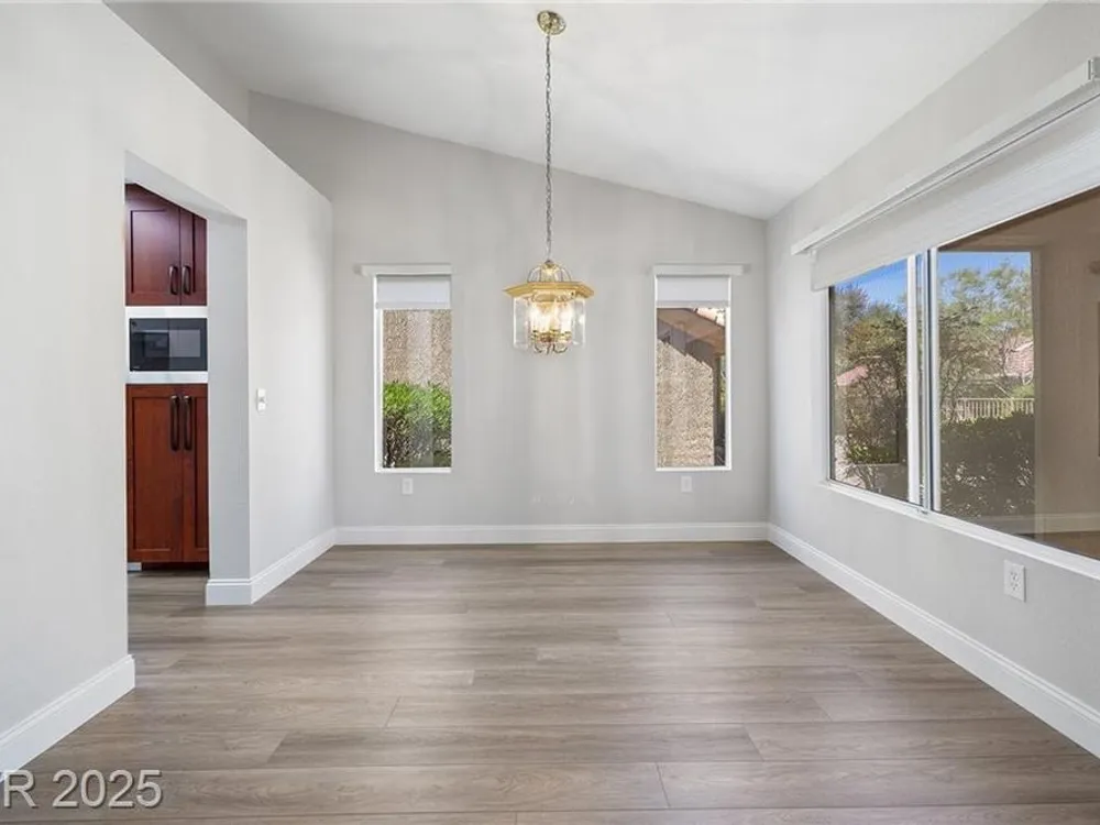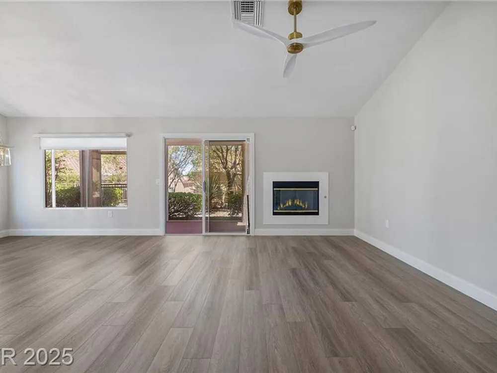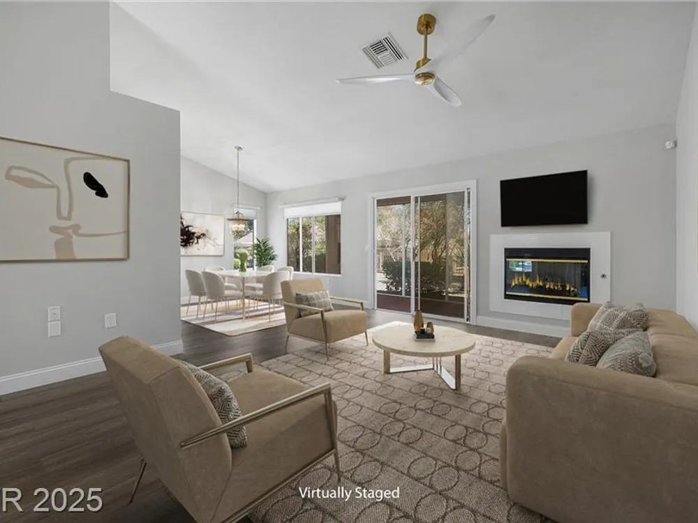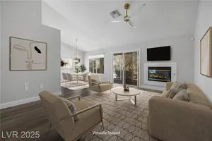 Freshly remodeled townhome in Sun City Summerlin ~ courtyard entry, 1359 SF, 2 bedrooms, 2 baths with an open main living area. Stylish neutral palate throughout ~ new paint, luxury vinyl plank flooring, baseboards and custom millwork touches truly set this home apart. Stunning kitchen with eating nook, custom two toned cabinetry, Quartz counters & SS appliances. Spacious living room features fireplace with custom surround and adjacent dining room with slider, providing views to the screened in back patio and backyard. Primary suite has vaulted ceiling, bay window, walk in closet with mirrored doors and en suite bath. Primary bath has dual sinks, updated shower with 3/4" glass front & Toto toilet. Second bedroom is currently used as an office/den & features a built in desk which can easily be converted back to a closet. AC replaced Dec 2022, remodel 2023, loads of storage in garage featuring cabinets, shelves and loft storage!
