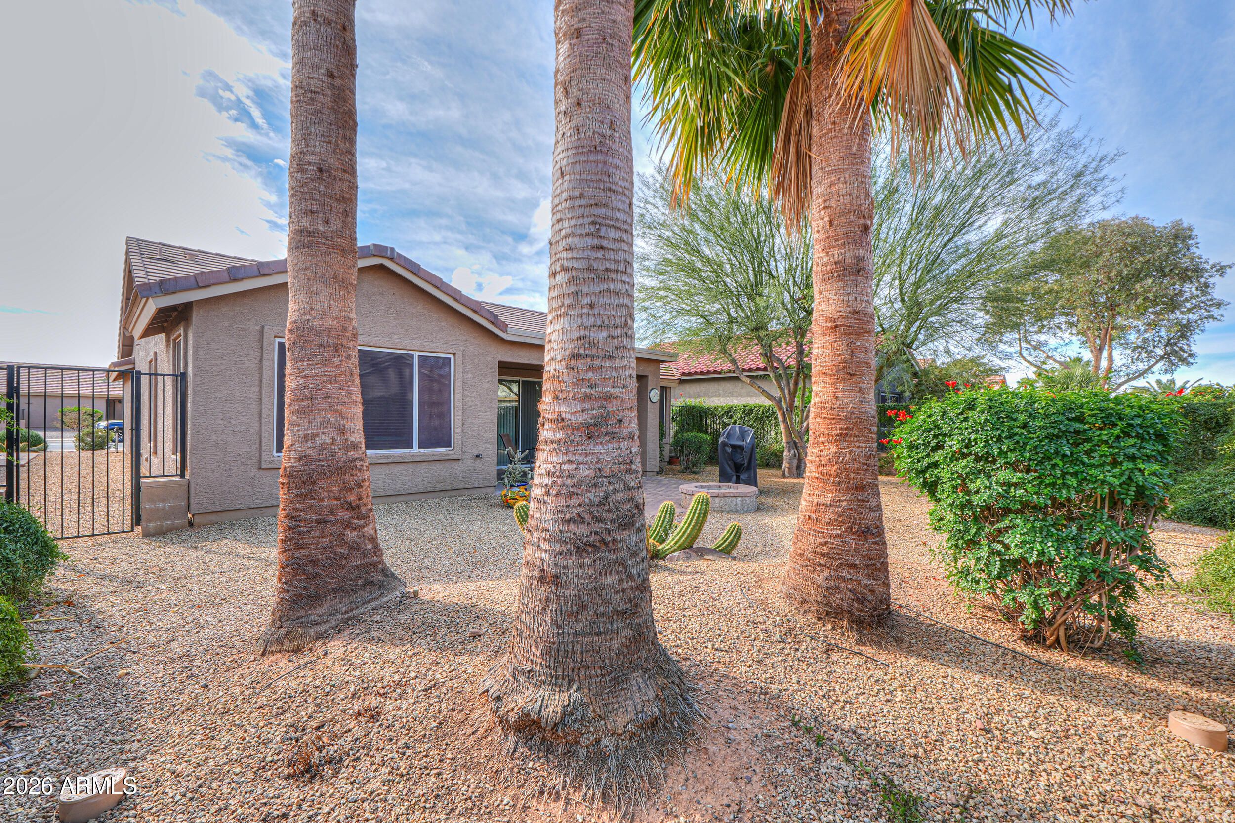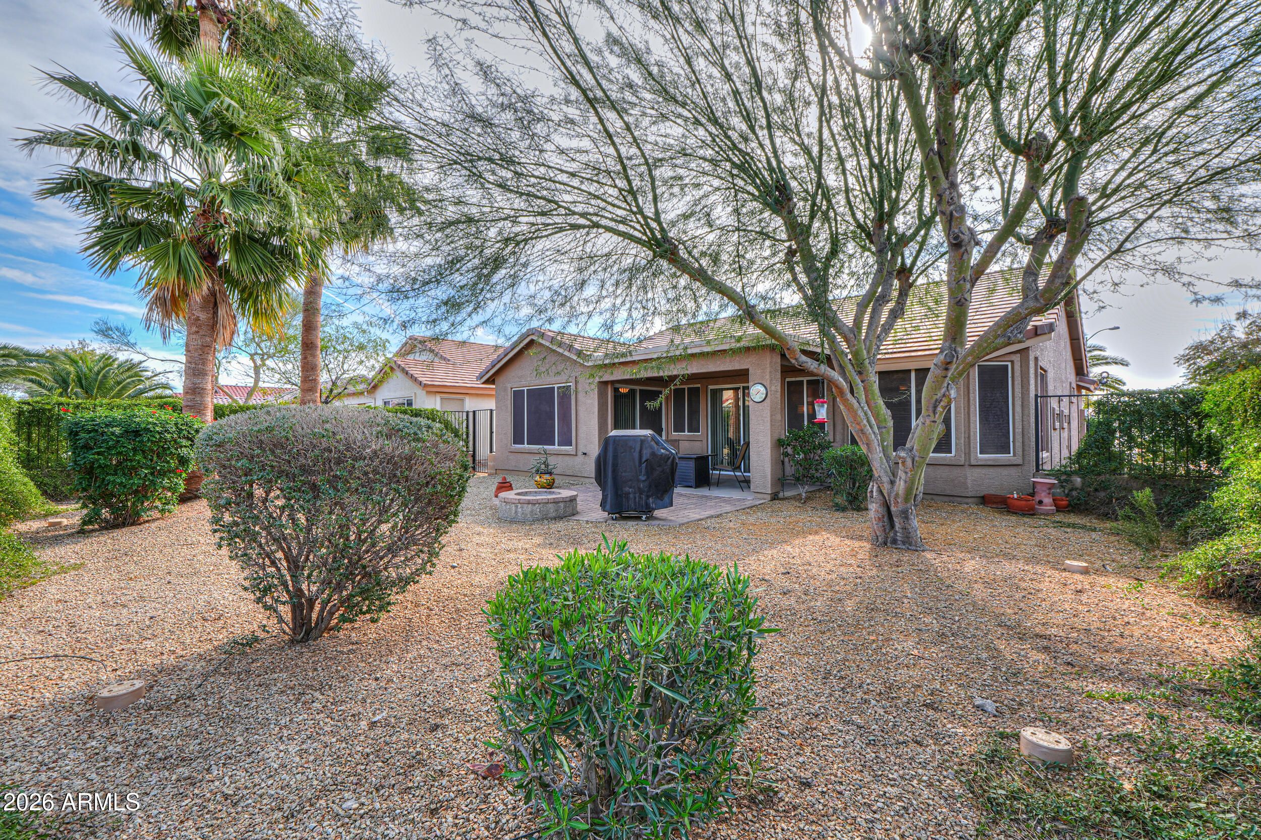 This beautiful 2 bedroom, 2 bathroom home is located in the desirable Mission Royale Active Adult community and comes fully furnished, making it move-in ready. The home features a split floorplan for added privacy, with tile flooring throughout and cozy carpet in the bedrooms. Vaulted ceilings and recessed lighting create a bright, open feel, while the north-south exposure helps keep the home comfortable year-round. The kitchen offers granite countertops, reverse osmosis, and a water softener for added convenience. Step outside to enjoy the extended paver patio, complete with a fire pit, mature trees, and well-maintained landscaping. The backyard is fenced for extra privacy—perfect for relaxing or entertaining.