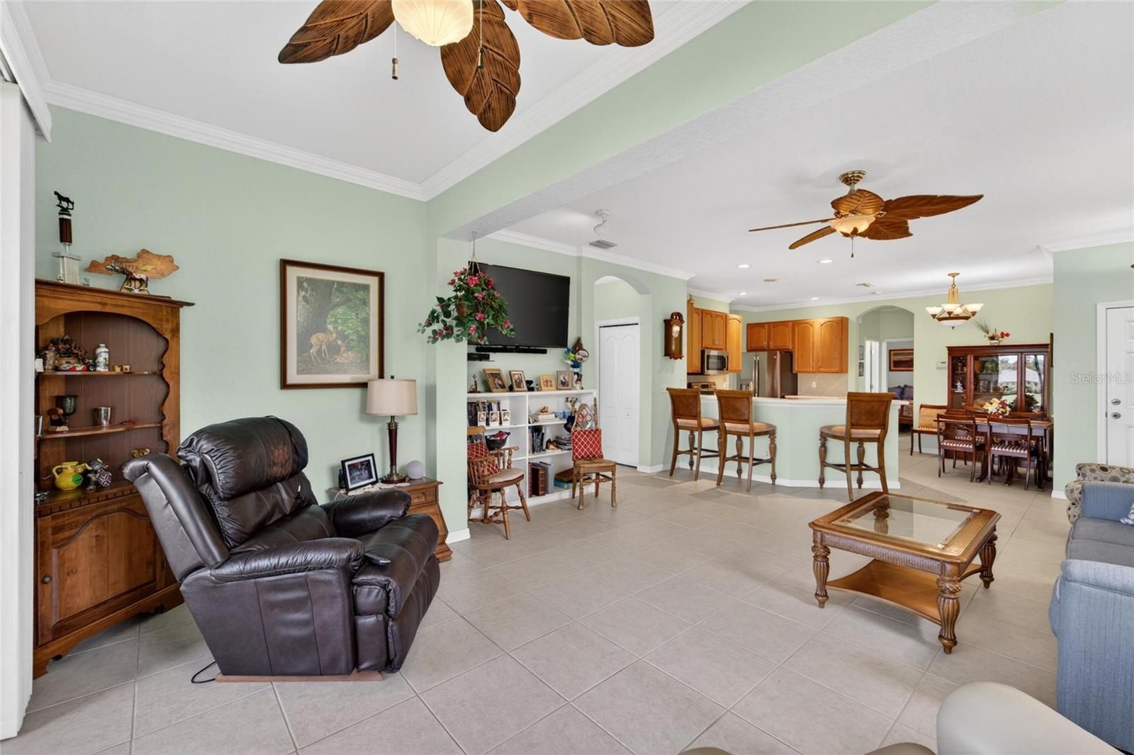 This beautifully updated 3-bedroom, 2-bath condo offers 1,425 square feet of comfortable, turn-key furnished living space in the 55+ active-living, gated community of Kings Point. Perfectly positioned with serene golf course and water views, this home delivers the ideal blend of elegance, functionality, and Florida lifestyle. You'll be greeted by high ceilings accented with 6-inch crown molding, and a bright and refined atmosphere throughout. The spacious living area features tinted triple sliding glass doors that open to a lanai with a breathtaking view that floods the home with natural light, while offering privacy and energy efficiency. The kitchen is both stylish and functional, showcasing 42-inch hardwood cabinetry with soft-close features, GE appliances, a French door refrigerator, granite countertops, backsplash and a large breakfast bar Retreat to the primary suite, complete with a walk-in closet featuring custom built-ins and an updated en-suite bath with a granite vanity and stylish walk-in shower. Both bathrooms have been tastefully upgraded, offering a modern, high-end feel. Additional highlights include gorgeous custom fans and designer lighting, natural gas for heat, hot water, and the dryer (the electric stove has gas hookups available), An extra refrigerator in the garage, sola tubes for enhanced natural light and the beautiful furnishings and decor are included. They feature a 65-inch big screen TV with a custom designed wood bar in the living room. This home is truly move-in ready and offers exceptional value in a resort-style community. Residents of Kings Point enjoy world-class amenities that include two spectacular clubhouses, six heated pools, hot tubs, fitness centers, golf courses, tennis, pickleball, billiards, an 850-seat theater, the full-service Serenity Spa and countless clubs and social events—all within a secure, gated community offering 24/7 manned security. Free paramedic and ambulatory services, and condo fees that cover high-speed internet, premium cable, all landscaping, exterior building maintenance and insurance, pest control, roof, water, sewer, trash and much lower taxes and insurance than single family home living. With a free transportation system, golf-cart access to shopping, dining and everything you could possibly need in Sun City Center's self-contained community, you'll be in close proximity to Florida’s top attractions including an assortment of world-class beaches, Disney World, Busch Gardens, and Tampa’s convenient cruise port. This exquisite home offers the ultimate in luxury, lifestyle, and peace of mind—an exceptional opportunity to experience resort-style living at its finest. Schedule a tour today and start living the Kings Point lifestyle.