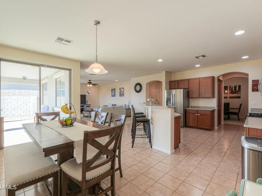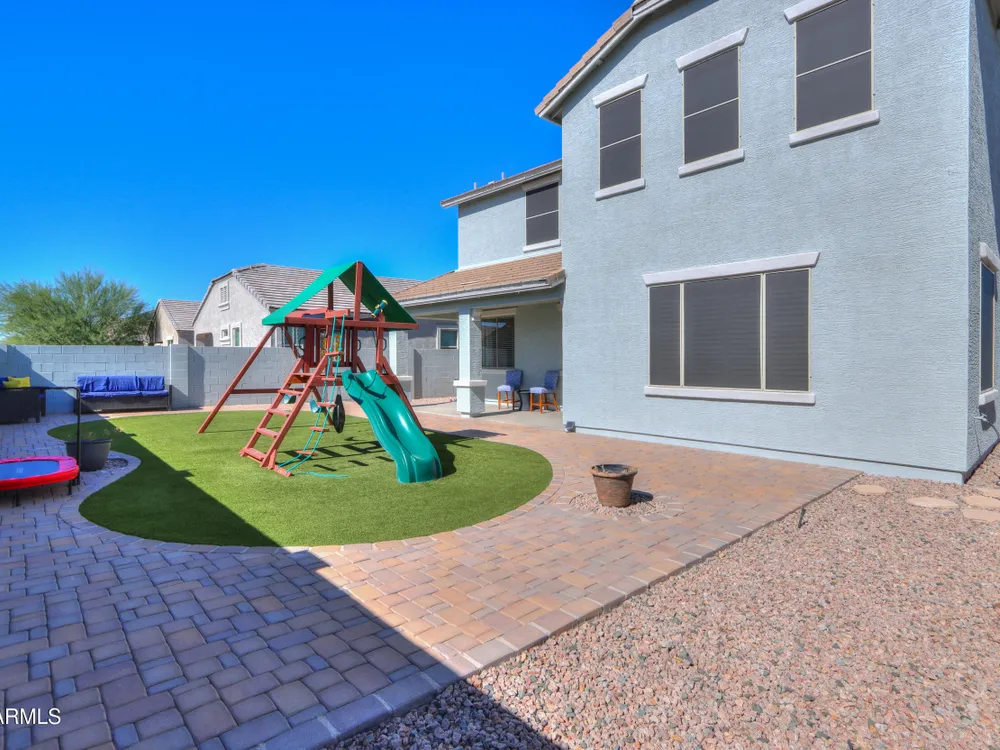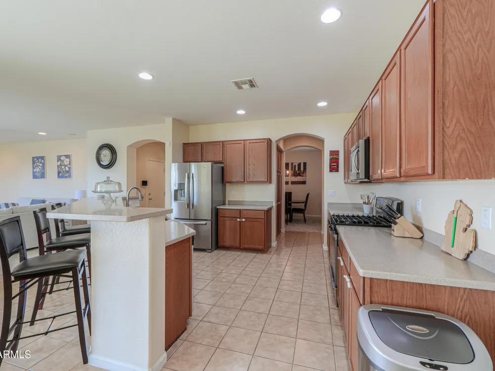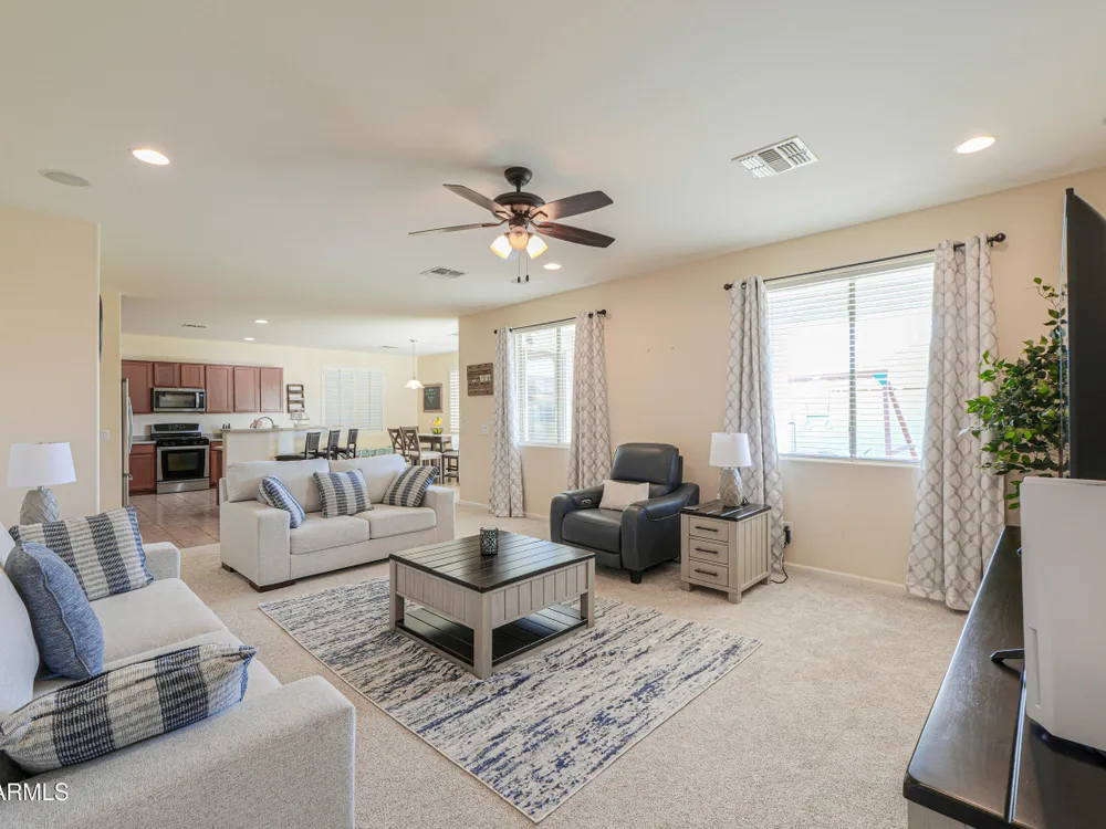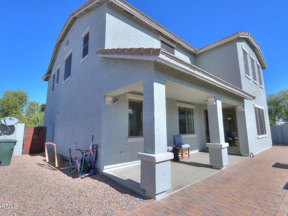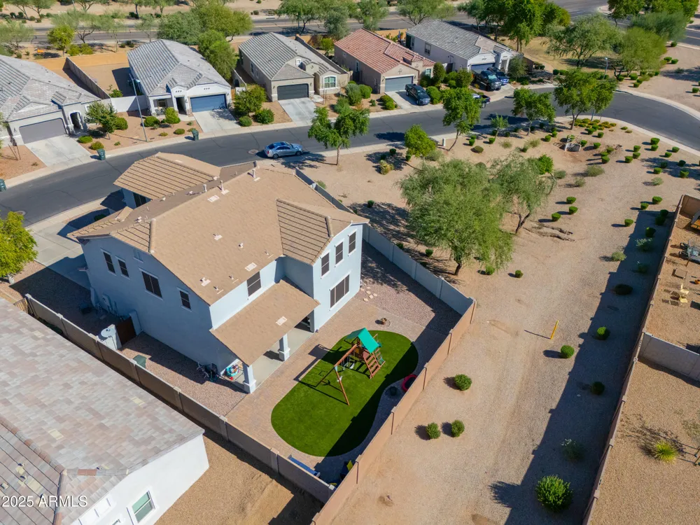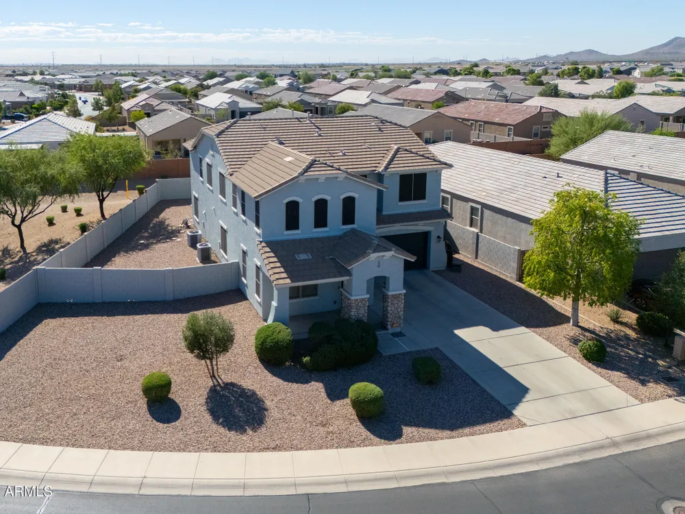 Step into this stunning Casa Grande residence, ideally positioned on a corner lot next to a serene park-like common area. This beautifully maintained home boasts an expansive open-concept layout featuring 4 generously sized bedrooms, 2.5 bathrooms, and soaring ceilings that create a bright, airy atmosphere. The kitchen is a chef's dream, complete quartz countertops, island with breakfast bar, sleek SS appliances, & elegant pendant lighting. The luxurious primary suite offers bathroom with dual vanities, a soaking tub, shower, & a spacious walk-in closet. Upstairs, a versatile loft provides a living space alongside well-appointed bedrooms. Outside, enjoy entertaining or quiet relaxation under a covered patio. Located in a vibrant community w/resort style amenities w/pool & kids area.