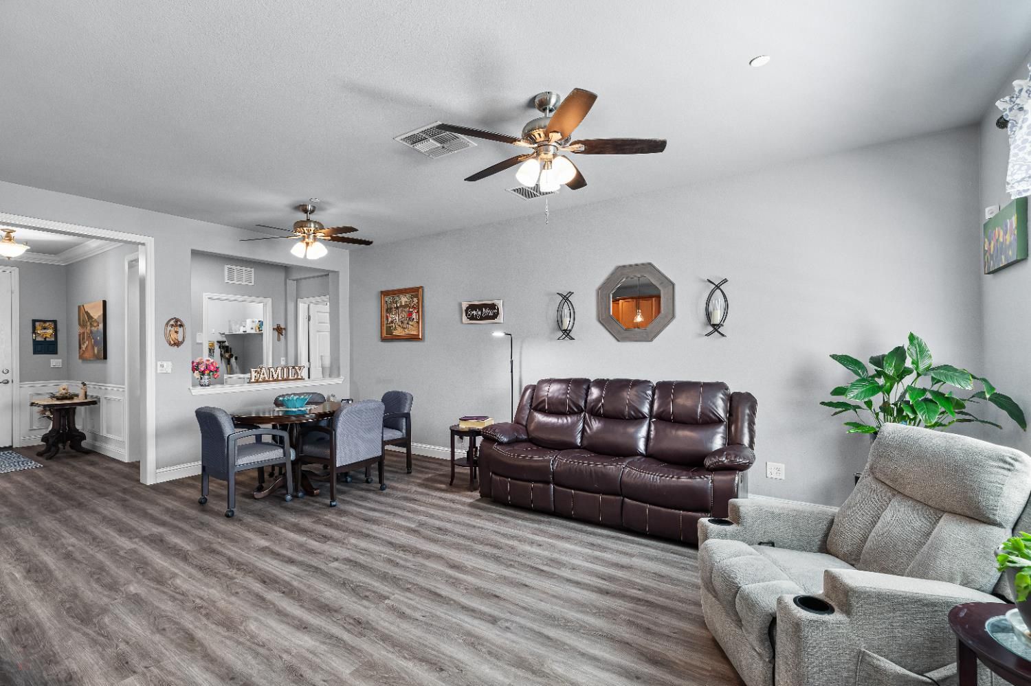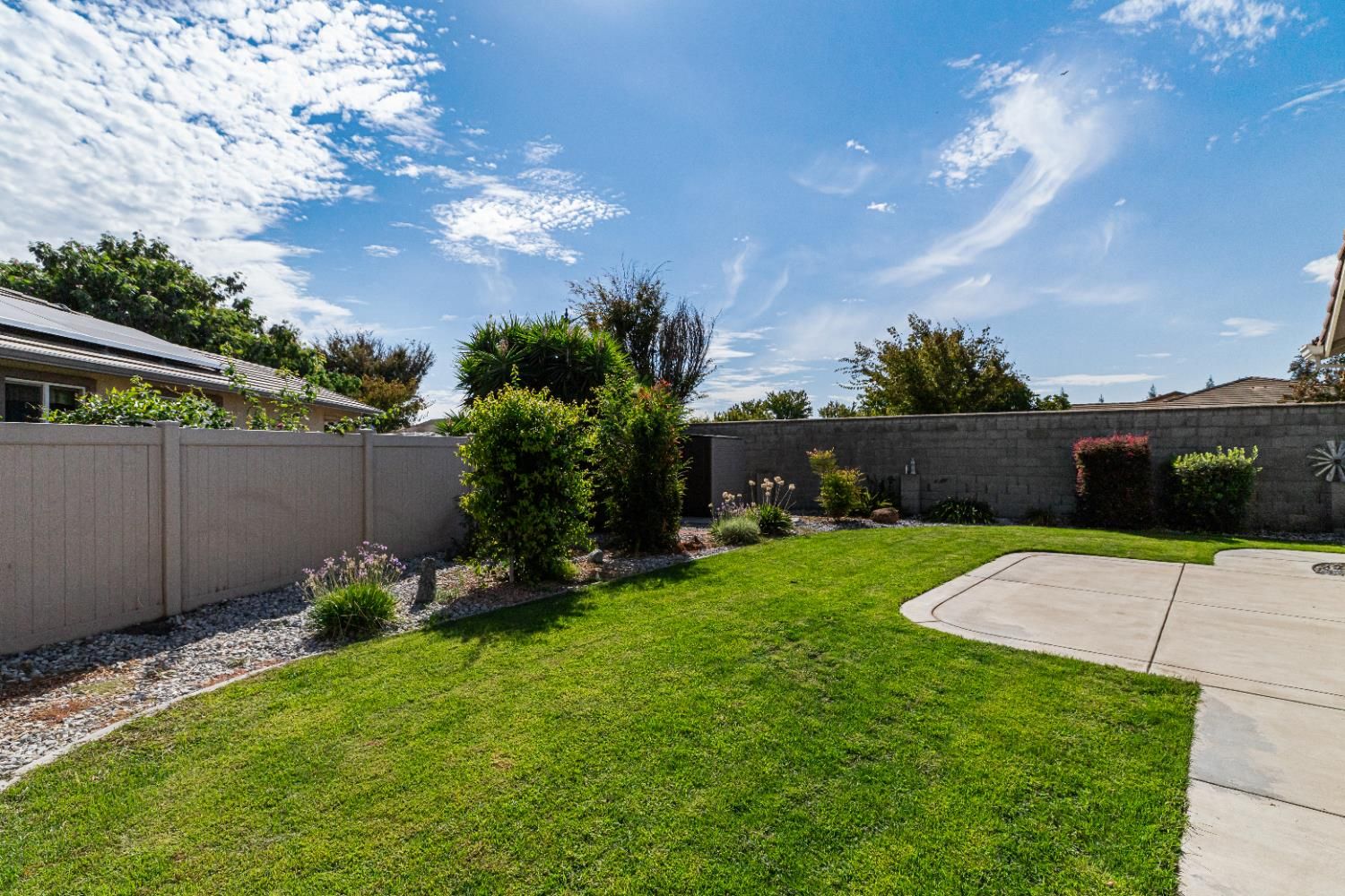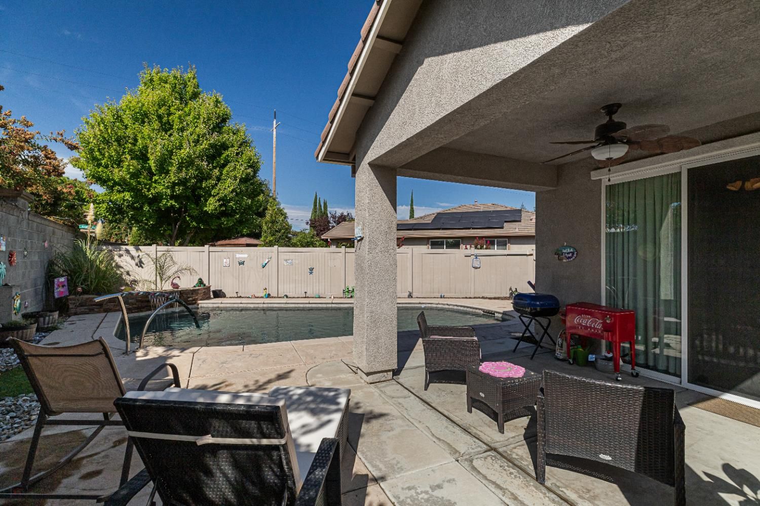 Charming Harpswell model with a pool & large lot!! End of cul-de-sac pie-shaped lot (7,694 sf) with inground Pebbletech pool, sheer descent waterfall with stacked-stone face, covered patio with lighted ceiling fan, big sideyard with 2nd patio & shed, 5-panel paid-for solar system is for the pool only, house has new LVP flooring, whole house fan, entry has wainscotting & crown molding, kitchen features stone counters, gas cooktop, SS fridge stays, island with stainless sink, breakfast bar & 2 pendant lights and tile floor, primary bedroom includes walk-in closet, 2 sinks, no-lip (roll-in) shower with bench seat & tile floor, finished & painted garage with opener and wire shelving. Come take a look at this sharp home!! Woodbridge is a 55+ active adult community with a clubhouse, pool, softball field, putting green, tennis court, pickle ball courts & much more.