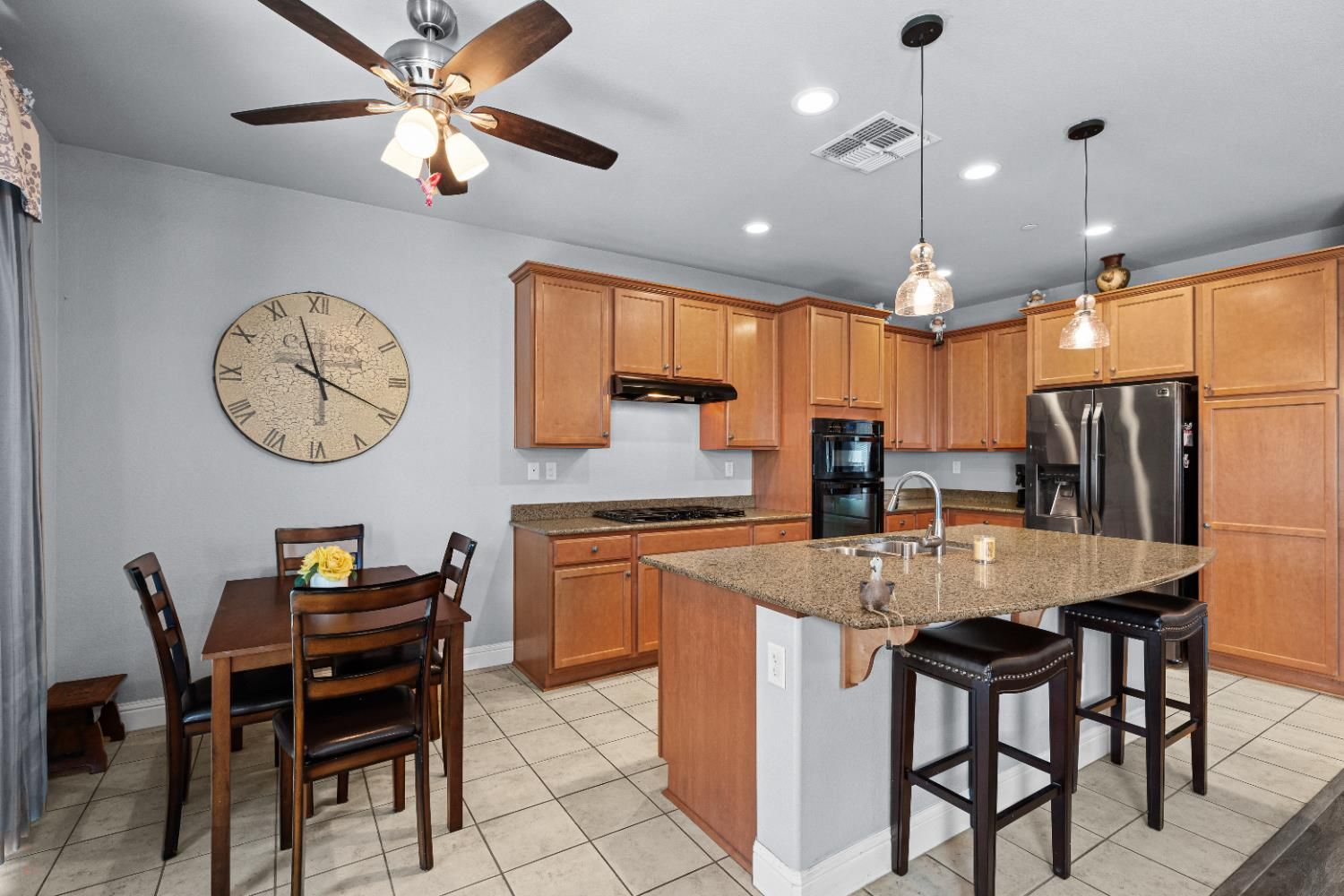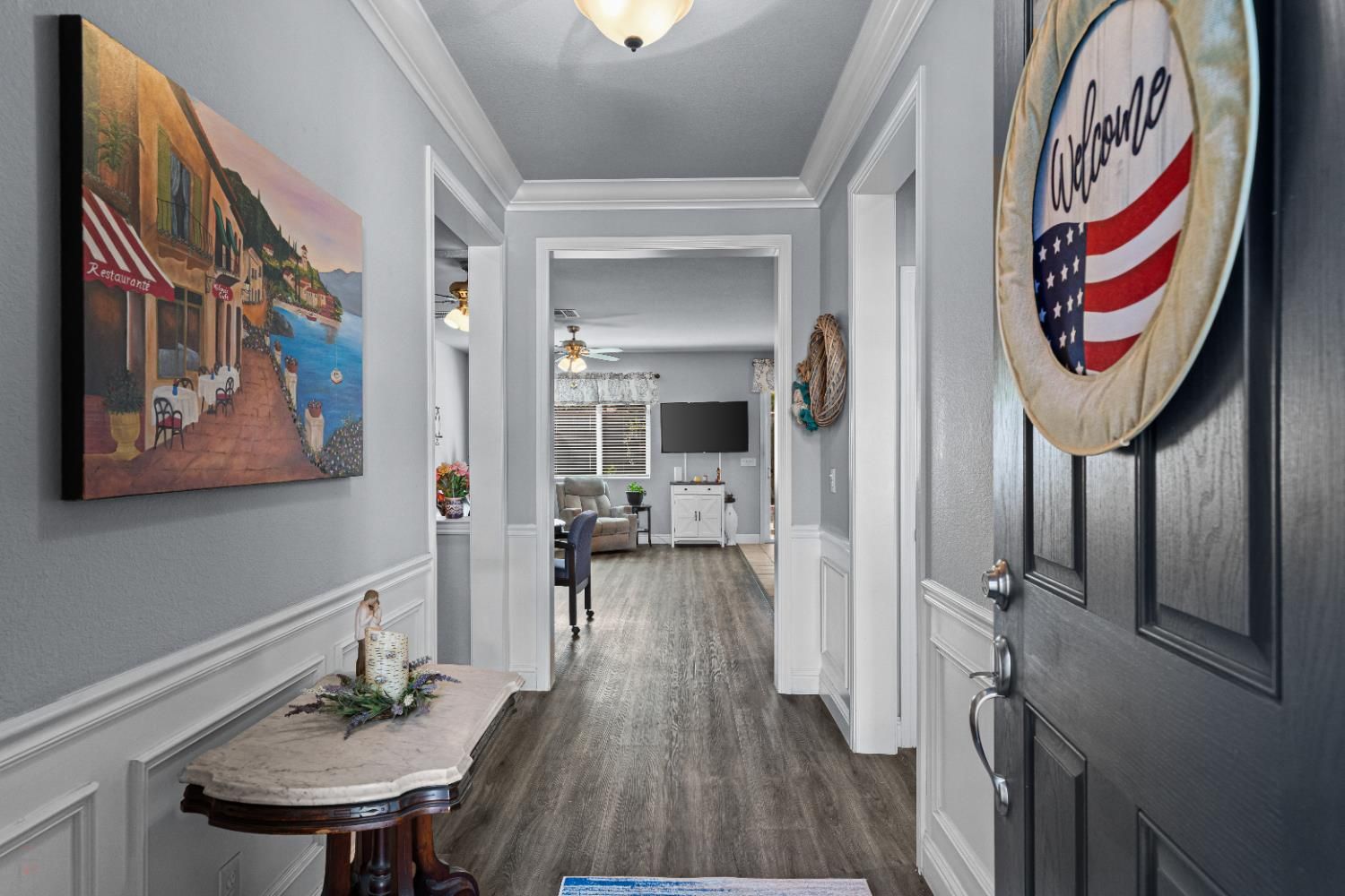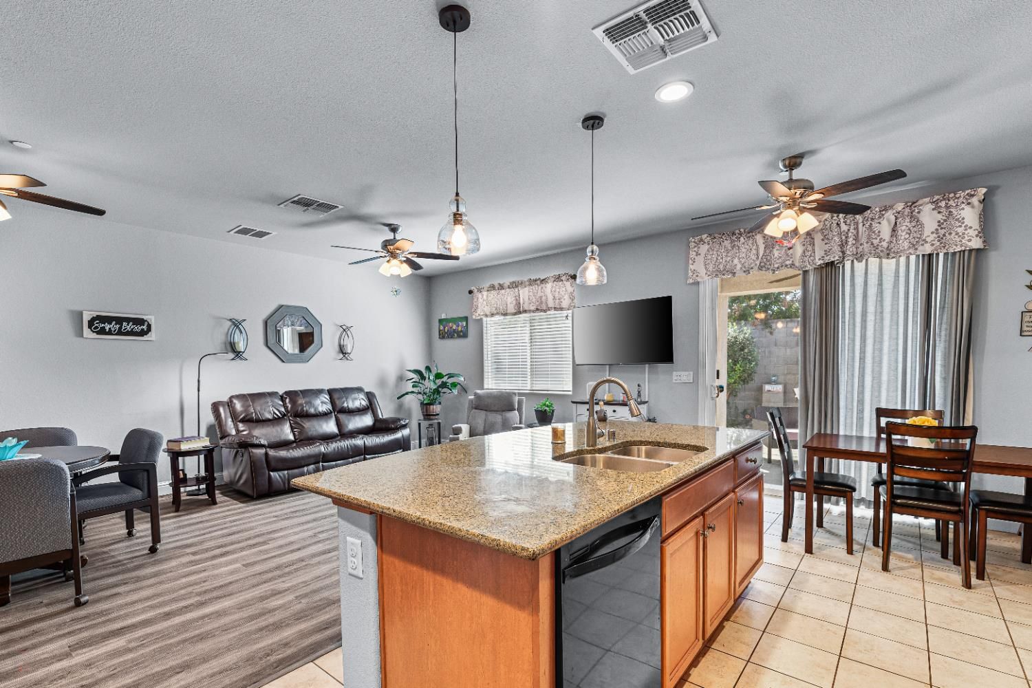 Charming Harpswell model with a pool & large lot!! End of cul-de-sac pie-shaped lot (7,694 sf) with inground Pebbletech pool, sheer descent waterfall with stacked-stone face, covered patio with lighted ceiling fan, big sideyard with 2nd patio & shed, 5-panel paid-for solar system is for the pool only, house has new LVP flooring, whole house fan, entry has wainscotting & crown molding, kitchen features stone counters, gas cooktop, SS fridge stays, island with stainless sink, breakfast bar & 2 pendant lights and tile floor, primary bedroom includes walk-in closet, 2 sinks, no-lip (roll-in) shower with bench seat & tile floor, finished & painted garage with opener and wire shelving. Come take a look at this sharp home!! Woodbridge is a 55+ active adult community with a clubhouse, pool, softball field, putting green, tennis court, pickle ball courts & much more.