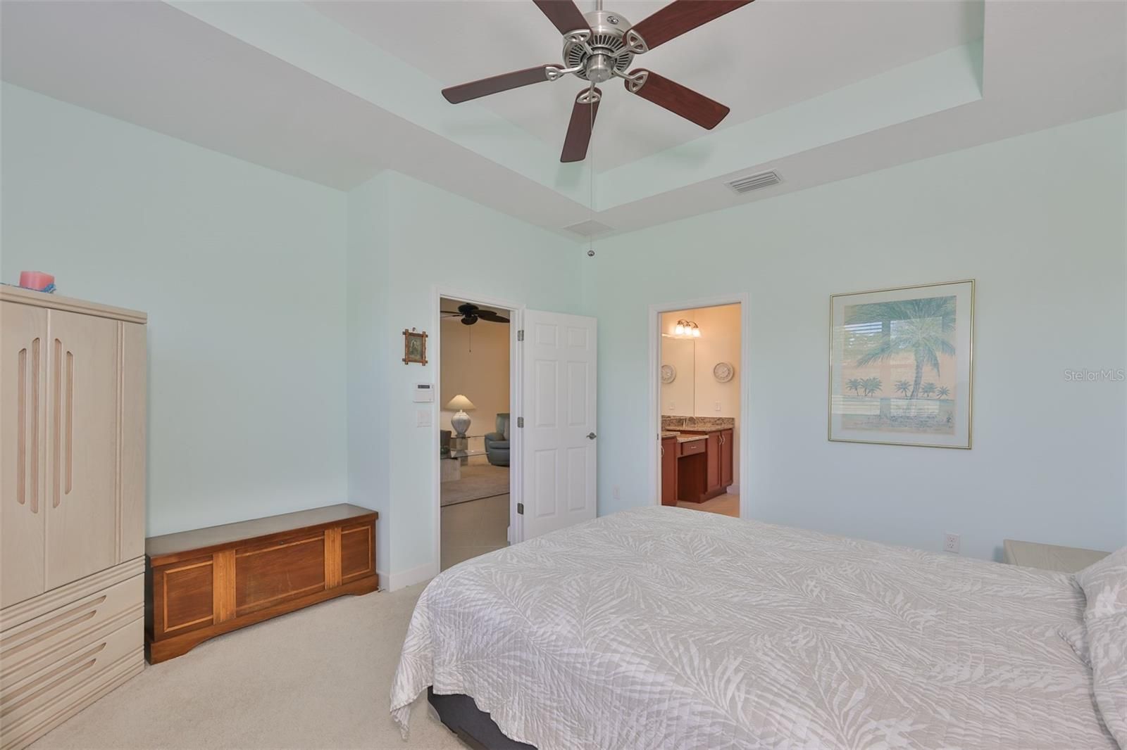 - Eat-in Kitchen, High Ceilings, Kitchen/Family Room Combo, Living/Dining Room, Main Level Primary, Solid-Wood Cabinets, Split Bedrooms, Stone Counters, Thermostat, Tray Ceiling(s), Walk-In Closet(s), Window Treatments