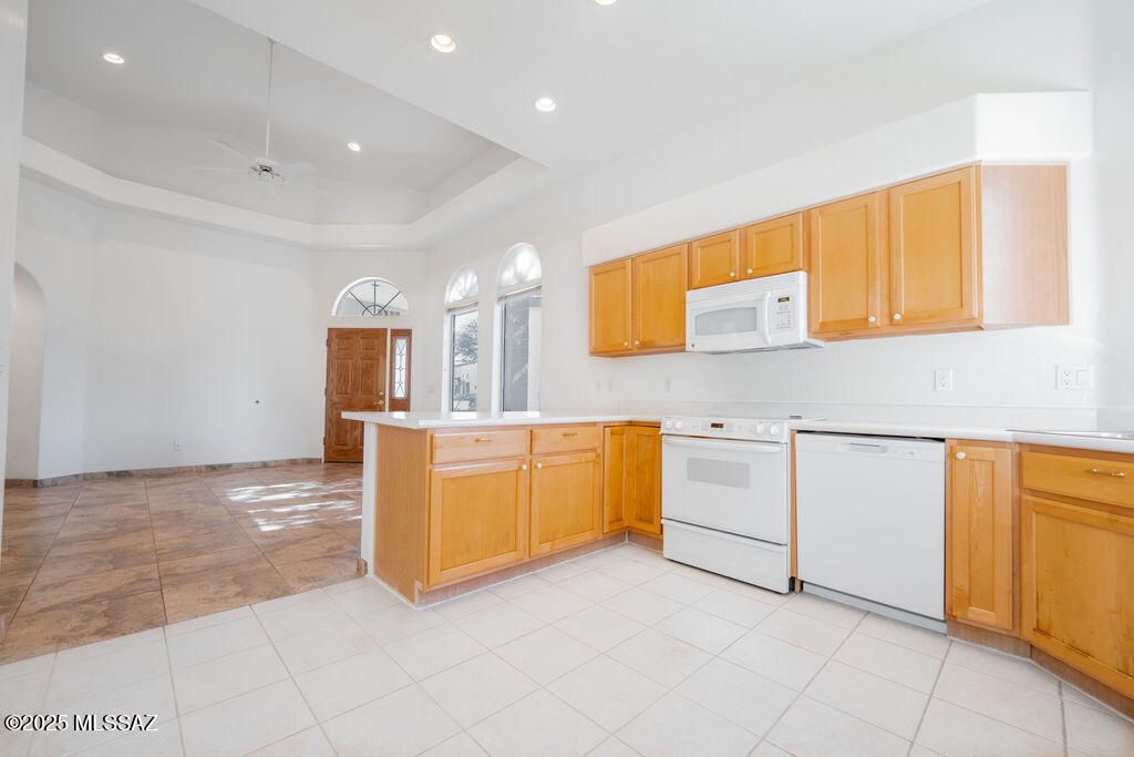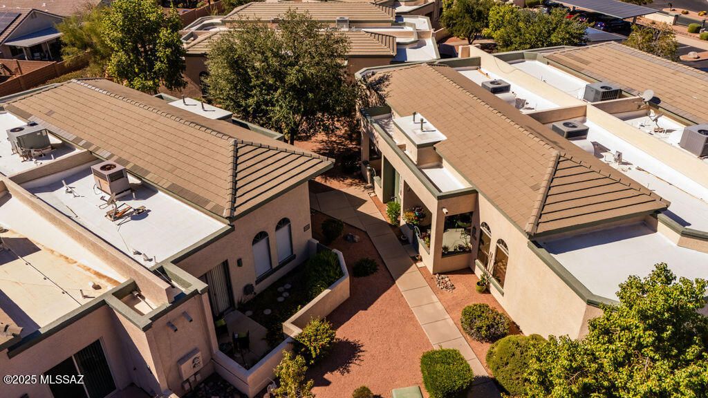 Welcome to this charming 2-bedroom, 2-bath townhome located in the gated Mona Lisa Village community in Northwest Tucson. This single-level home features an open and practical floor plan with tile throughout. You'll have peace of mind with a new roof and water heater. The kitchen includes ample counter space and cabinetry, flowing easily into the dining and living areas for comfortable everyday living. The spacious primary suite offers a full bath and generous closet space, while the second bedroom provides flexibility for guests or a home office. Enjoy two private covered patios ideal for relaxing outdoors. Community amenities include a pool, spa, and beautifully maintained grounds. Conveniently located near shopping, dining, and medical services, this home offers low-maintenance living
